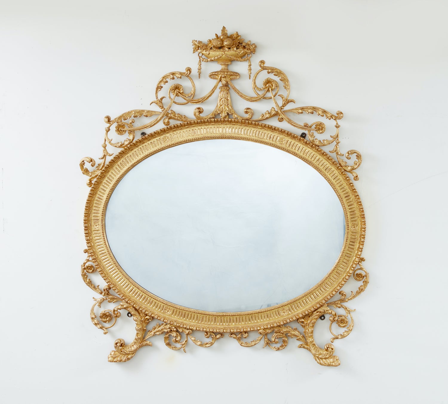 A very finely carved oval neoclassical overmantel looking glass, the frame carved with a bead and flutes interspersed with incised floral rosettes and bordered with a diminutive egg and dart, with carved floral enrichments of leaves, drapes, flowers and rocaille in the form of scrolls capped with a vase filled with fruit and flowers. Regilded and with a modern plate glass. Circa 1785 Ht.55”, Width 46”