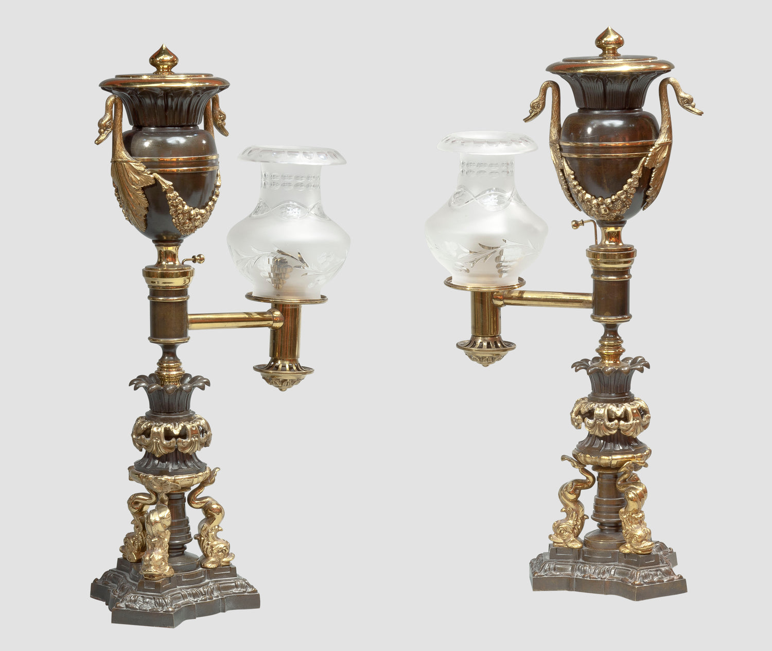 A very fine and highly decorated pair of Argand lamps made by Messenger and Co. of Birmingham made of bronze and polished brass circa 1825. Ht. 21" W. 12"