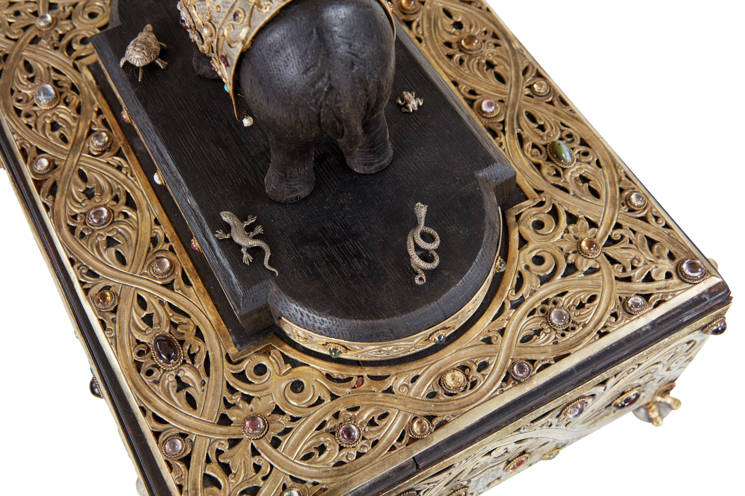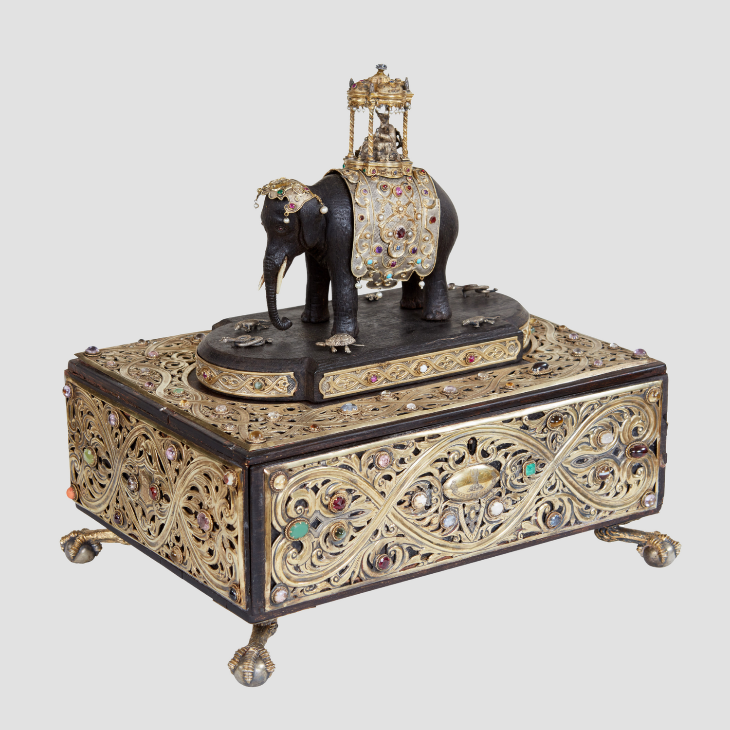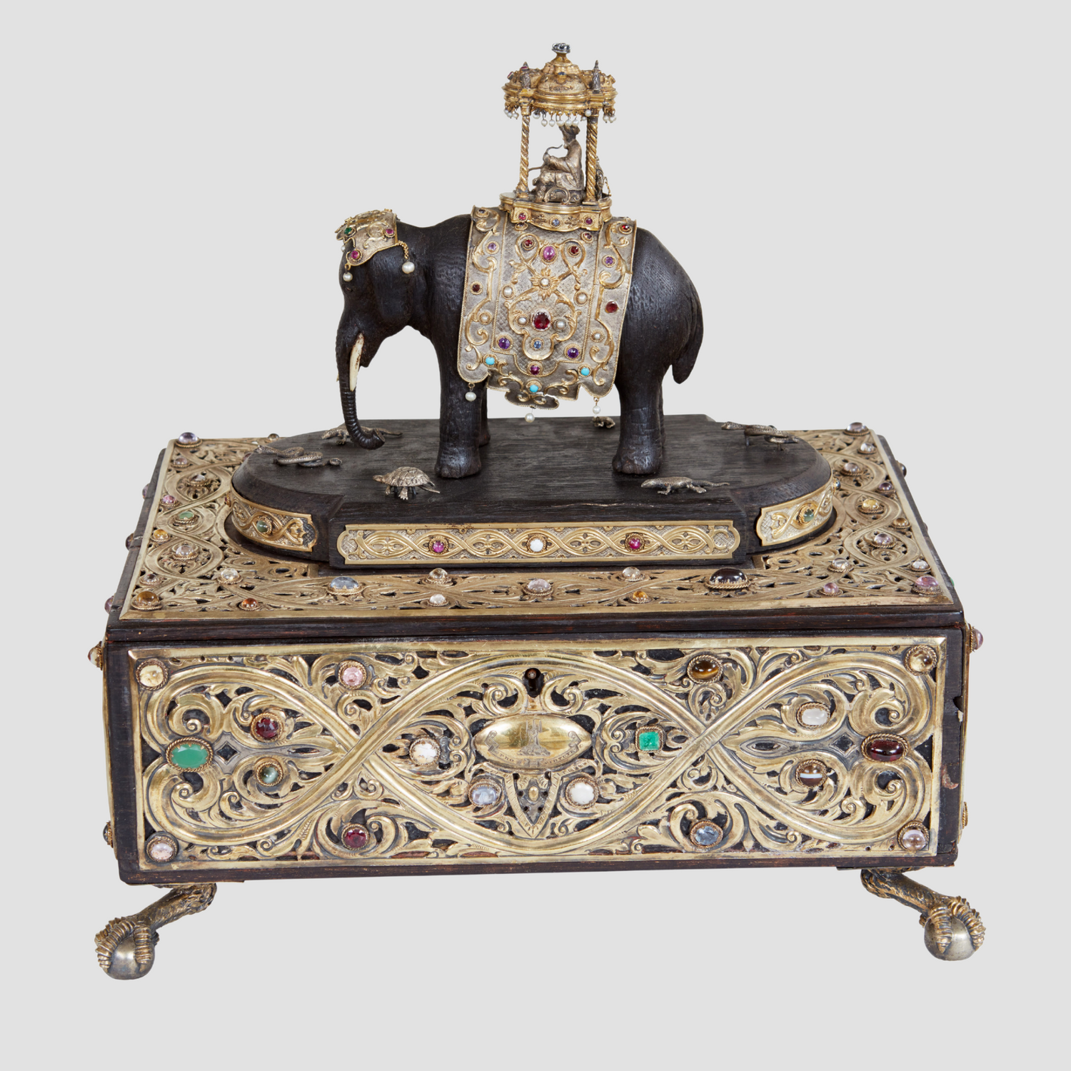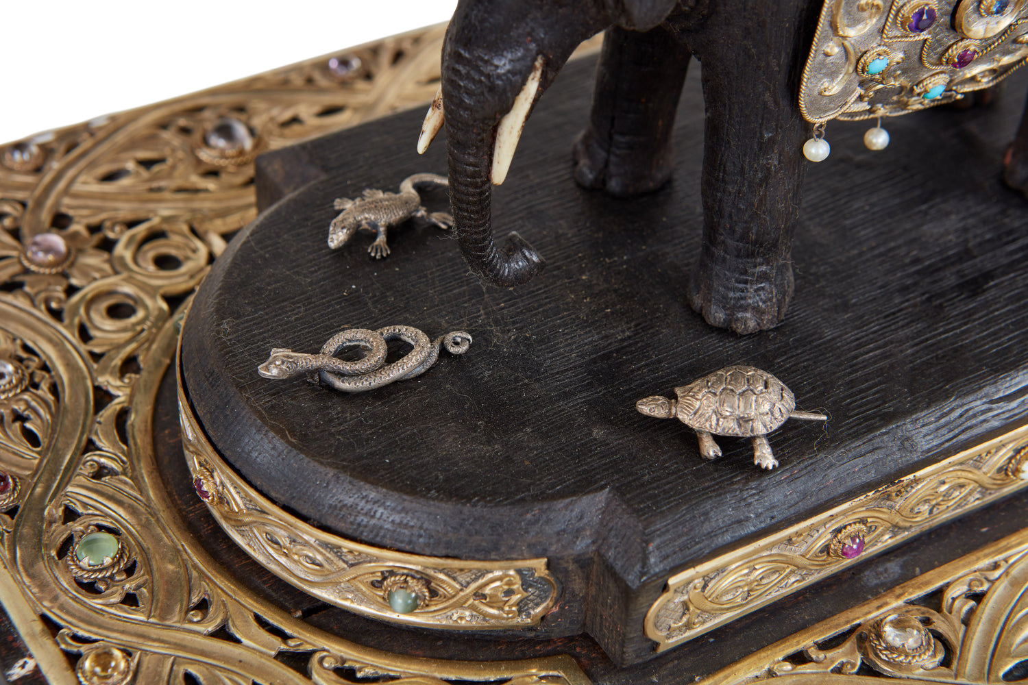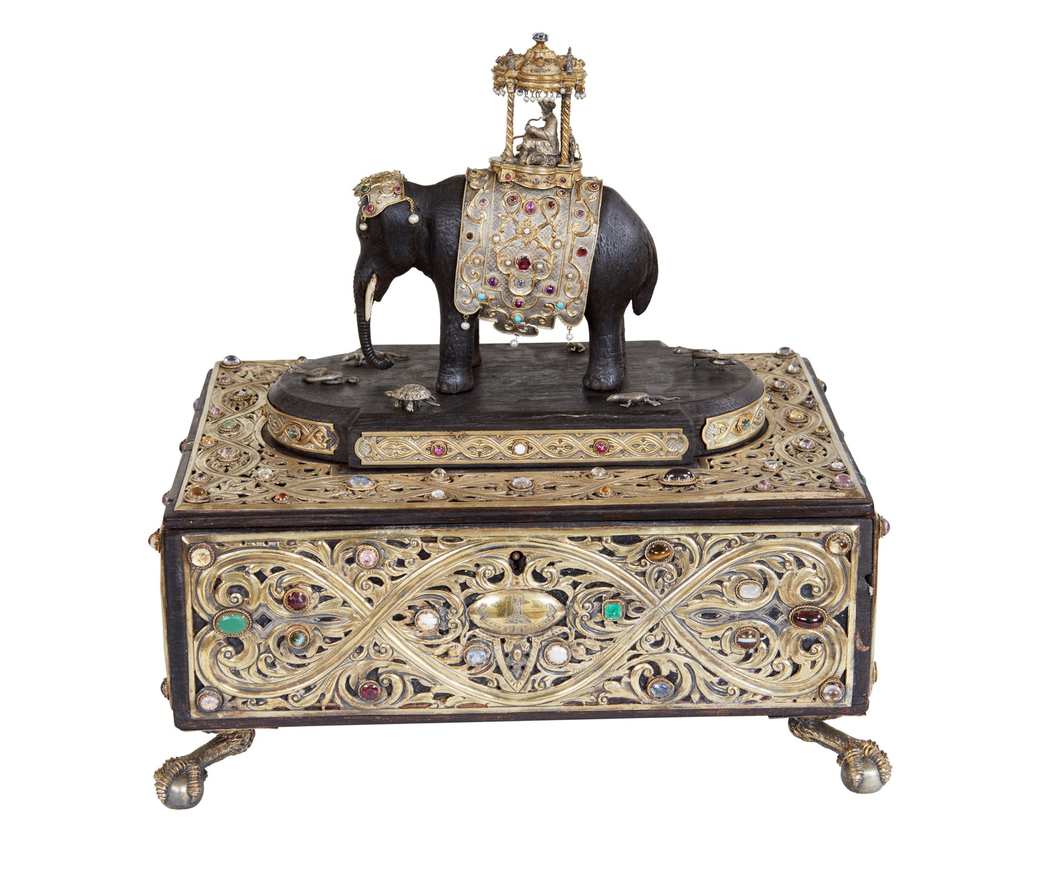 A presentation box dating c. 1845, curiously made of bog oak having a carved elephant with palanquin on a plinth (the tusks are ivorine) inset with semi-precious stones and silver decoration around the sides set on silver ball and claw feet and having a single drawer. Probably presented to Lestock Robert Reid, Governor of Bombay 1846-47 based on the coat of arms on the front drawer. Ht. 12 1/2”, W. 12 3/4”D. 9 1/2”.