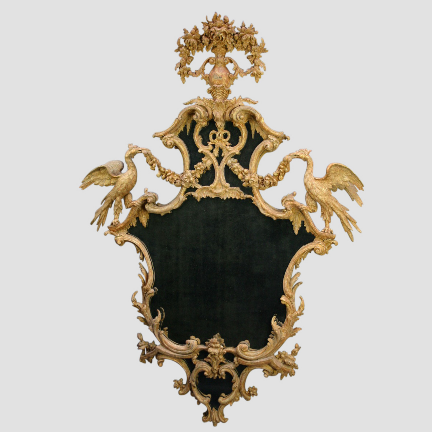 An unusual cartouche shaped carved and gilded mirror crested with a floral spray in an urn flanked by opposing s-scrolls and facing ho-ho birds, the frame comprised of c-scrolls and s-scrolls larded with icicles and leaf sprays. English circa 1760. Ht. 63", W. 44", D. 6"