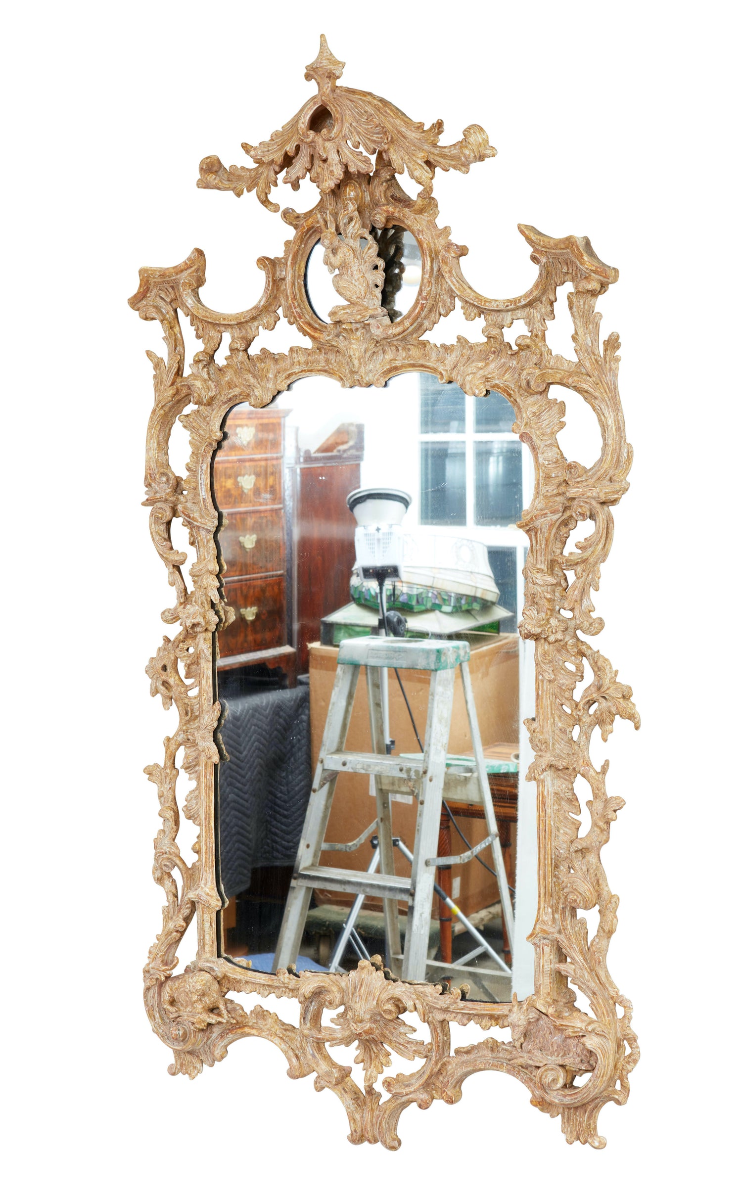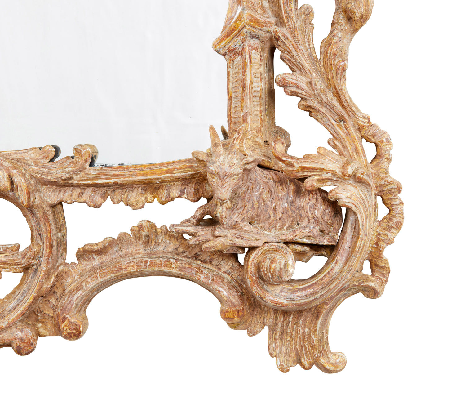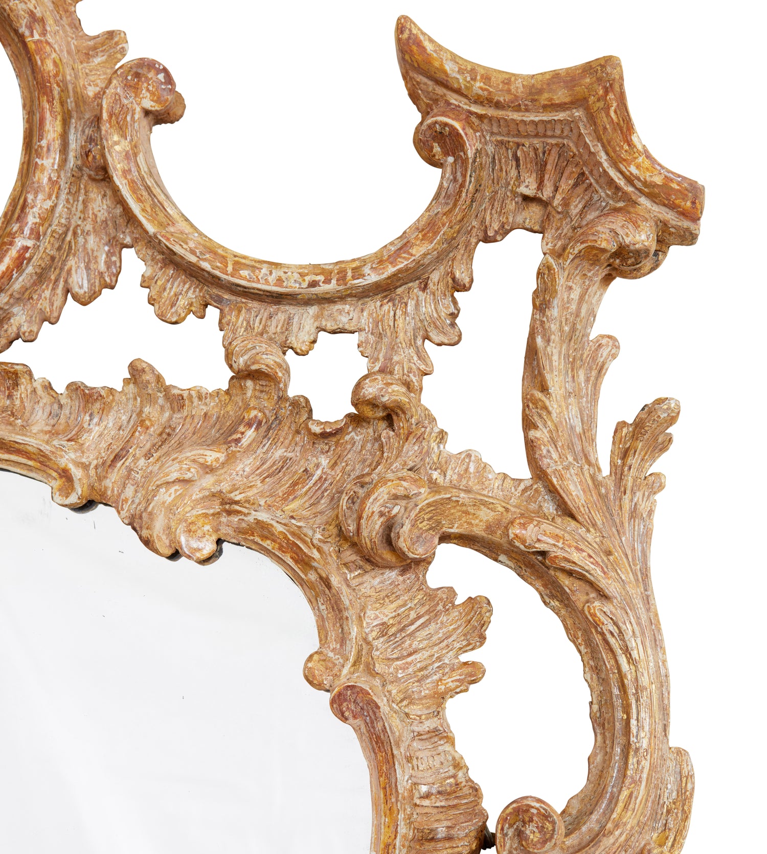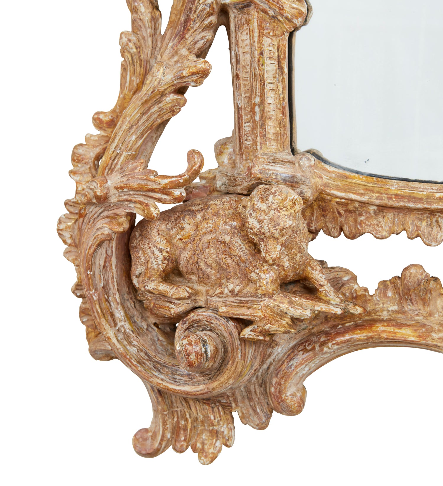 A superb and finely carved rococo looking glass frame circa 1755 having a carved pagoda top of acanthus leaves resting over double s-scrolls framing a carved rabbit, with flanking c-scrolls with rocaille, the outer frame being made up of c-scrolls and s-scrolls with carved foliage and acanthus leaf terminations centering at the bottom with double c-scrolls, the inner frame of carved rocaille with columnar sides. Glass is of the period but not original. Gilding is dry stripped and refreshed—repairs to some carving and front of pagoda. Ht. 57”, W. 29”