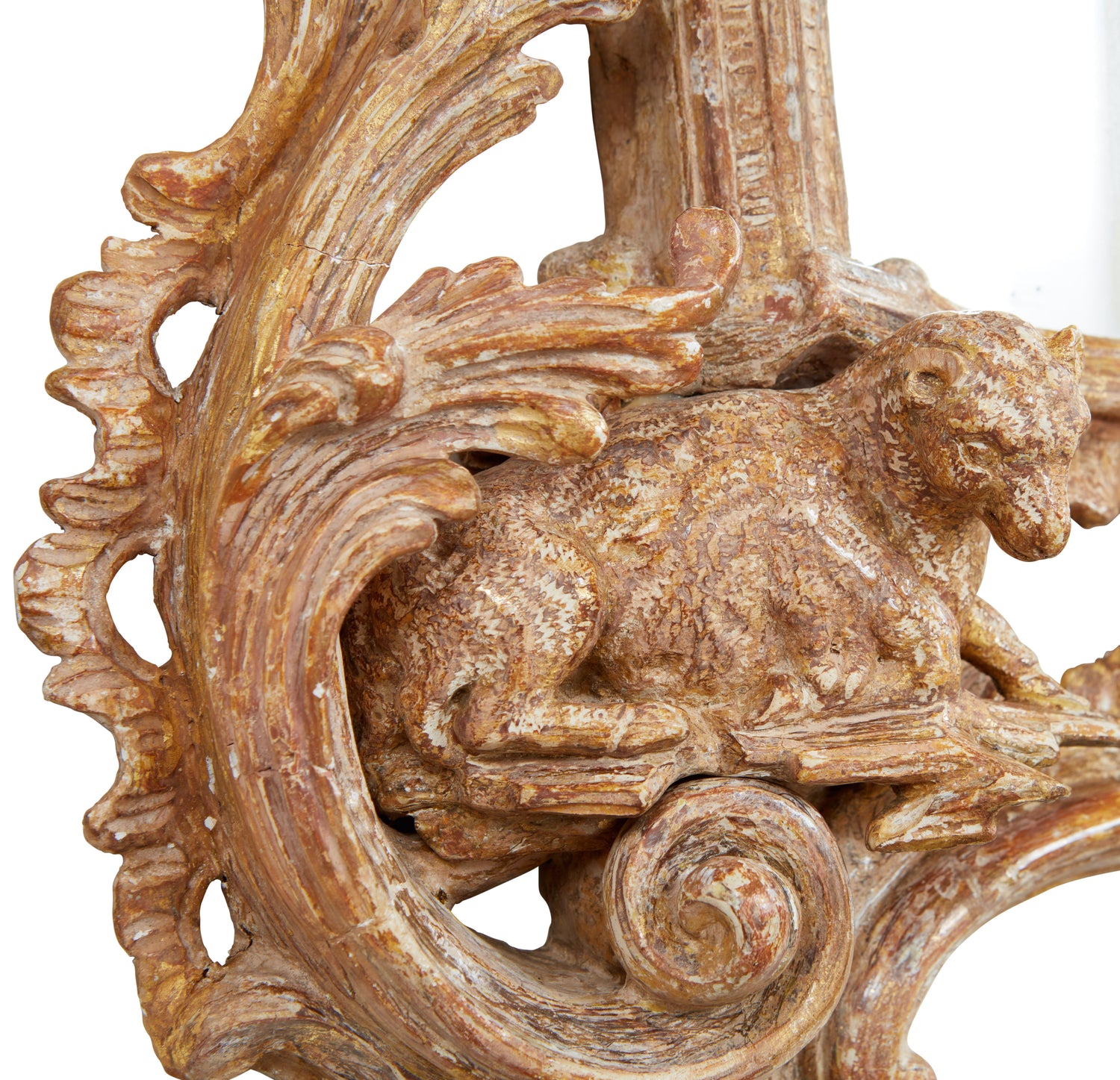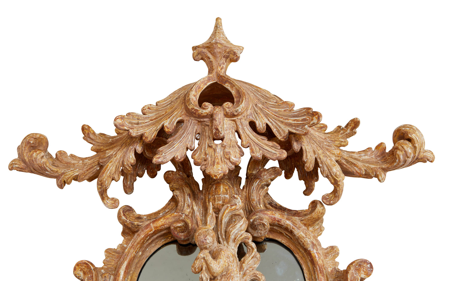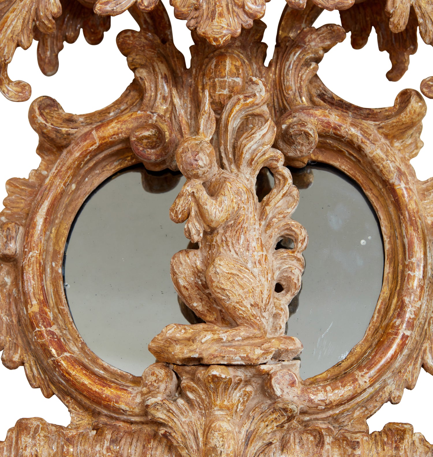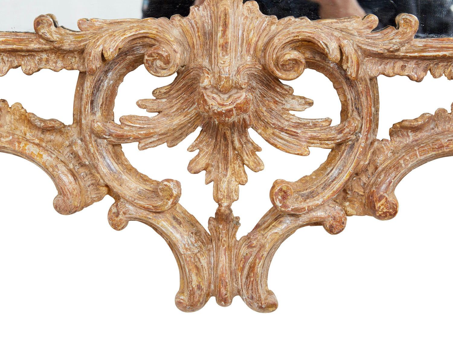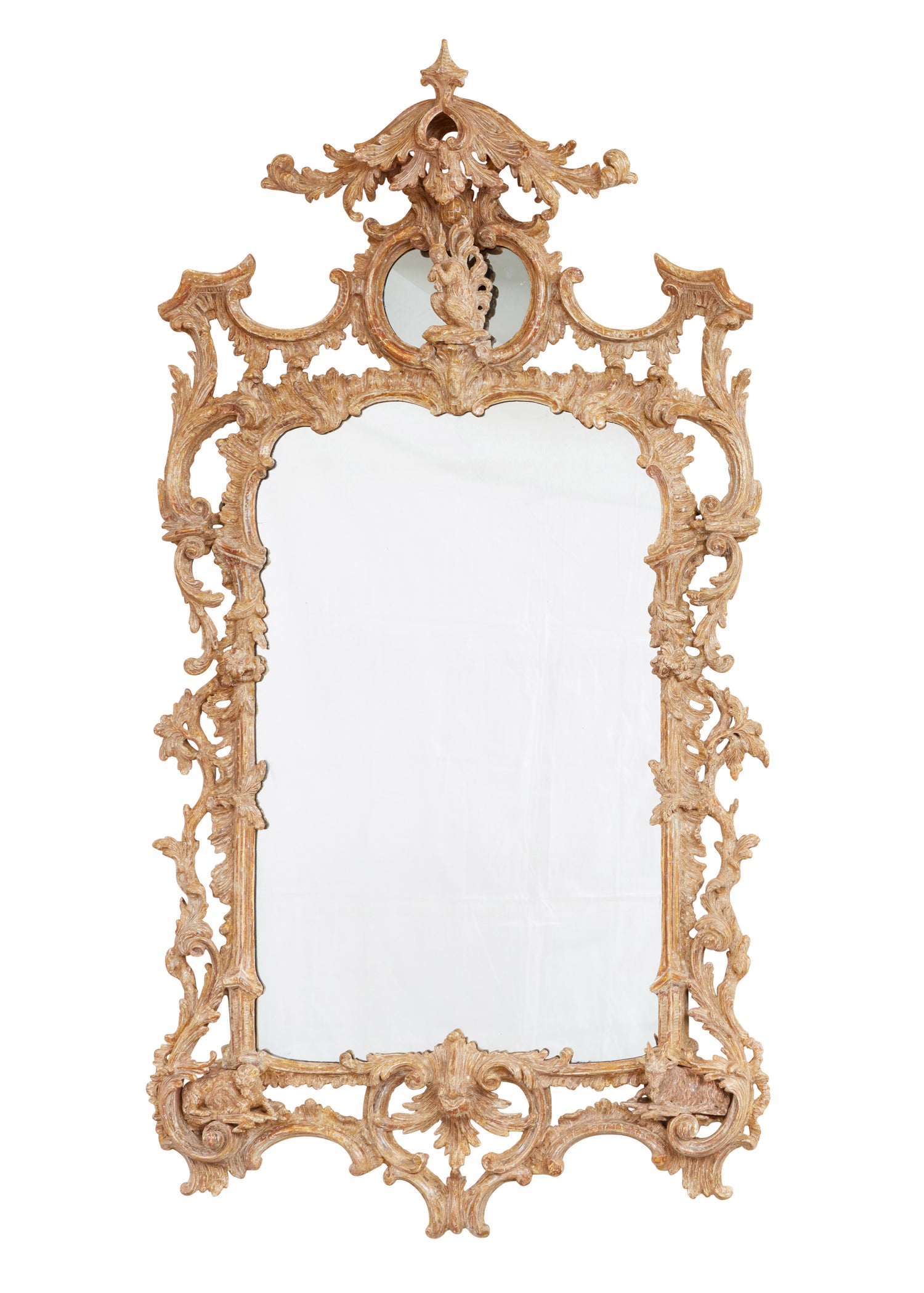 A superb and finely carved rococo looking glass frame circa 1755 having a carved pagoda top of acanthus leaves resting over double s-scrolls framing a carved rabbit, with flanking c-scrolls with rocaille, the outer frame being made up of c-scrolls and s-scrolls with carved foliage and acanthus leaf terminations centering at the bottom with double c-scrolls, the inner frame of carved rocaille with columnar sides. Glass is of the period but not original. Gilding is dry stripped and refreshed—repairs to some carving and front of pagoda. Ht. 57”, W. 29”
