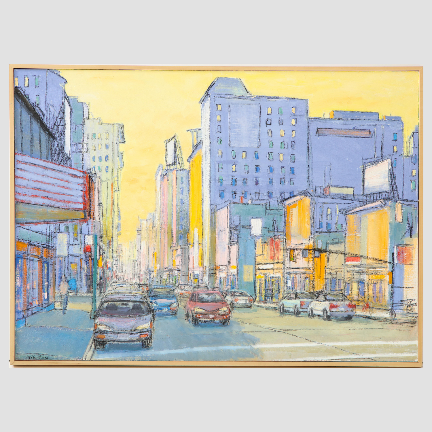 Mark Horton is a contemporary painter who specializes in cityscapes that evoke earlier eras from the 1950's to 1970's. W. 51 1/8" Ht. 37 1/8"