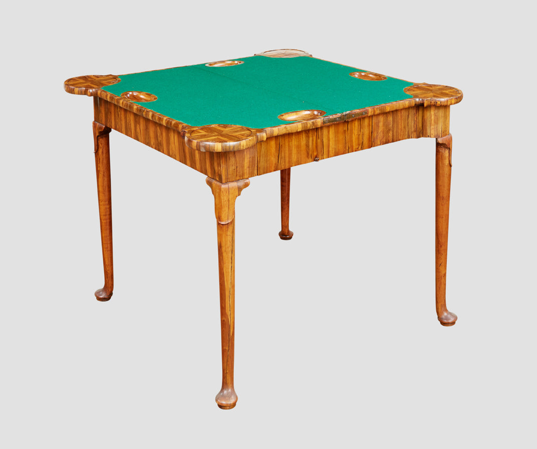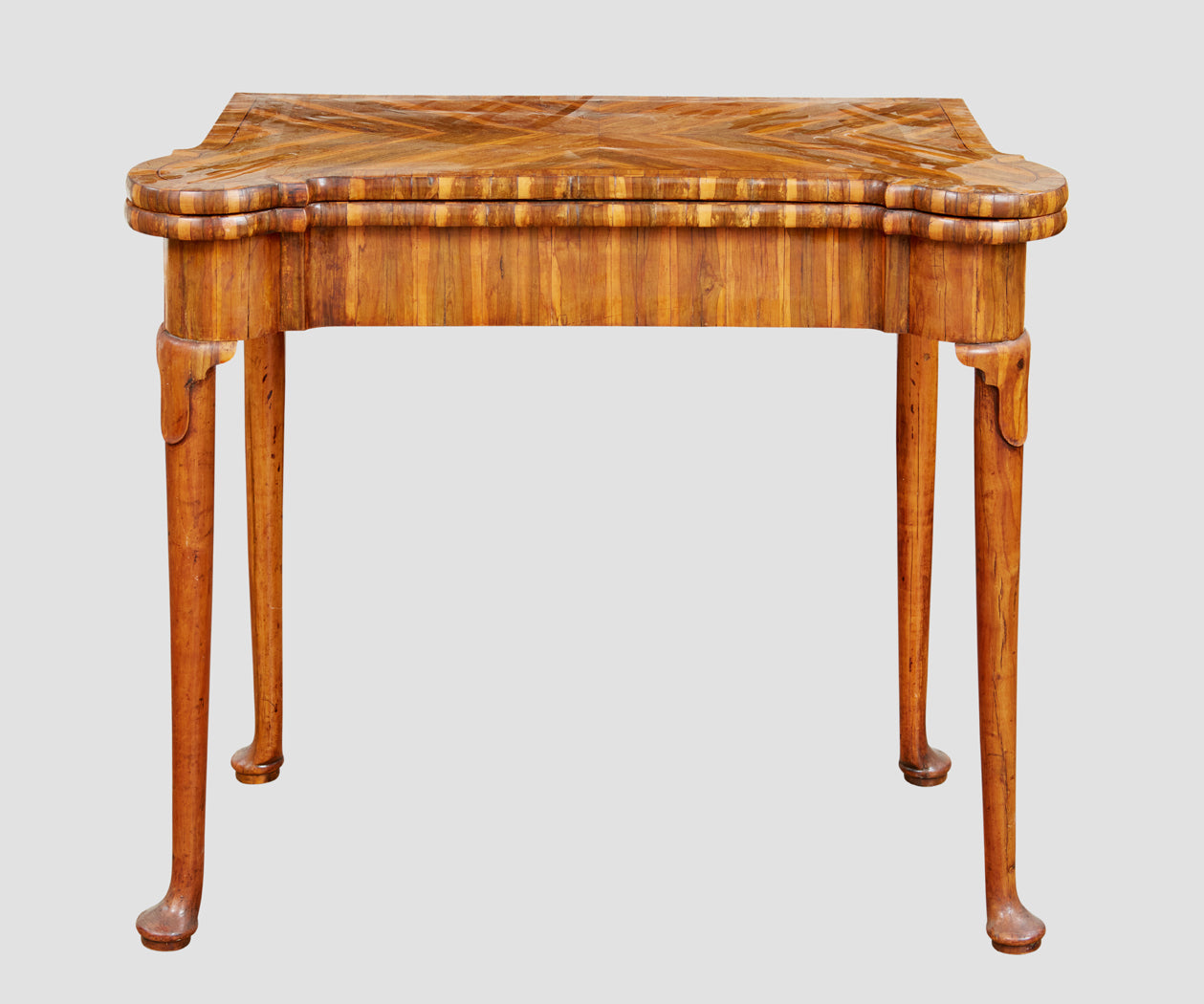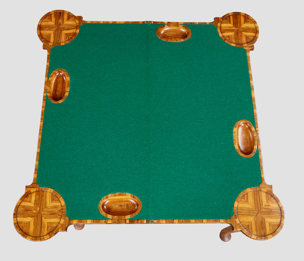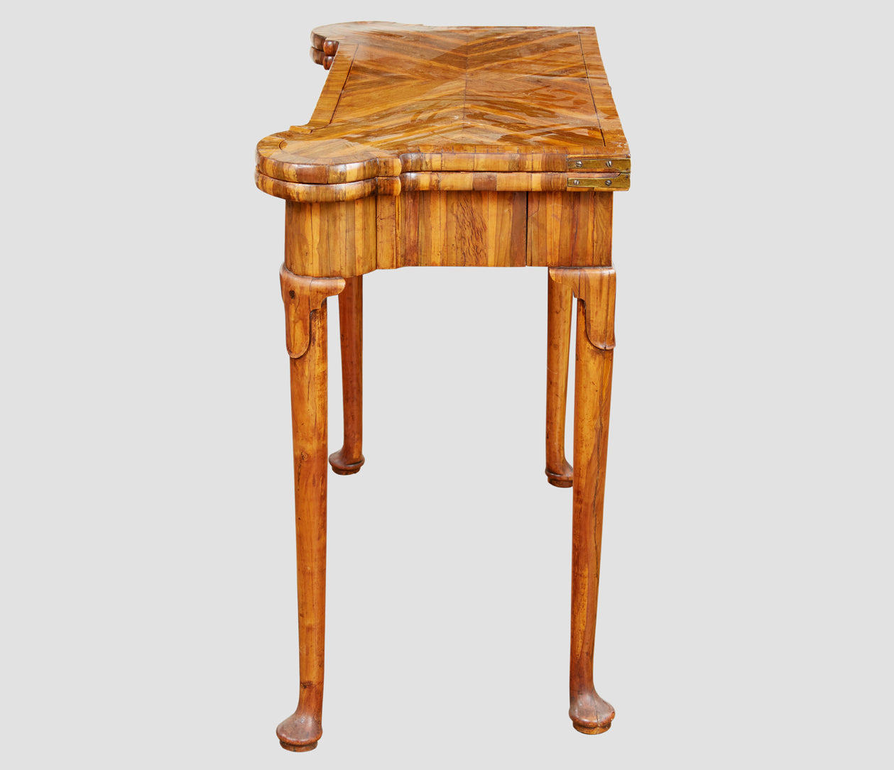 A fine George I games table veneered in cocus wood in a chevron pattern on the top and vertically on the frieze, the legs of modified cabriole form with pad feet, the table opening out with a concertina action to allow the four legs to be at each corner, having inset cups on the interior with a felt surface and the whole banded in cocus wood. Cocus wood (Brya ebenus) is a Caribbean/South American timber—this table being a superb example having terrific fading. Circa 1730. Ht. 29 1/4”, W. 34”, D 17”