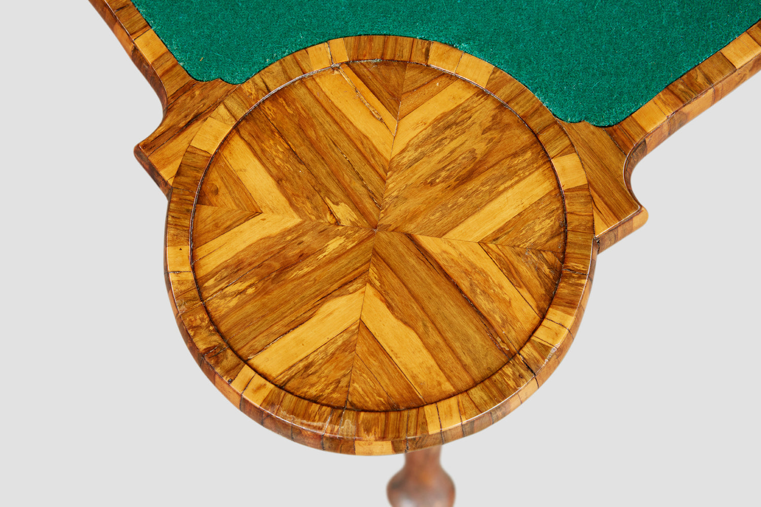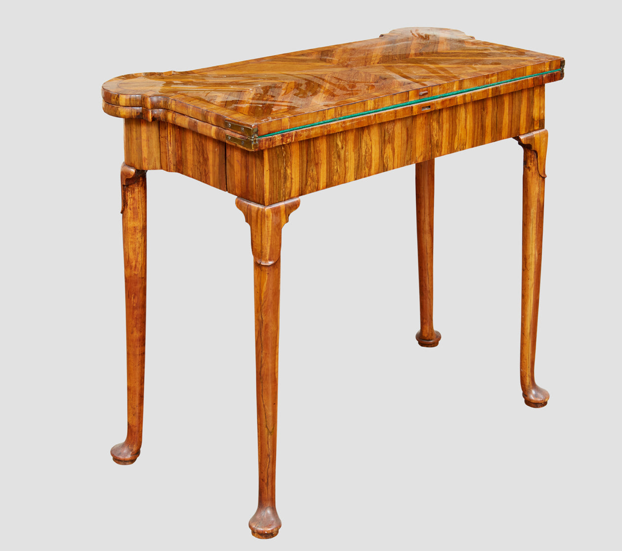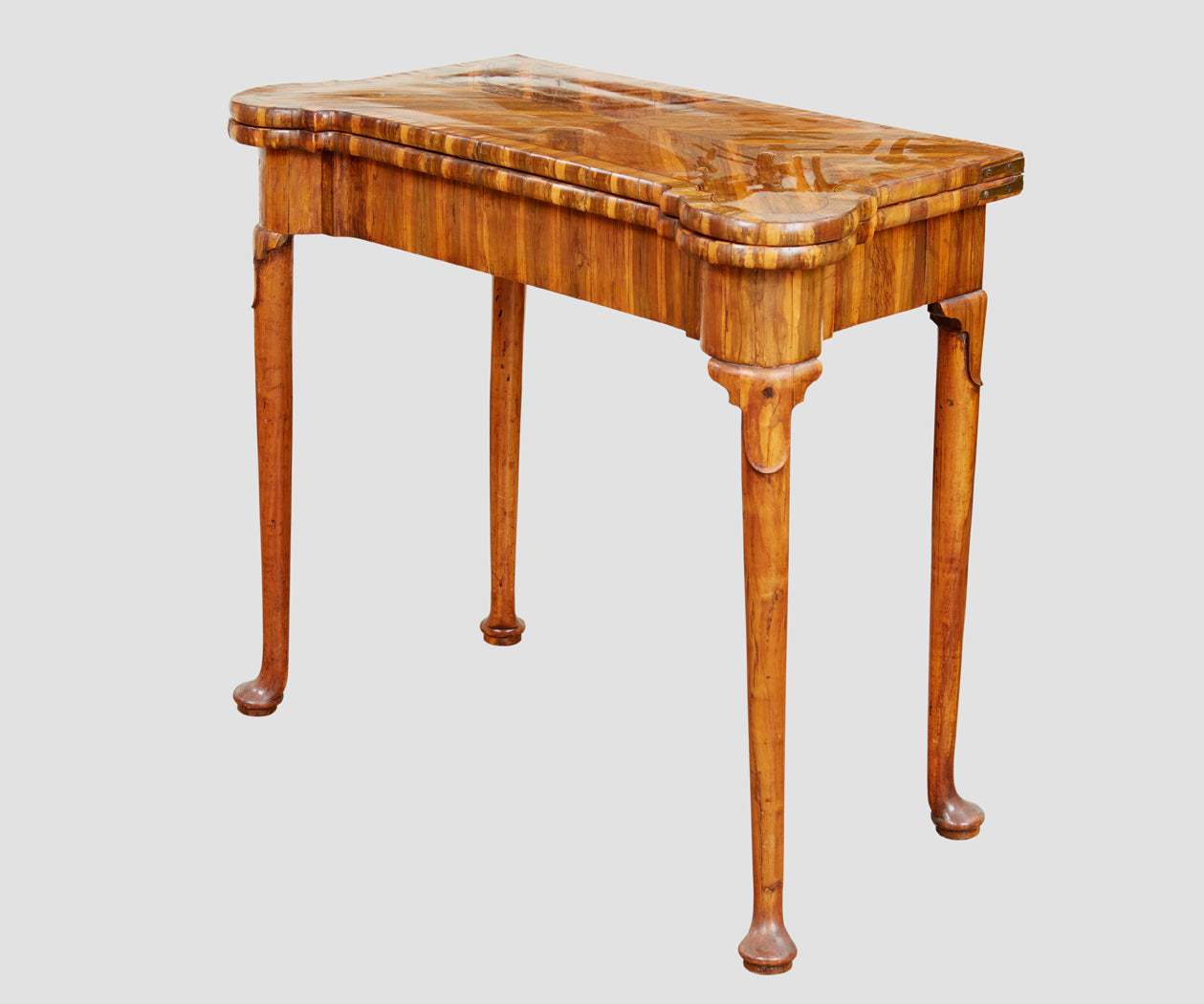 A fine George I games table veneered in cocus wood in a chevron pattern on the top and vertically on the frieze, the legs of modified cabriole form with pad feet, the table opening out with a concertina action to allow the four legs to be at each corner, having inset cups on the interior with a felt surface and the whole banded in cocus wood. Cocus wood (Brya ebenus) is a Caribbean/South American timber—this table being a superb example having terrific fading. Circa 1730. Ht. 29 1/4”, W. 34”, D 17”