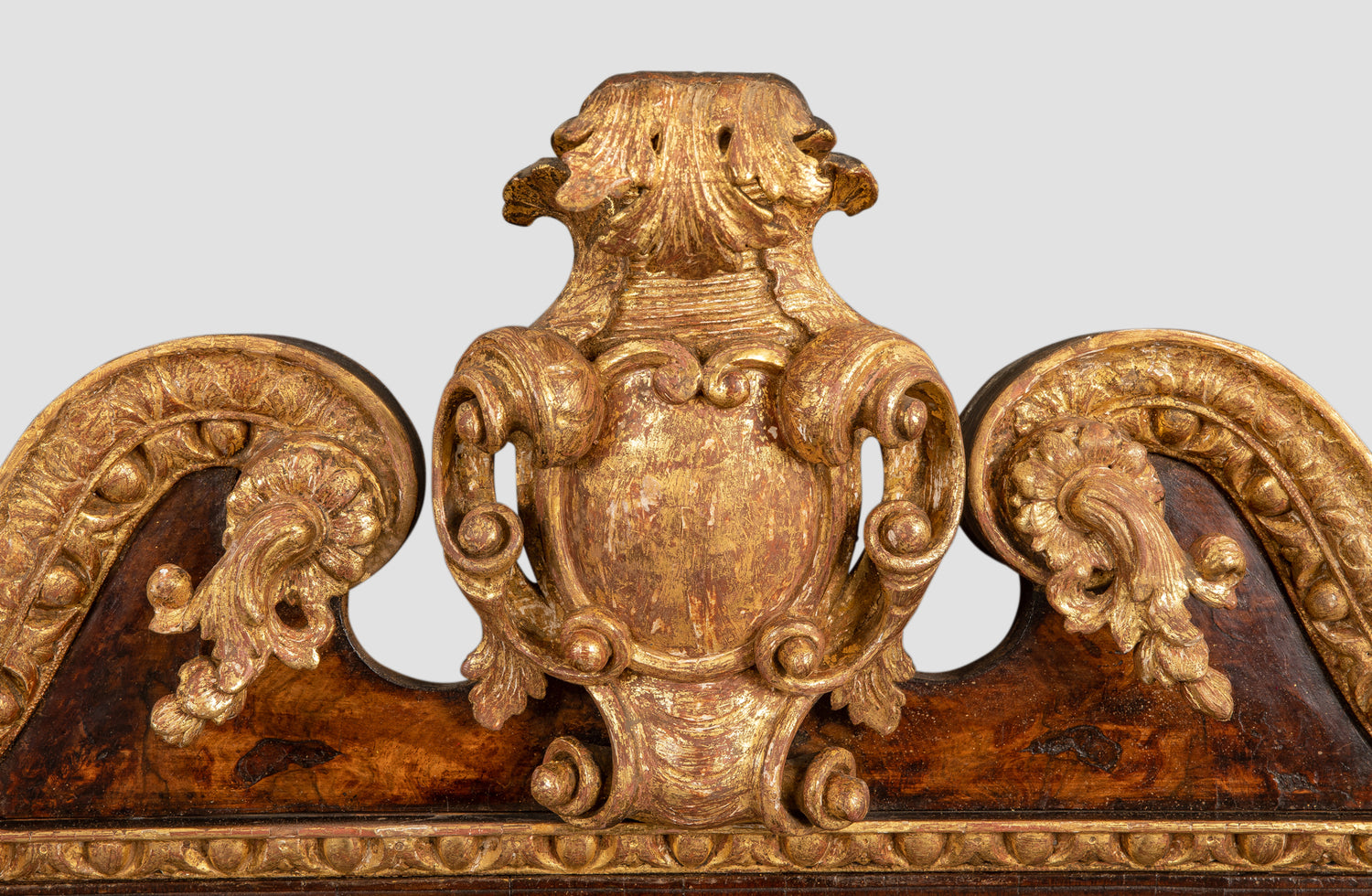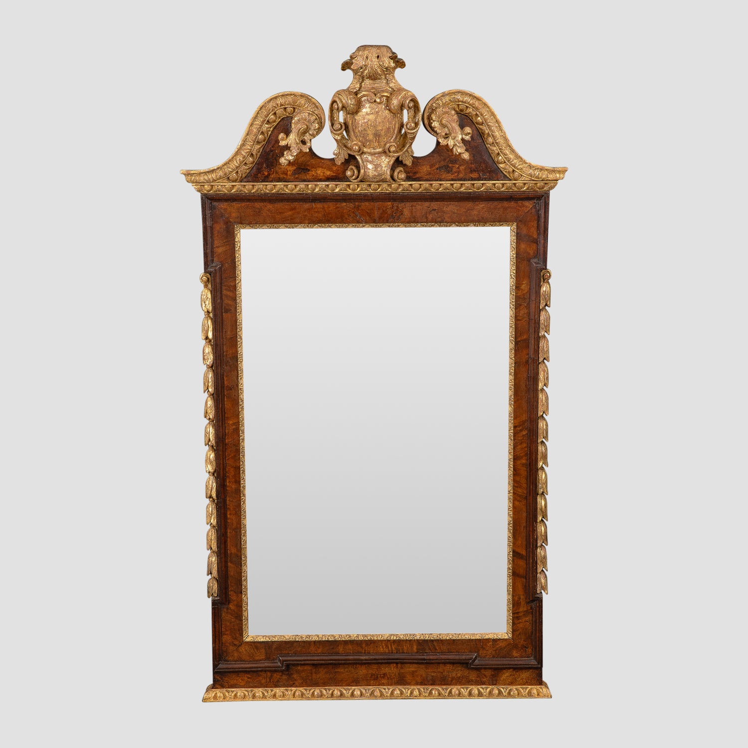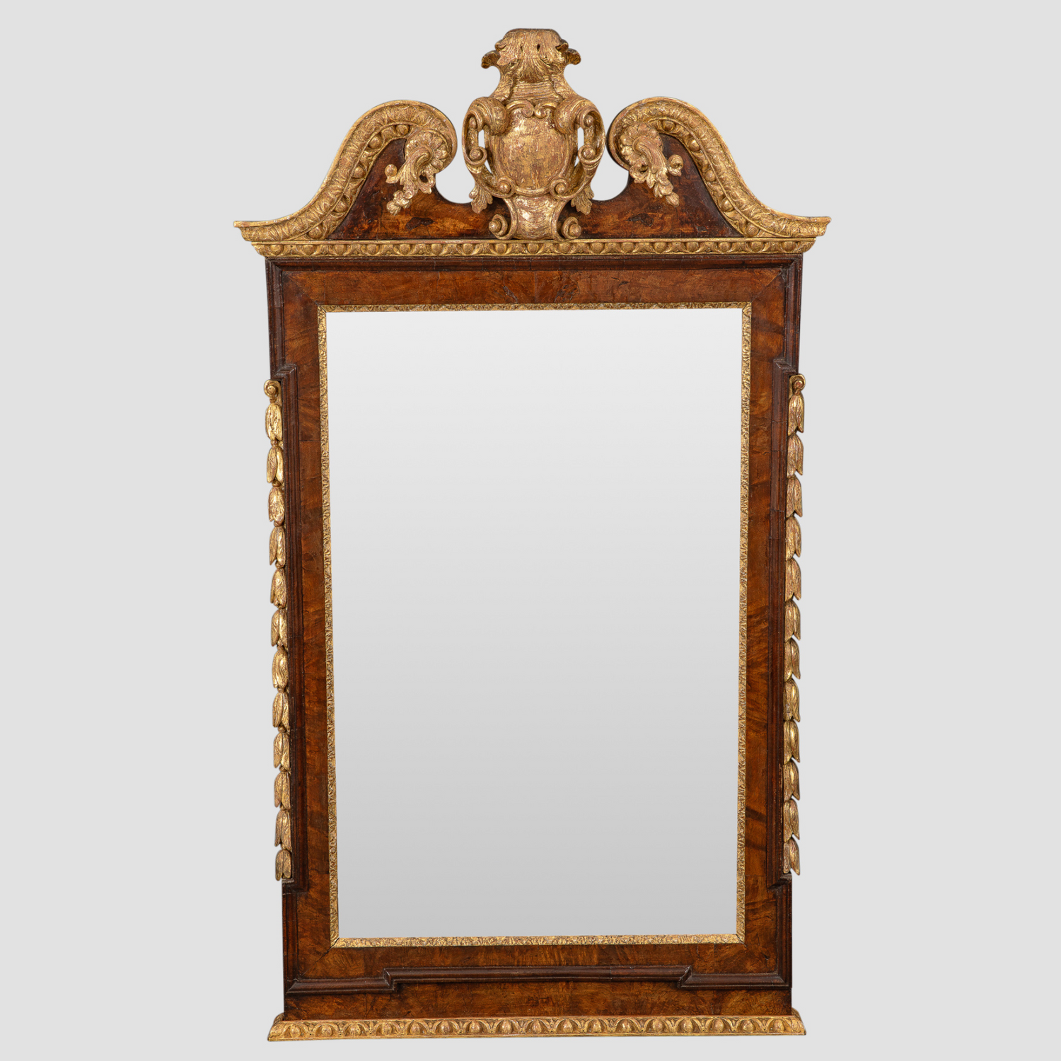 A fine walnut and parcel gilt mirror, having a carved and gilded cartouche flanked by a carved and gilded broken swan neck pediment with burr walnut veneers and the original re-silvered beveled glass plate, with carved and gilded drops flanking each side of the frame. Circa 1720 Ht. 43" W. 24.5", D. 6.5" Re-gilded.