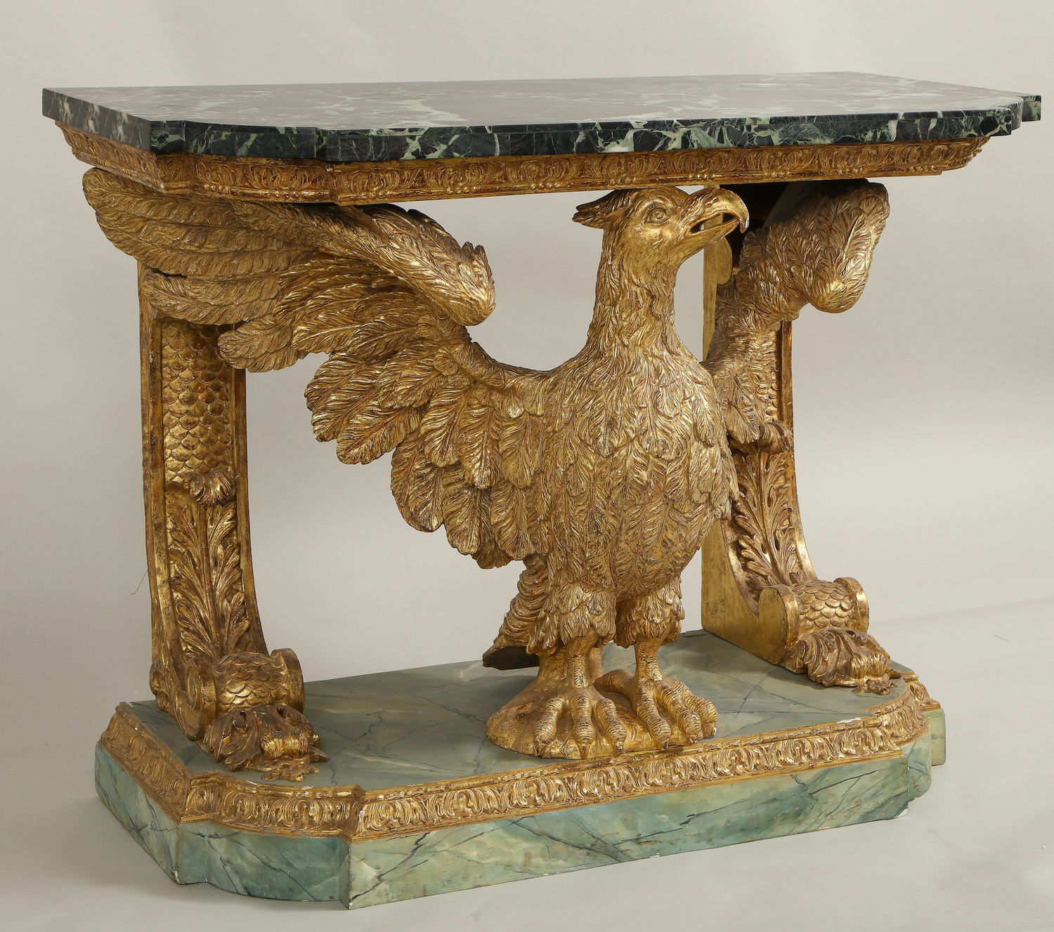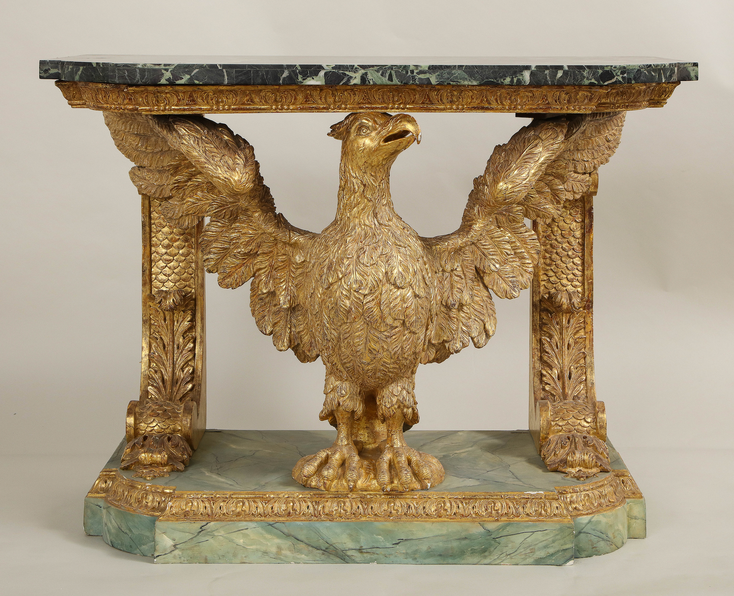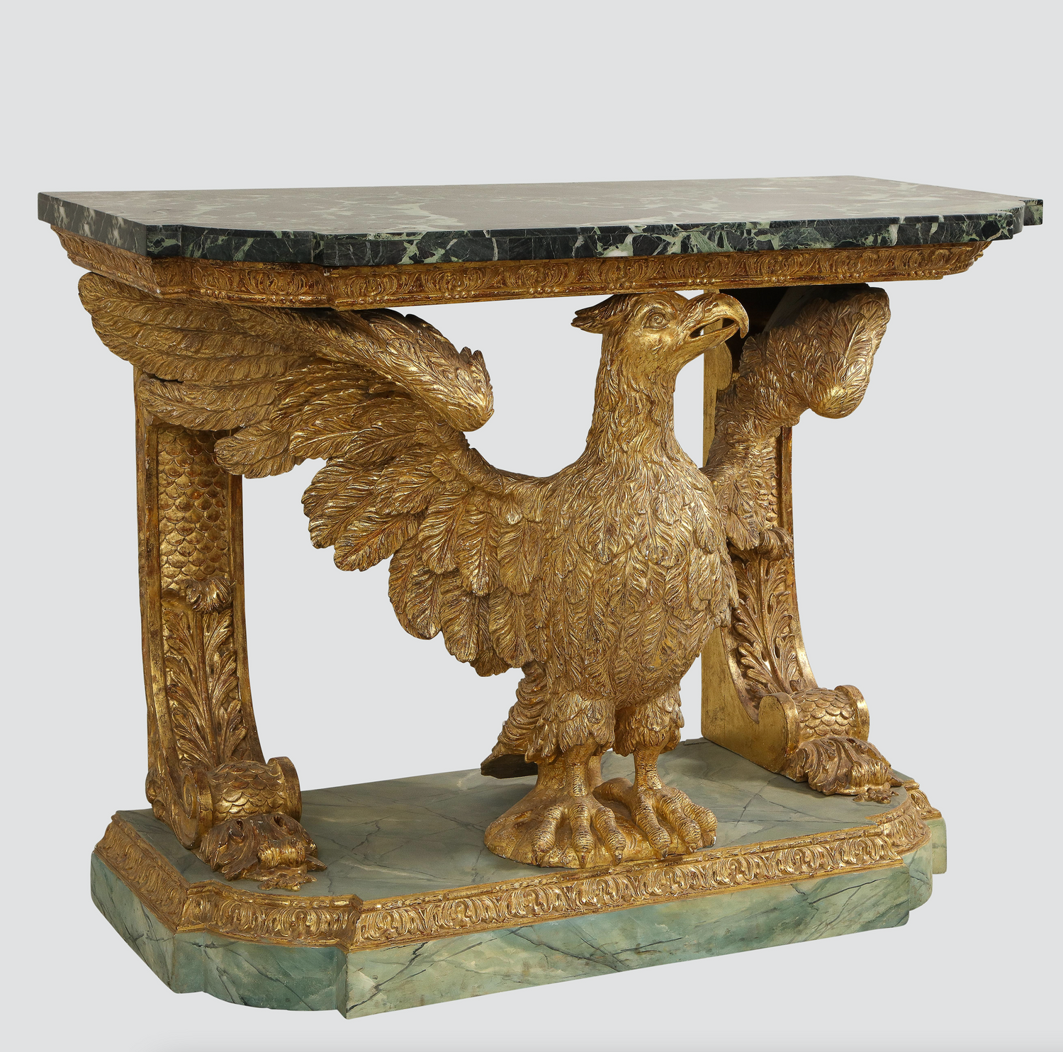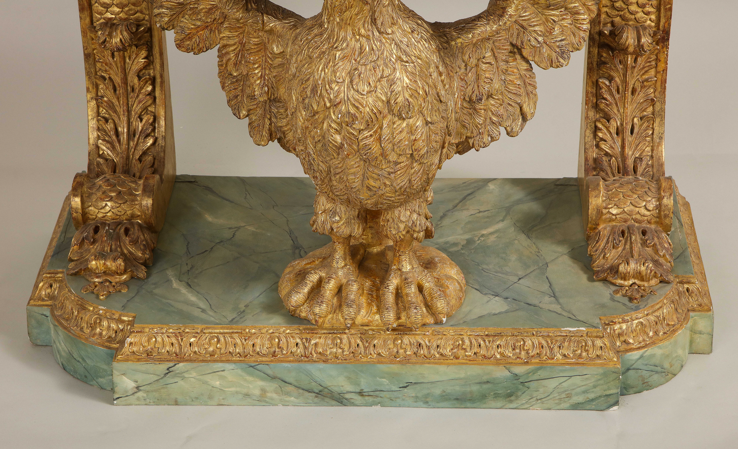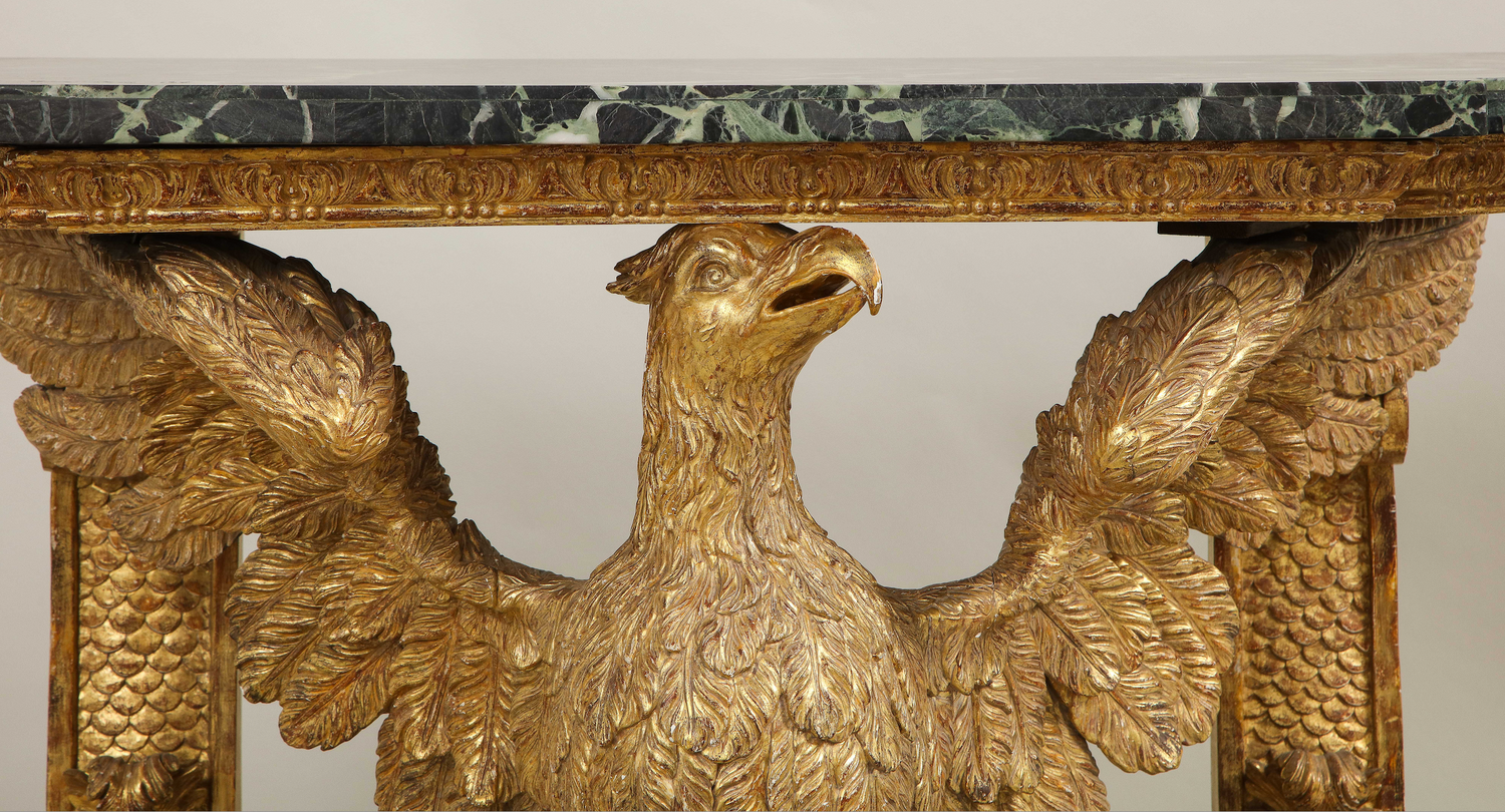 A fine George II carved and gilded eagle console table having a marble top supported by carved brackets and the carved eagle on a faux marble base. In the manner of William Kent. Similar to the pair of console tables (of foxes) at Stourhead in Wilton in execution. An owl console table (Lot 96) attributed to John Boson sold at Sotheby’s , Benacre Hall, Suffolk sale, May 9-11 has identical support and base to this table English circa 1735. (In addition, an almost identical table pictured below is ex-collection of the Marquis of Waterford from Curraghmore House in Ireland.) Ht. 33.75", W. 42.25", D. 21.5"