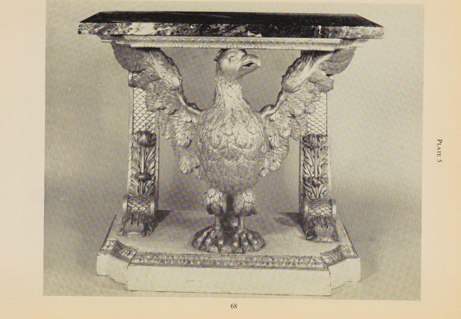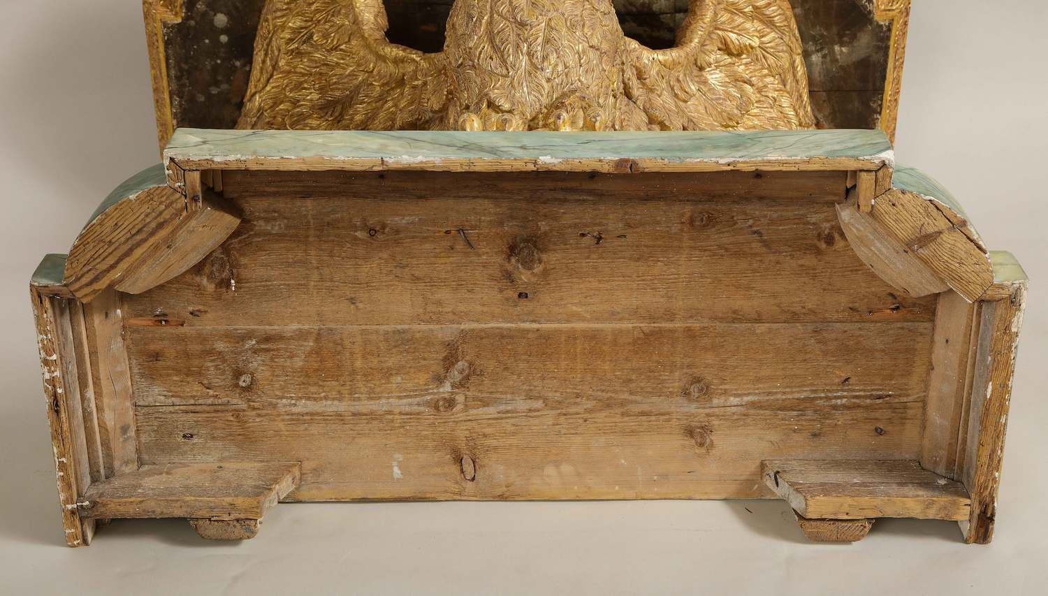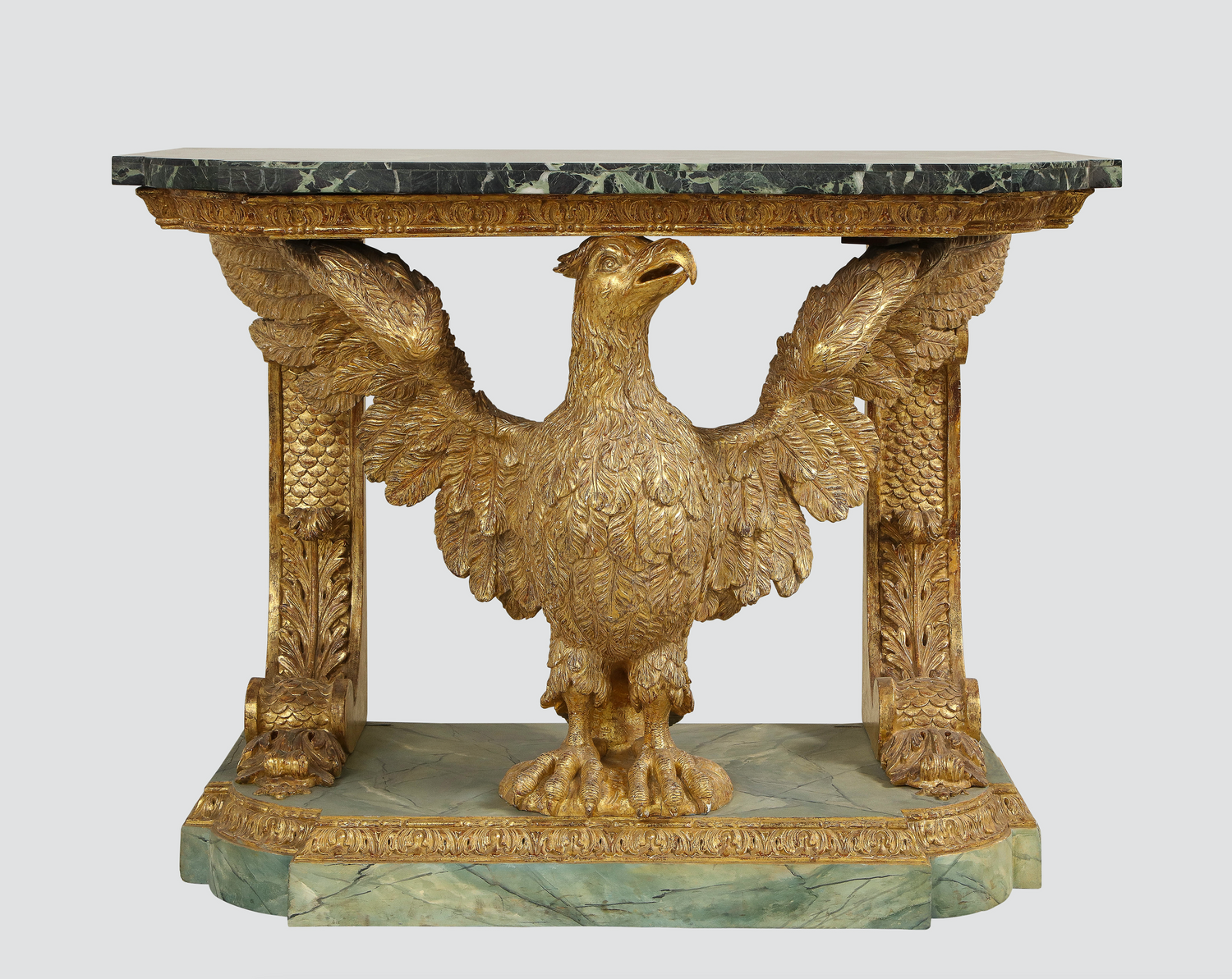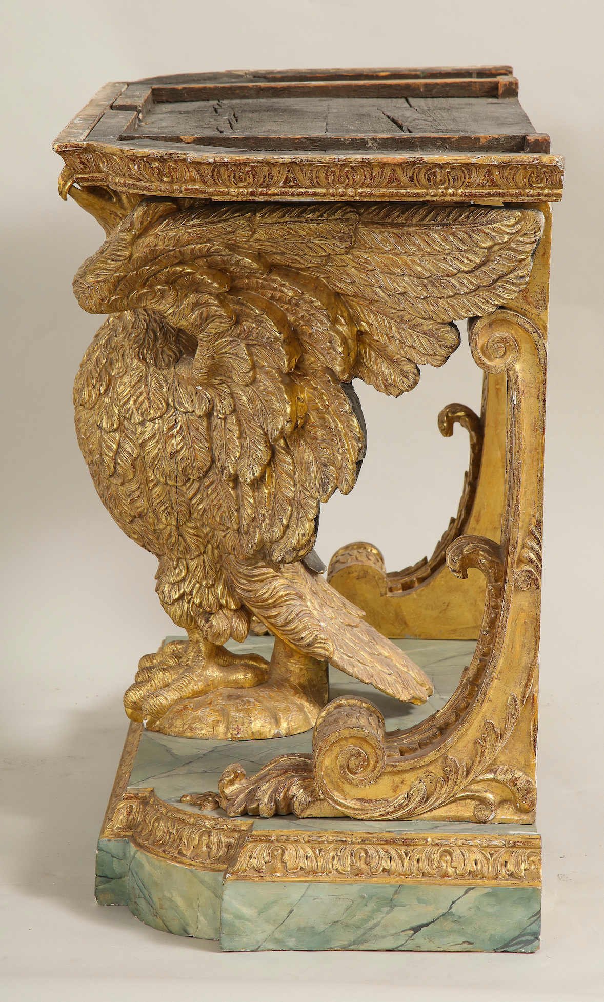 A fine George II carved and gilded eagle console table having a marble top supported by carved brackets and the carved eagle on a faux marble base. In the manner of William Kent. Similar to the pair of console tables (of foxes) at Stourhead in Wilton in execution. An owl console table (Lot 96) attributed to John Boson sold at Sotheby’s , Benacre Hall, Suffolk sale, May 9-11 has identical support and base to this table English circa 1735. (In addition, an almost identical table pictured below is ex-collection of the Marquis of Waterford from Curraghmore House in Ireland.) Ht. 33.75", W. 42.25", D. 21.5"