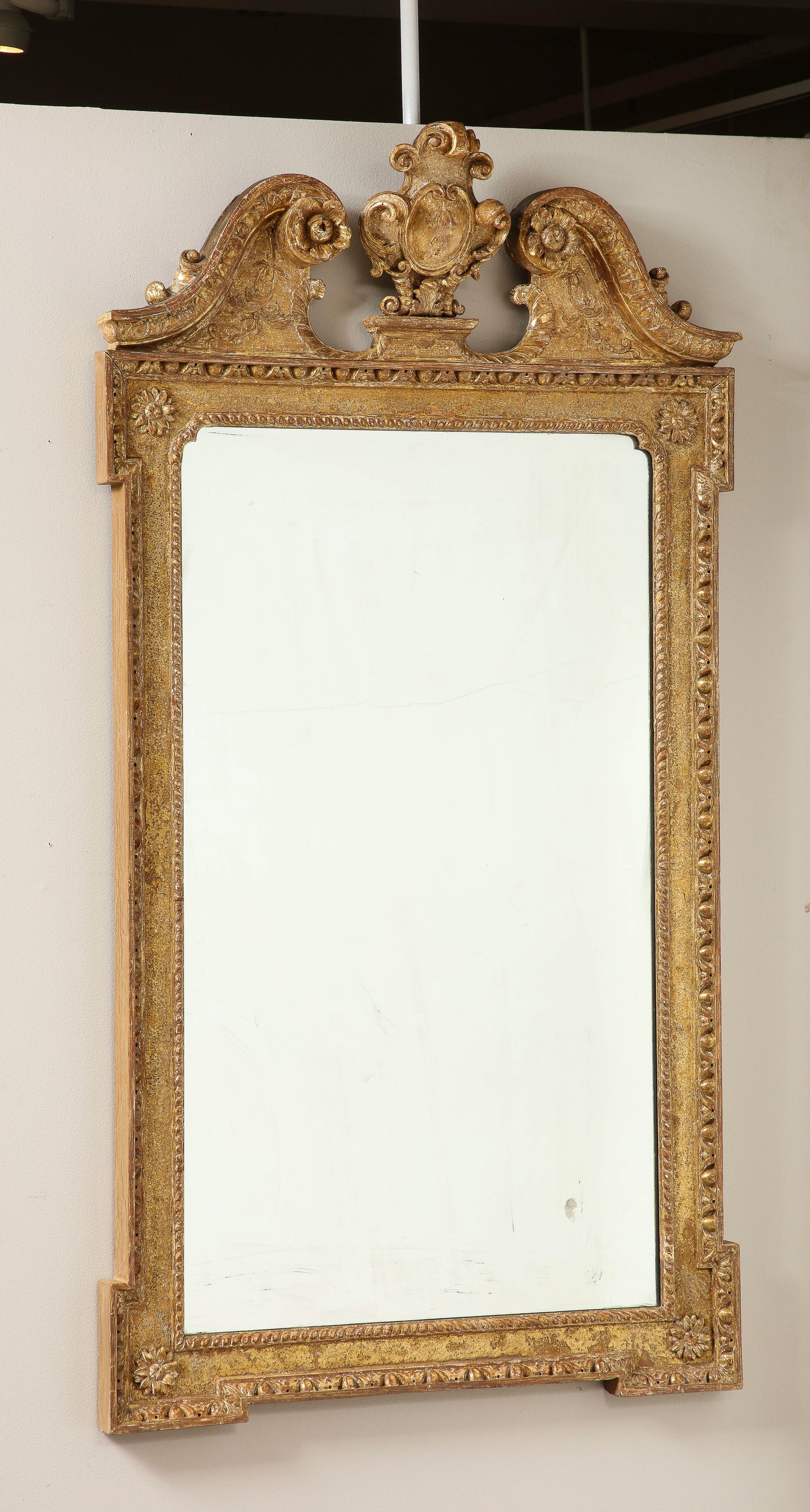 A finely carved George II looking glass, dry stripped to its original gilding having a broken swan neck pediment centered by the original cartouche carved with scrolls and acanthus leaves, the molded pediment carved with acanthus leaves, the inside of the pediment having gesso carved leaves and flowers resting on a frame having outset corners, molded with egg and dart, the flat surface sanded and gilded surrounding a frame carved with a gadroon molding. Each corner having carved and gilded flowers matching those on the pediment. The plate glass mirror is new. Ht. 53 1/2”, Width 28”