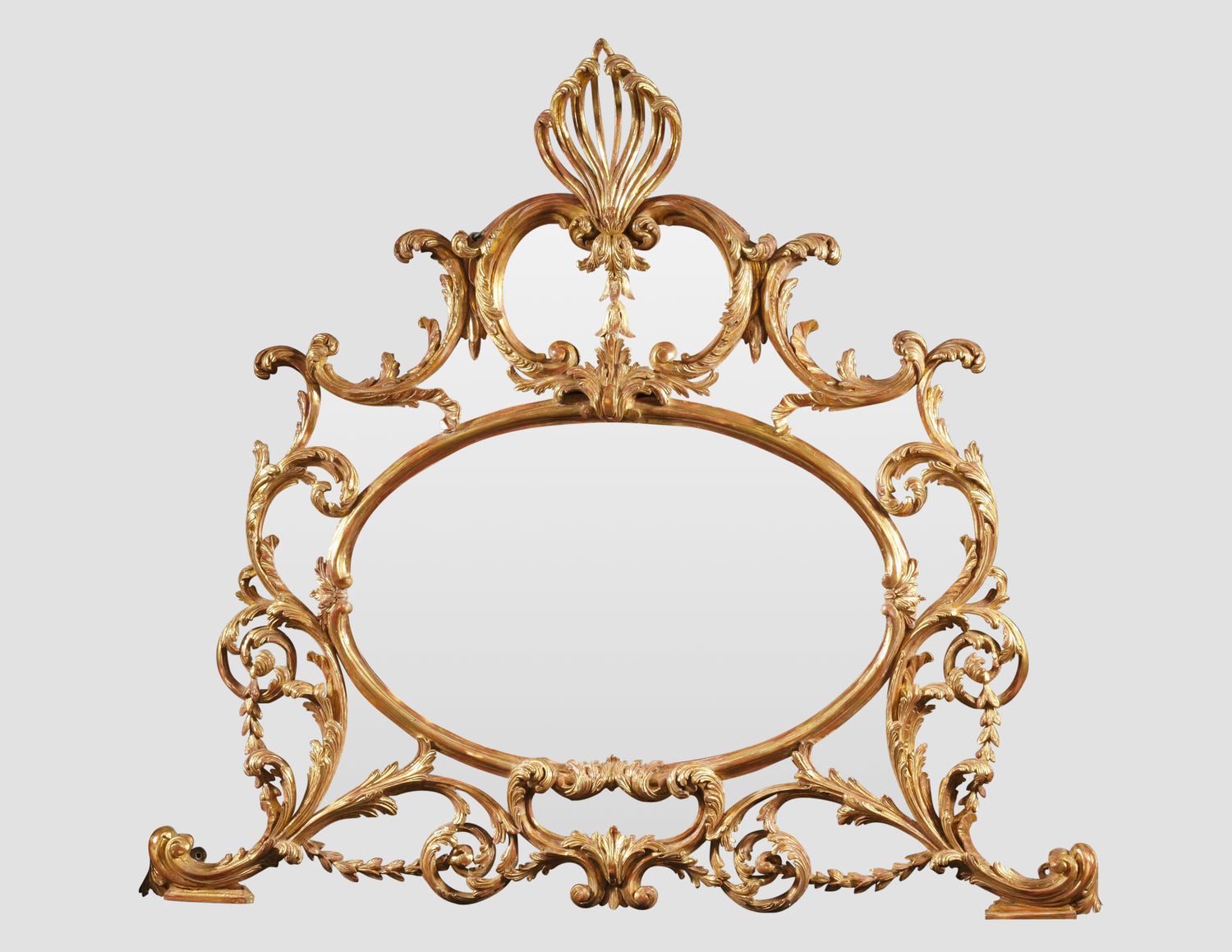 Finely carved and gilded overmantel mirror in the manner of Thomas Chippendale crested with a stylized acanthus, supported by c and s-scrolls flanking a central plate. English. Ht. 43.5". W. 50" Re-gilded.