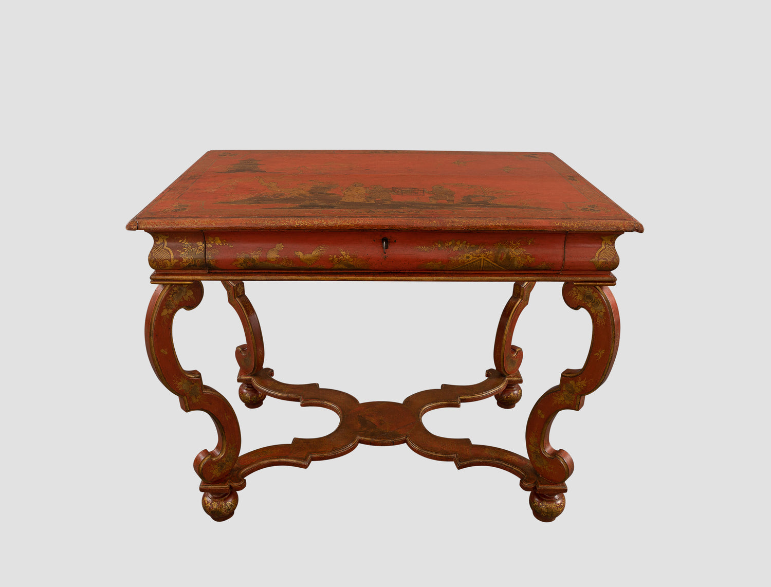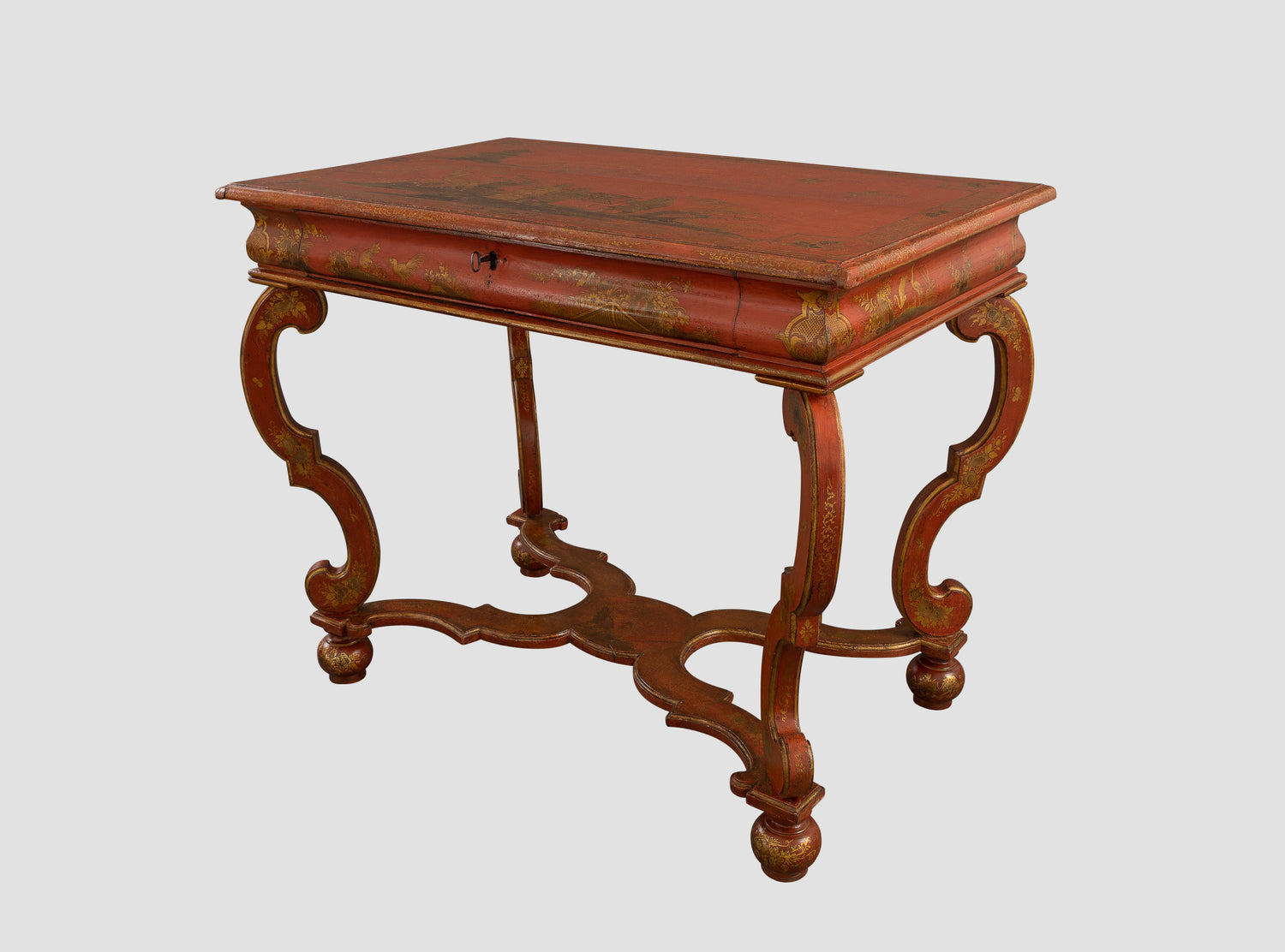 The rectangular red japanned top above single drawer, the faces of the carcass of convex form above four scrolled legs connected by an x-frame stretcher terminating in bun feet. The table is constructed throughout in pine with oak linings to the drawer, and directly relates to a very well known “Bantam work” table at Ham House and commissioned by the Dysart Family, Earls of Lauderdale prior to the inventory of the house in 1679. The present table, as with the Ham House table illustrated here, would have been commissioned as part of a suite, including the table, a mirror and a pair of torchieres that would have occupied the space between two windows. Very few full sets survive and it is remarkable that the present table along with the Ham House example have survived in remarkably original condition.