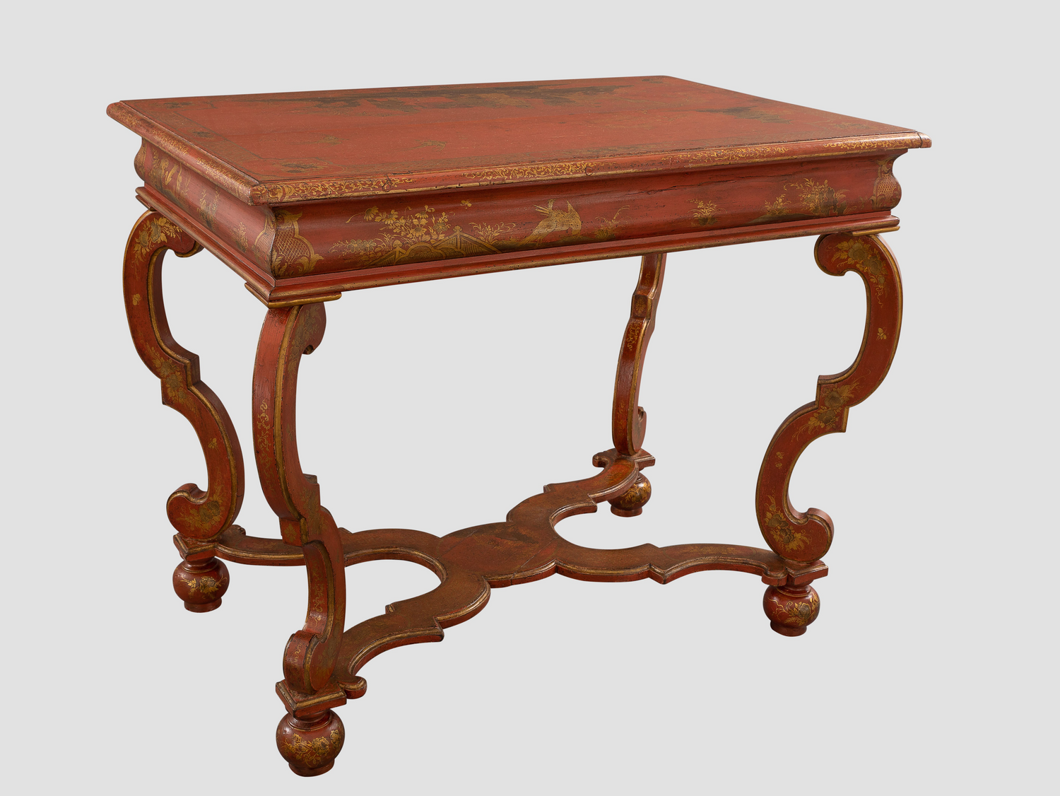 Although the feet have been sympathetically replaced, as is usual, the japanning remains remarkably untouched and the quality of the work is truly exceptional rivalling some Asian lacquer work of the 17th century. Predating Stalker and Parker’s manual A Treatise of Japanning, Varnishing and Gilding of 1688 the design source for the table decoration must have come directly from Asian examples, possibly scrolls or screens. Many European “Japanned” pieces of the 17th and 18th centuries displayed fanciful depictions of Asian scenes and characters that tried to simulate Asian works but often failed to grasp the narrative nature of Chinese painting.