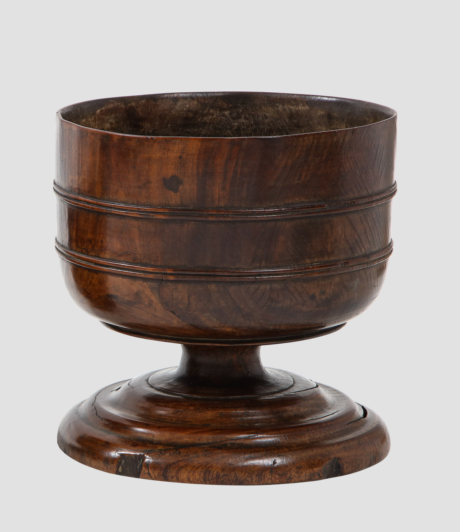A wonderful large Lignum vitae wassail bowl circa 1690 with wonderful aging. Wassail bowls were first mentioned in the 13th century as a vessel in which revelers dropped cakes and bread into--the practice of floating chips of toasted bread was the origins of the word "toast" as a salutation to other drinkers. Ht. 10", Dia. 10"