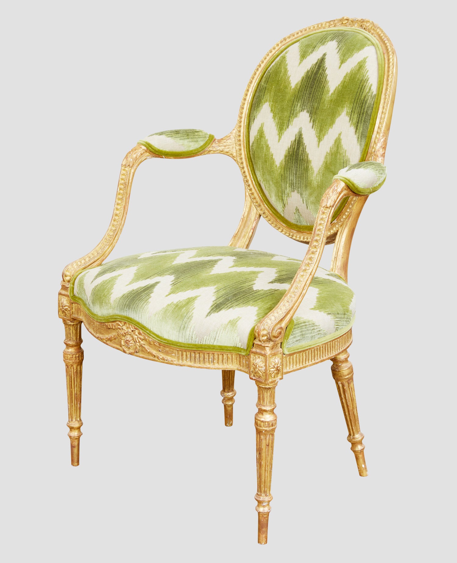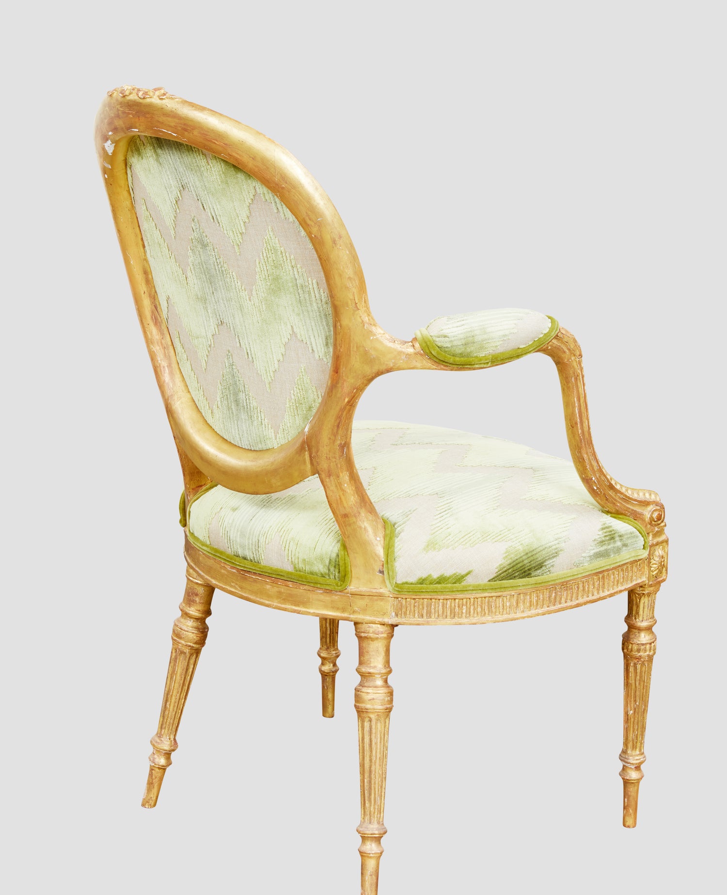 A fine carved and gilded open armchair in the manner of John Linnell with an oval back and carved show wood framewith down swept arms carved with water leave over an upholstered seat having a fluted show wood rail on turned and fluted legs. Circa 1770. Ht. 38", Seat ht. 17.5" W. 24.5", D. 23.5"