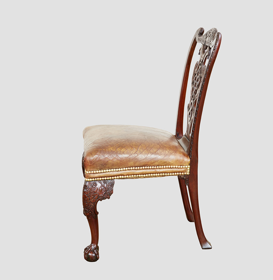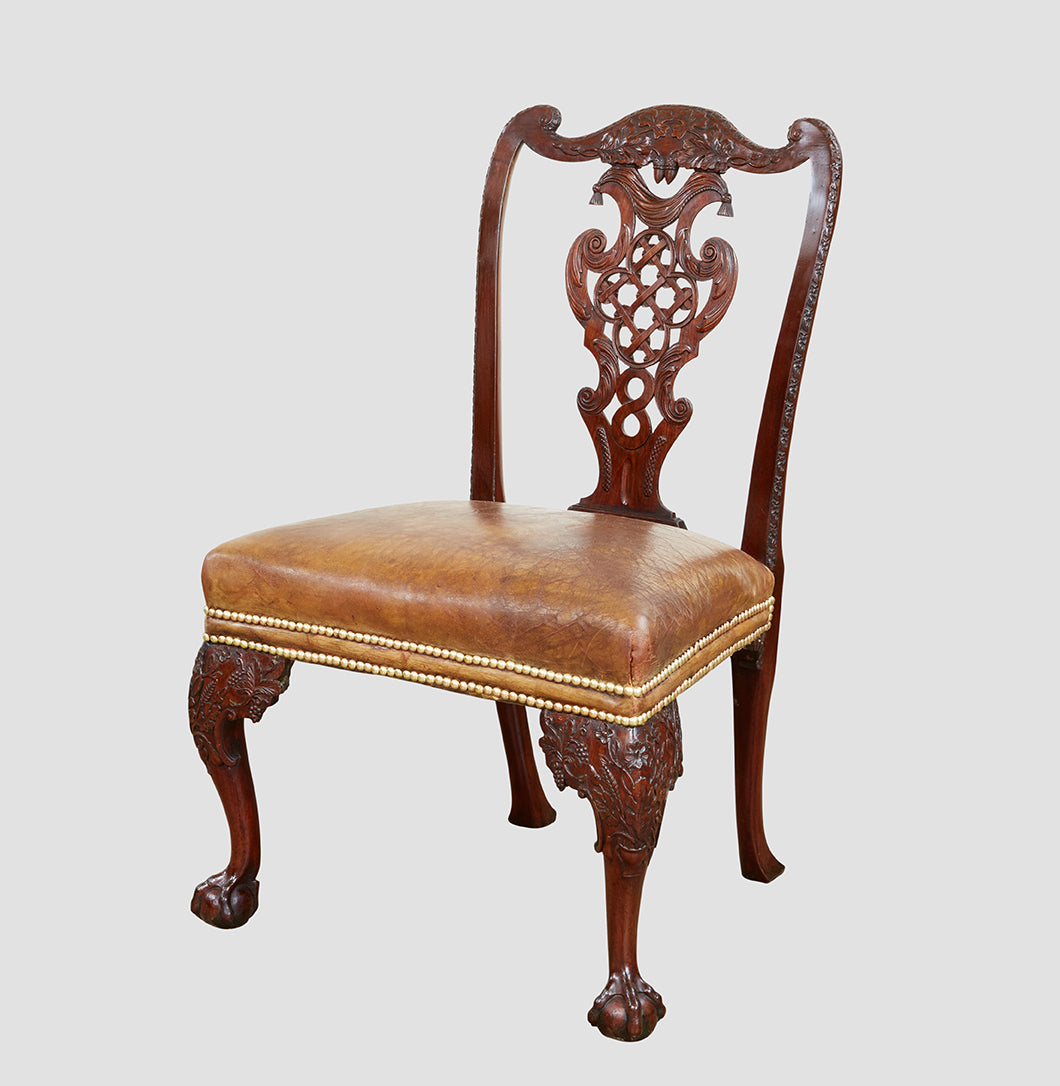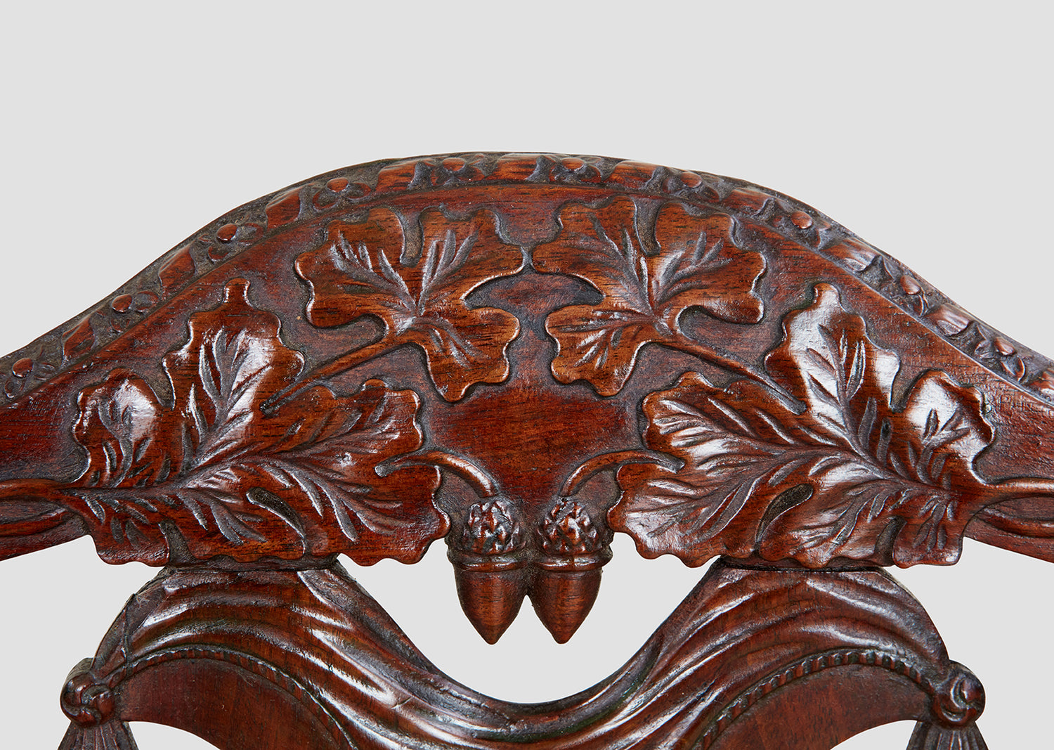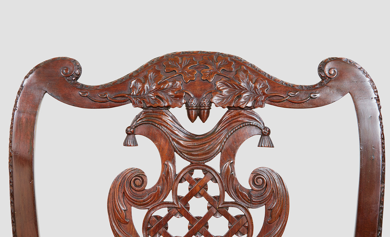 An extraordinary and rare carved mahogany side chair circa 1755, likely part of a dining room set, having a sensationally carved back consisting of carved oak leaves and acorns in the crest rail, the outside edge of the crest and side rails carved with ribbon and flower molding, the back splat of unusual design with a carved swag over four pierced quatrefoils held within c-scrolls carved with foliage having an upholstered over seat, the front with carved cabriole legs also having carved foliage and terminating in ball and claw feet. Repairs to one rail, repairs to the stiles and a new shoe. Ht. 38 3/4”, Seat ht. 18 3/4”, w. 22”, D. 25”