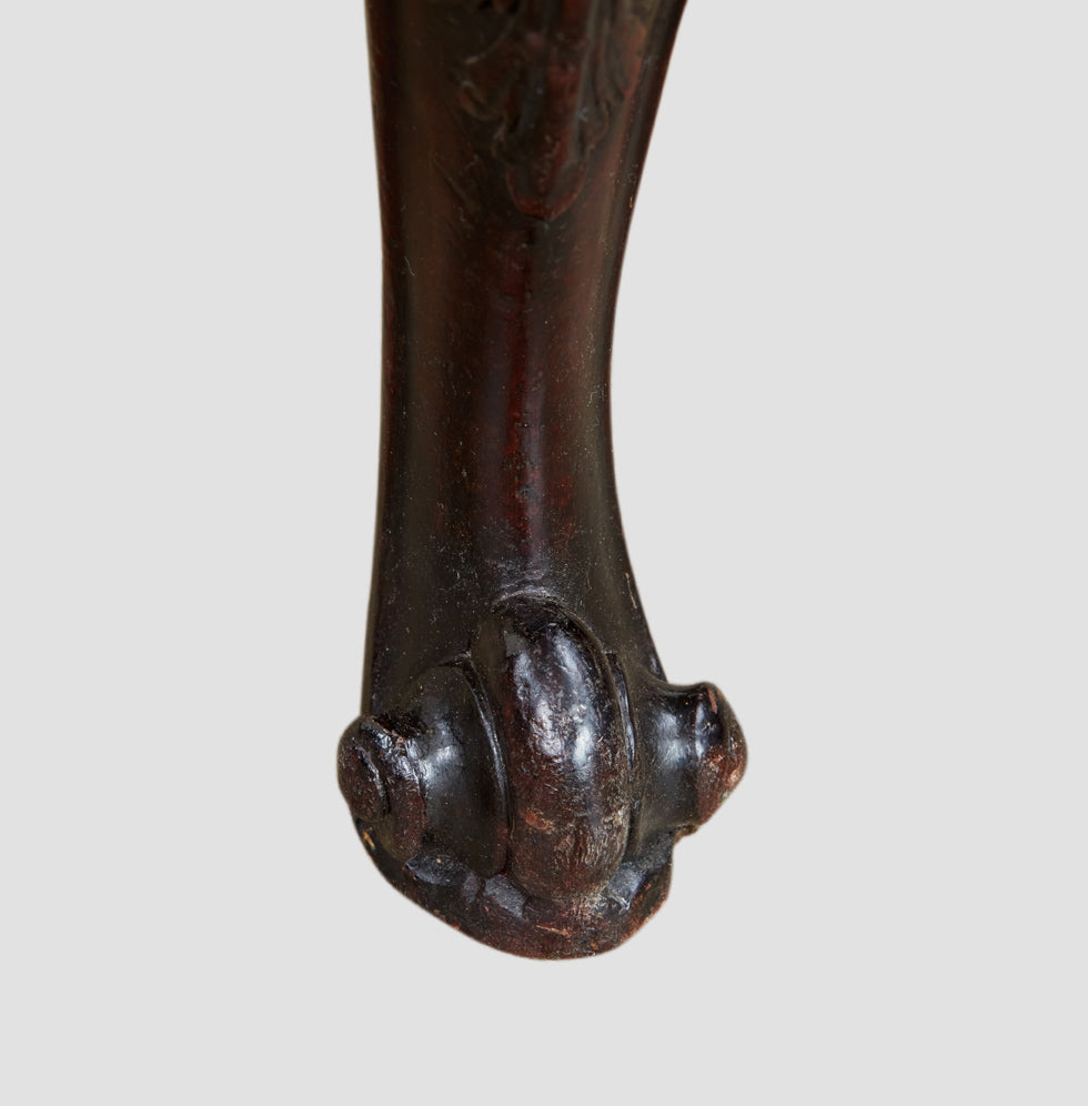 Mahogany open armchair of generous proportions, attributed to John Cobb and/or the St. Martin’s Lane Syndicate. With upholstered seat and back, the back having an unusual bombe shape with padded arms and carved show wood supports, the seat supported by four carved cabriole legs. Circa 1755.Similar examples, Lot 189, Christie’s NY, 12/15/15, Christie’s London, 11/29/01, Lot 90, Christie’s London, 4/19/01, Lot 60) show related traits to this example. Ht. 391/4”, Seat ht. 15 1/2”, W. 30” D. 29 1/2”
