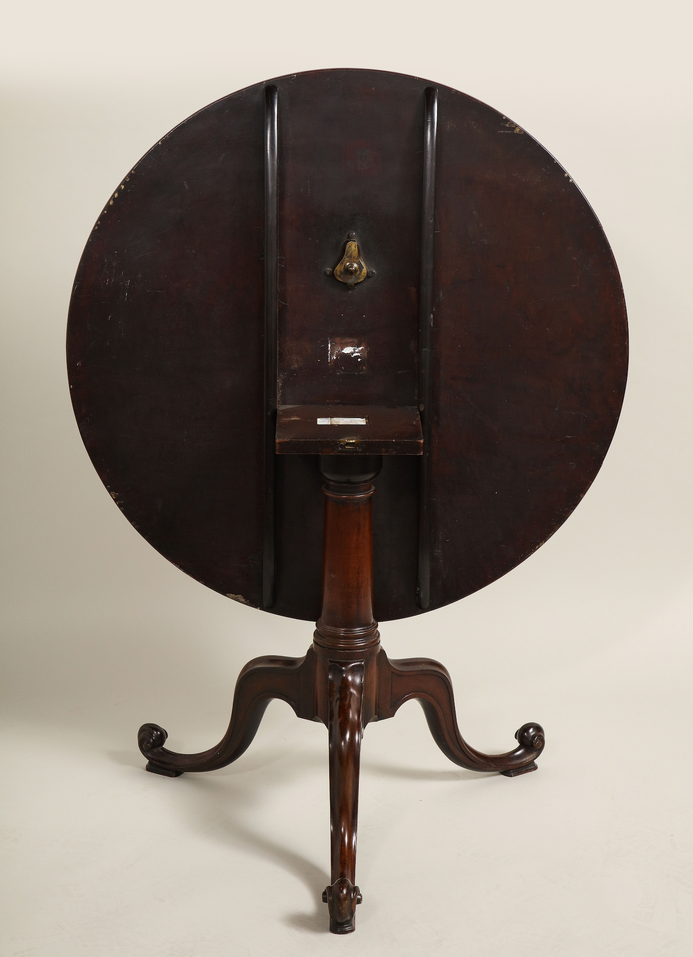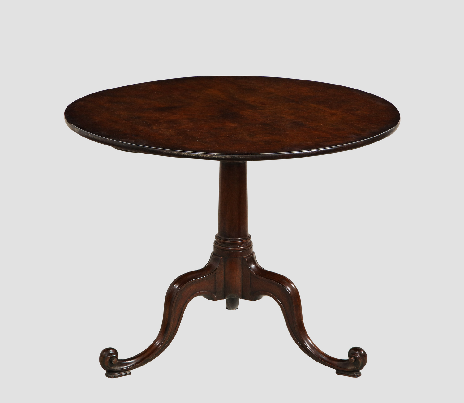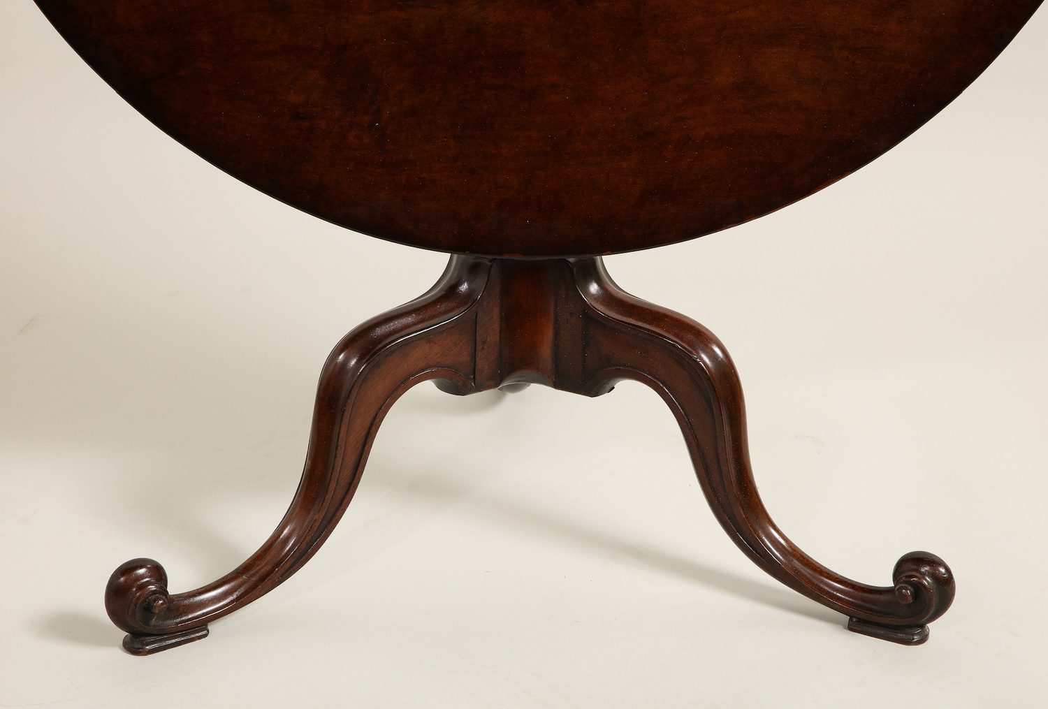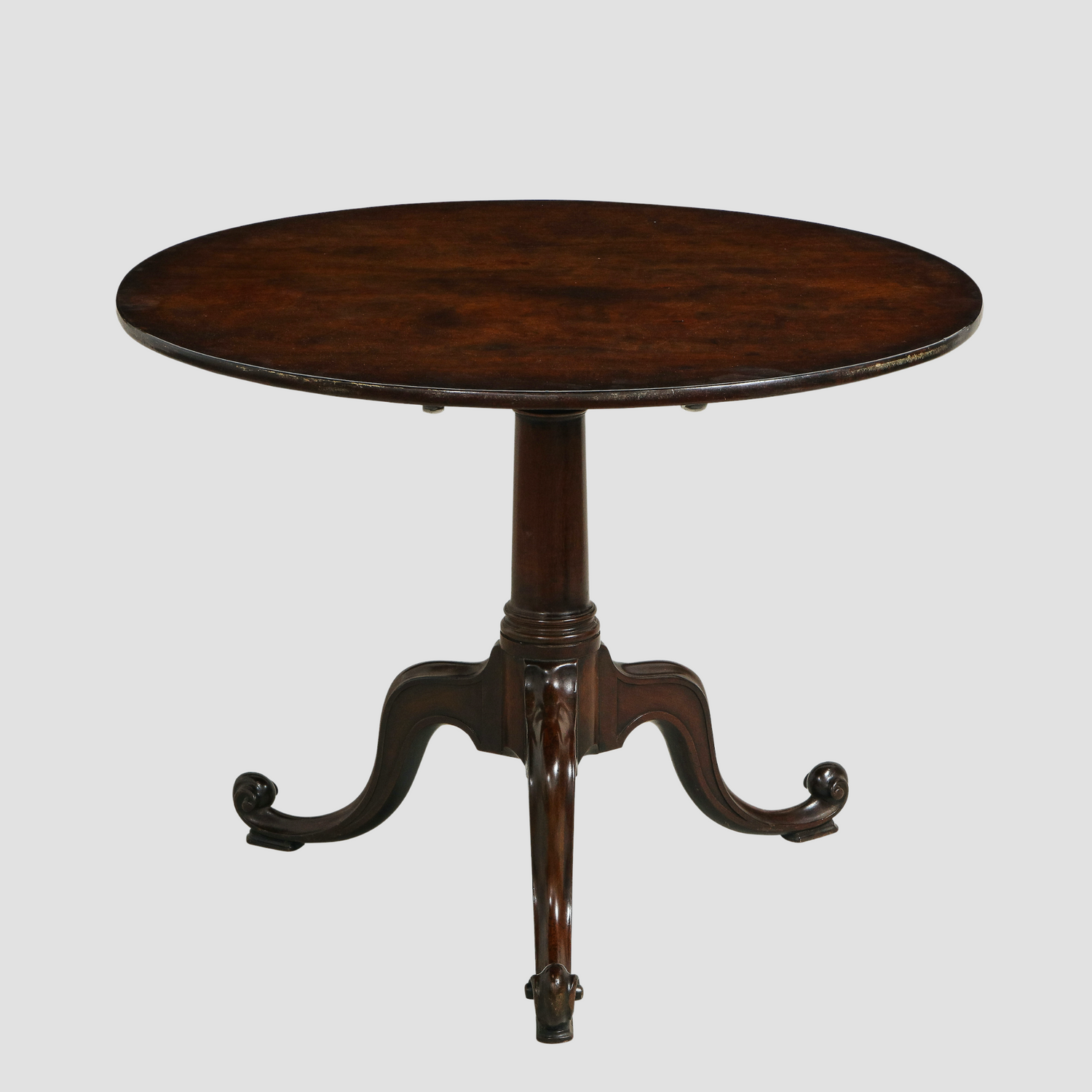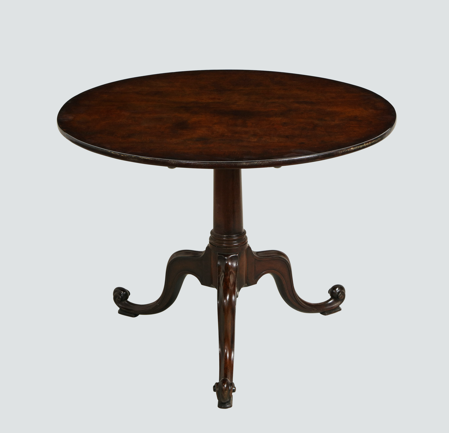 A fine mahogany tripod table in the manner of Thomas Chippendale with a single board plum pudding mahogany top, resting on a single turned pillar having carved cabriole legs, molded and carved, terminating on inward scrolls. English circa1760. Ht. 27.625", Dia. 36.33"