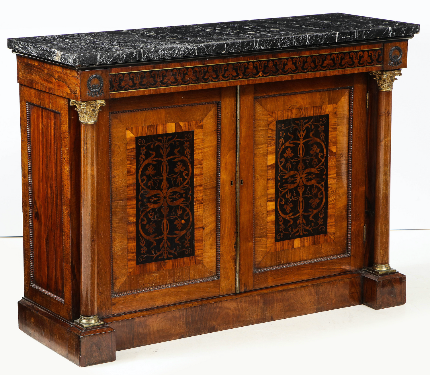 An extremely fine cabinet/commode in the manner of George Bullock. The form, with the outset columns flanking the double doors which are inlaid, with brass embellishments are all typical of Bullock's work. The marble top is probably original. Circa 1815 Ht. 38 3/4", W. 51 1/4", D. 18"