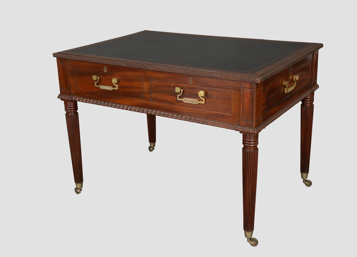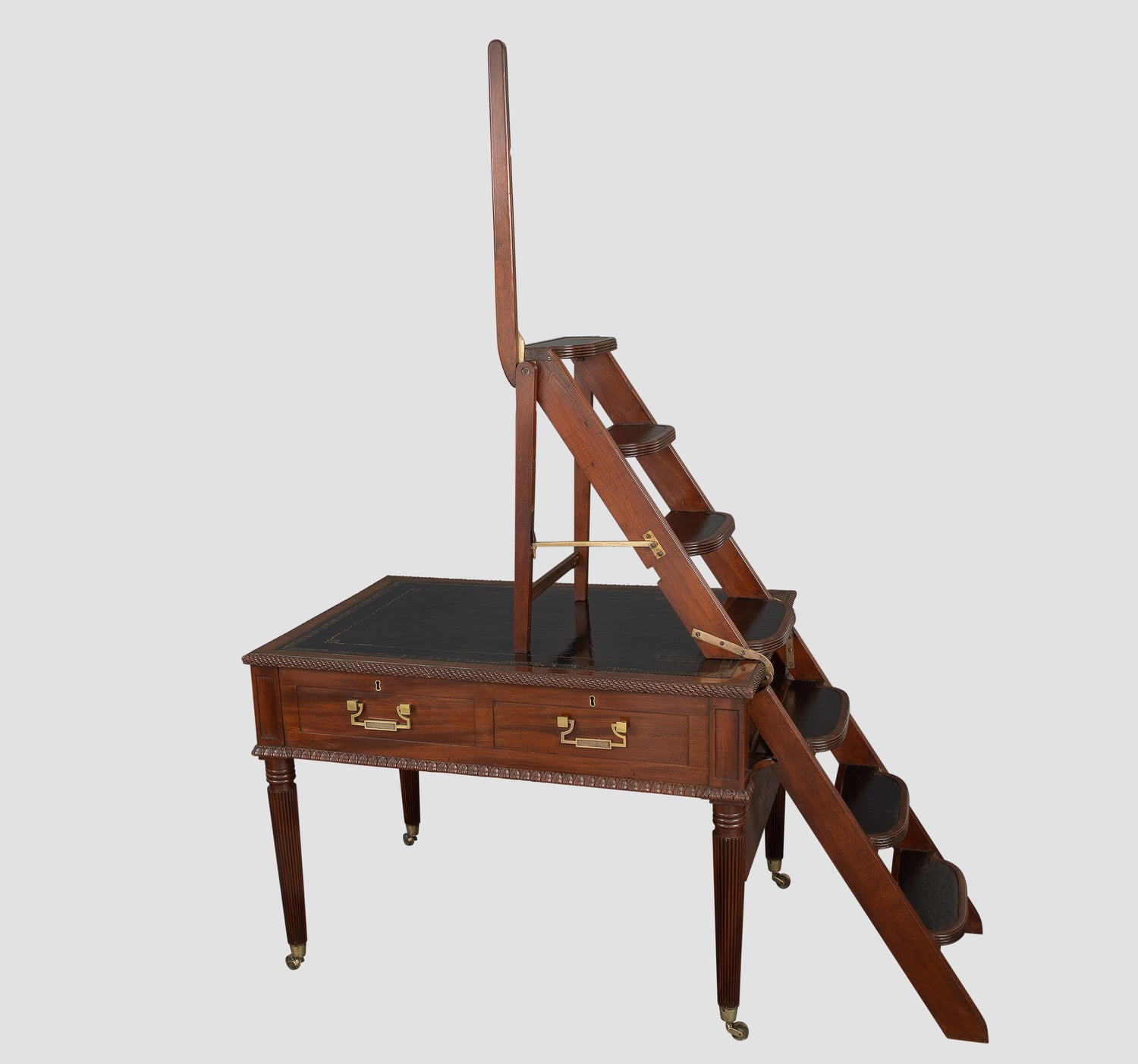 Metamorphic mahogany writing table with leather inset top, with a carved rope twist molding having an end drawer opening up for the ladder, the other drawers all dummy drawers, on turned, reeded legs terminating in casters. Of exceptional quality, the table is en suite with the writing table advertised by Mallett of Bath (see description on library table with similar gilt brass handles).