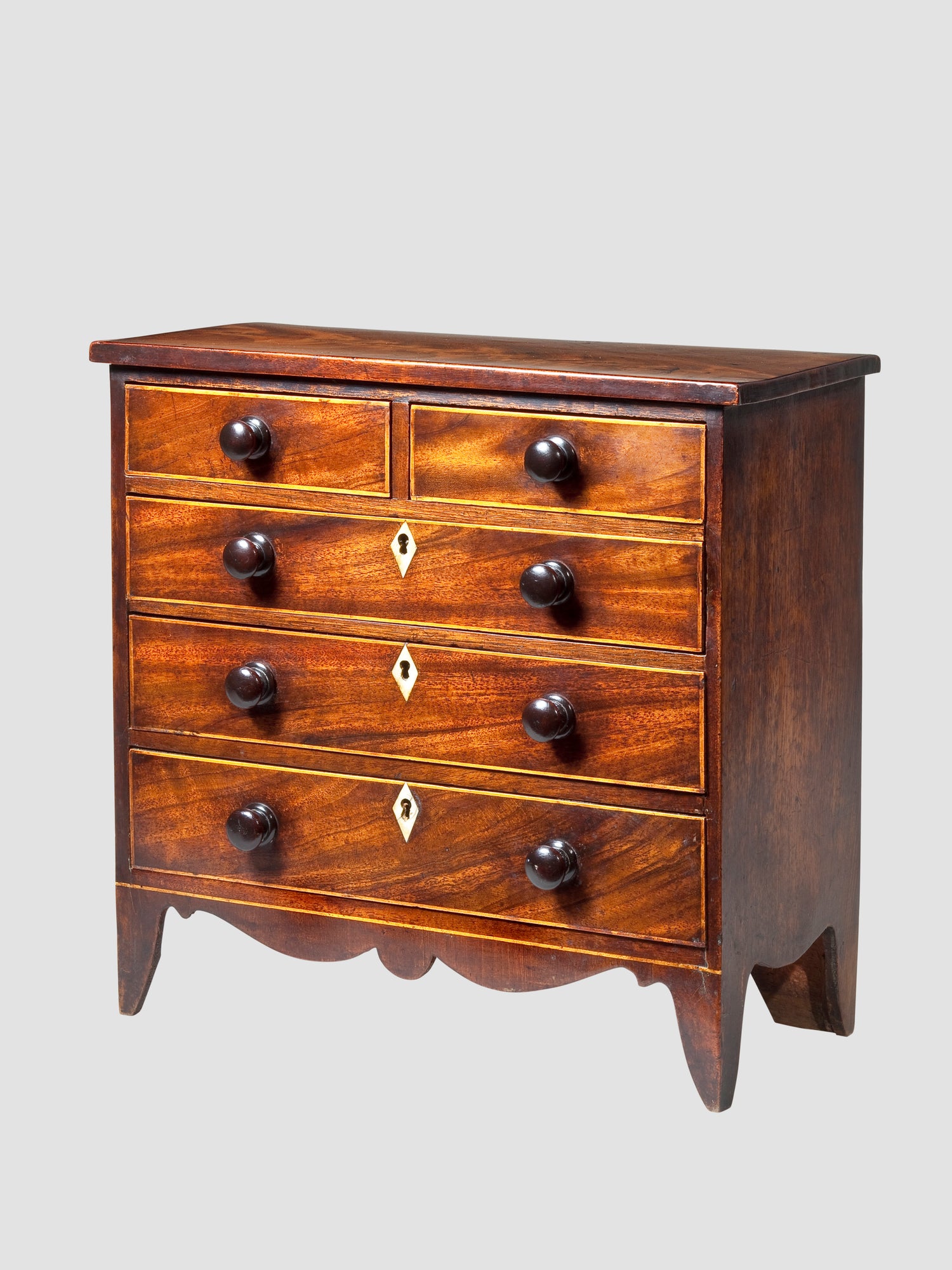 A charming miniature Regency mahogany chest of drawers in the Sheraton style with two short drawers over three long drawers on bracket feet with a shaped apron.Ht. 13.5", W. 14.125", D. 6.75"