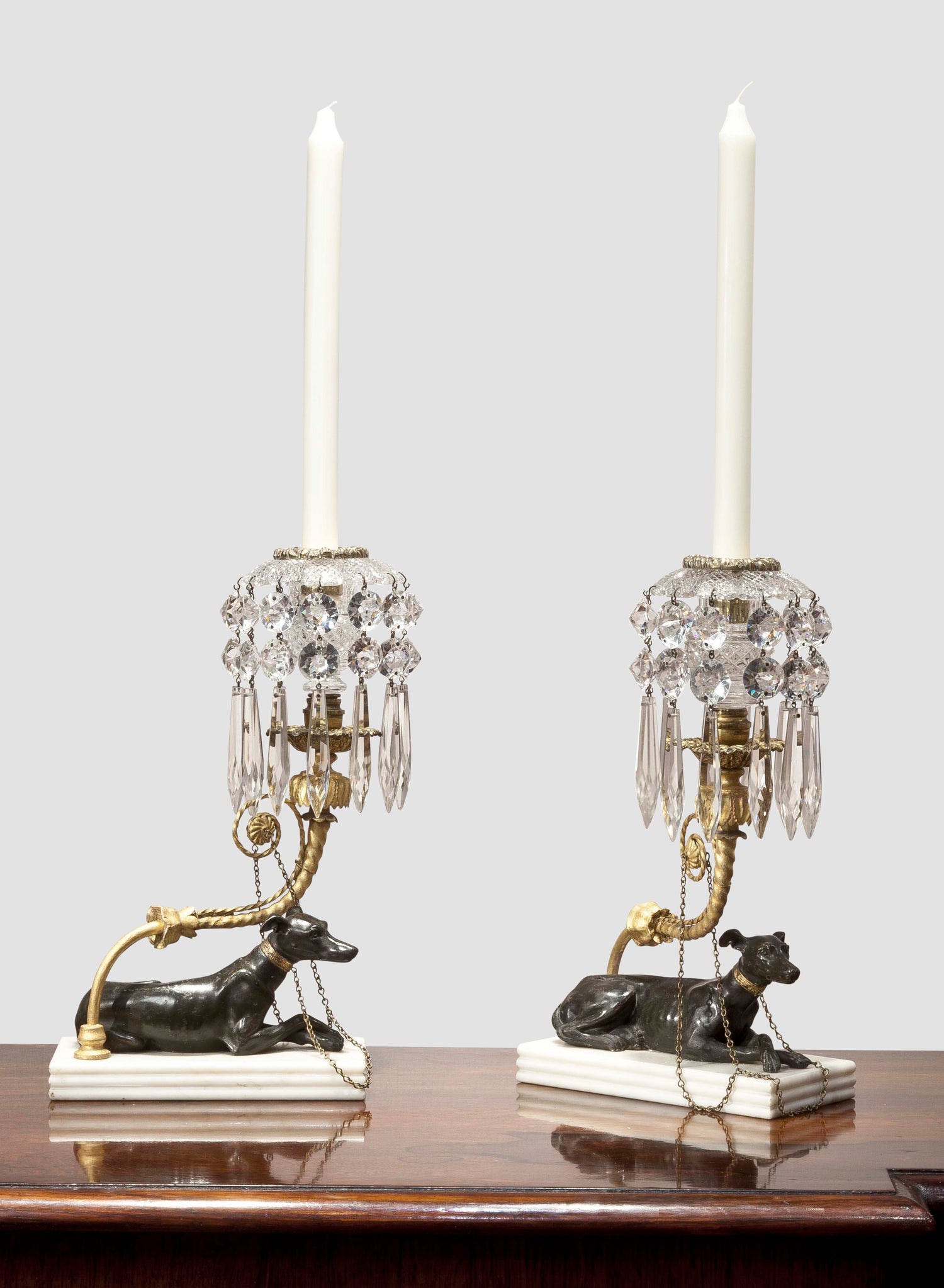 A fine pair of Regency greyhound candlesticks having crystal drops shading the greyhounds on a reeded white marble base. English circa 1810. Ht. 12" W. 7", D. 3.75"