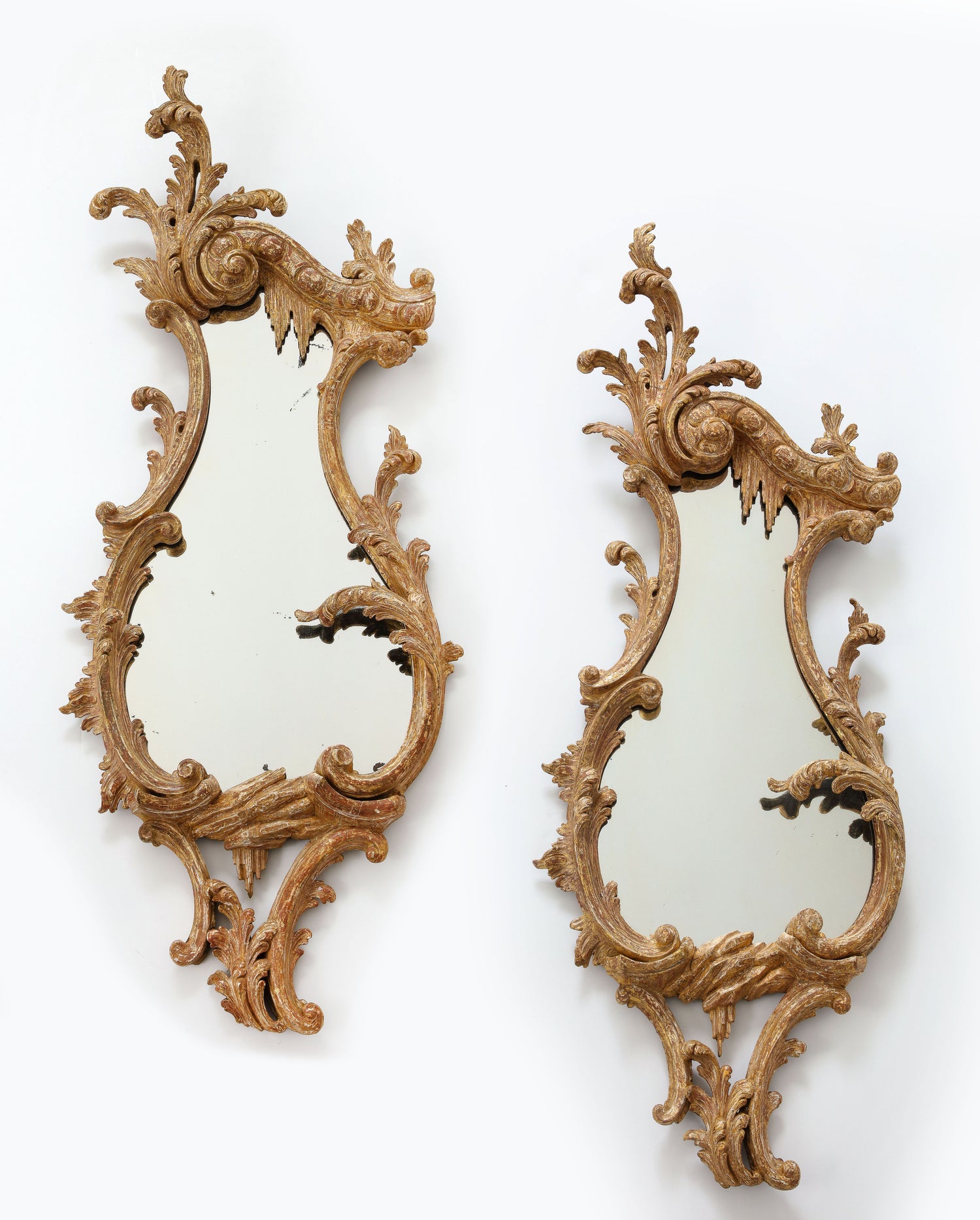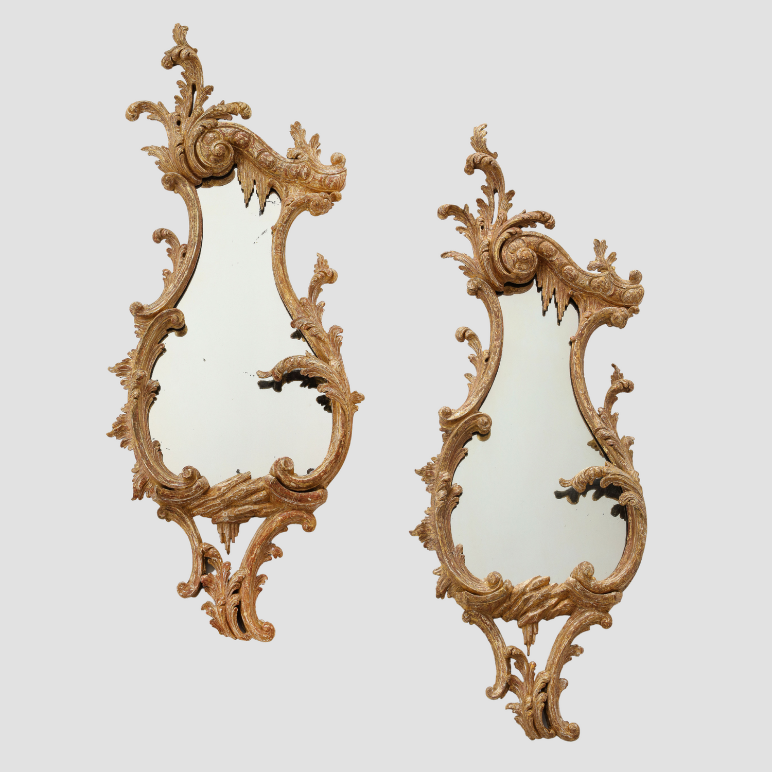 Pair of carved rococo cartouche shaped looking glasses c. 1755