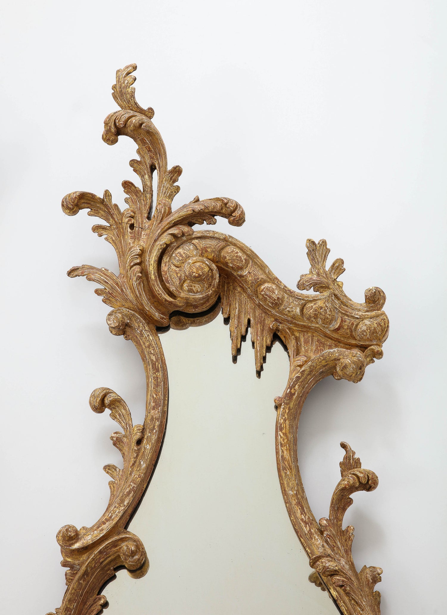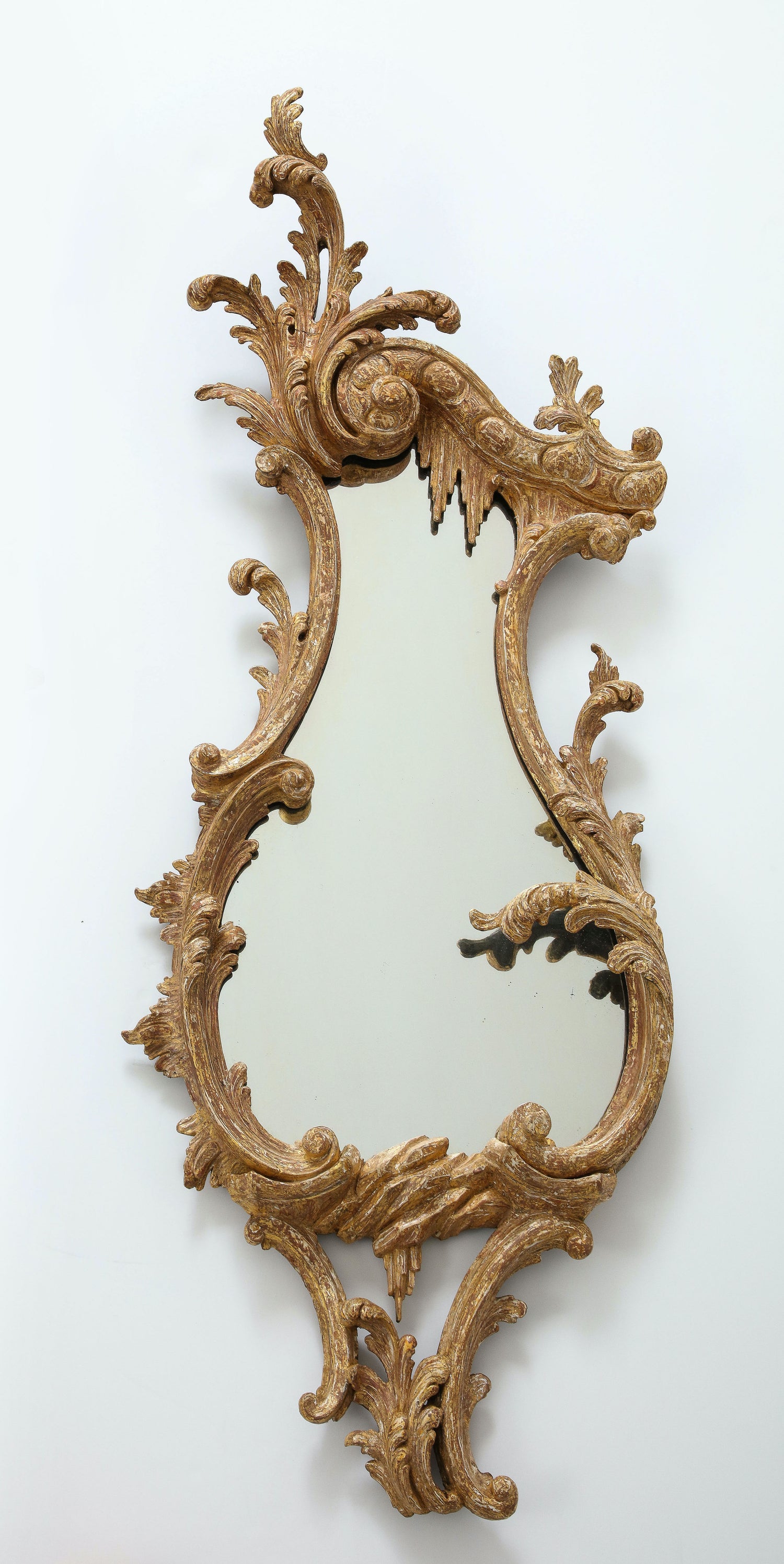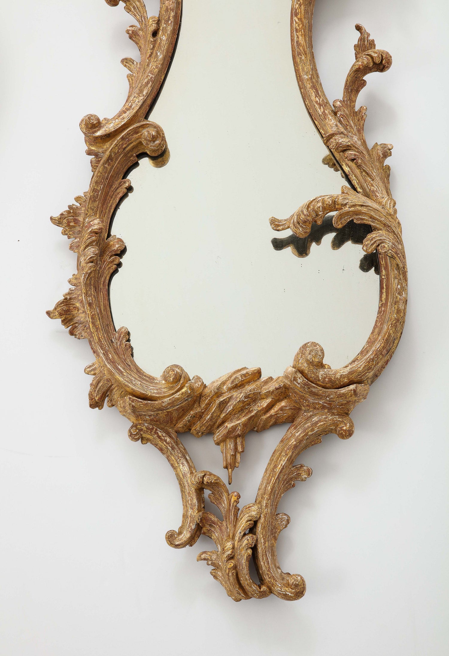 A fine pair of English, carved rococo cartouche shaped looking glasses circa 1755 designed of c-scrolls and s-scrolls, crested with an acanthus spray, one scroll carved with egg and dart having acanthus sprays and rocaille, the frame with numerous sprays, the scrolls meeting at the base bracketing rocks and rocaille trailing down with further scrolls and terminating in a final acanthus spray. Gilding is both dry stripped and refreshed. The mirror plates are not original. Ht. 39 1/4" W. 15 1/2"