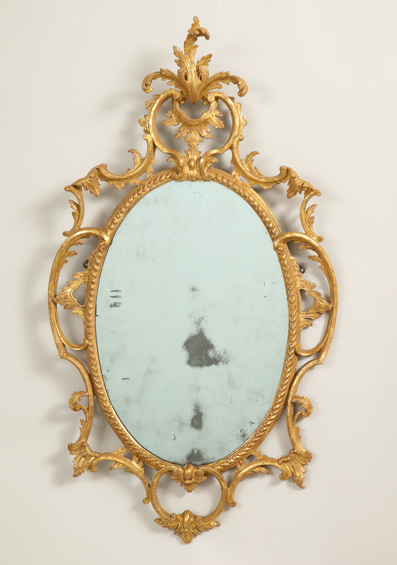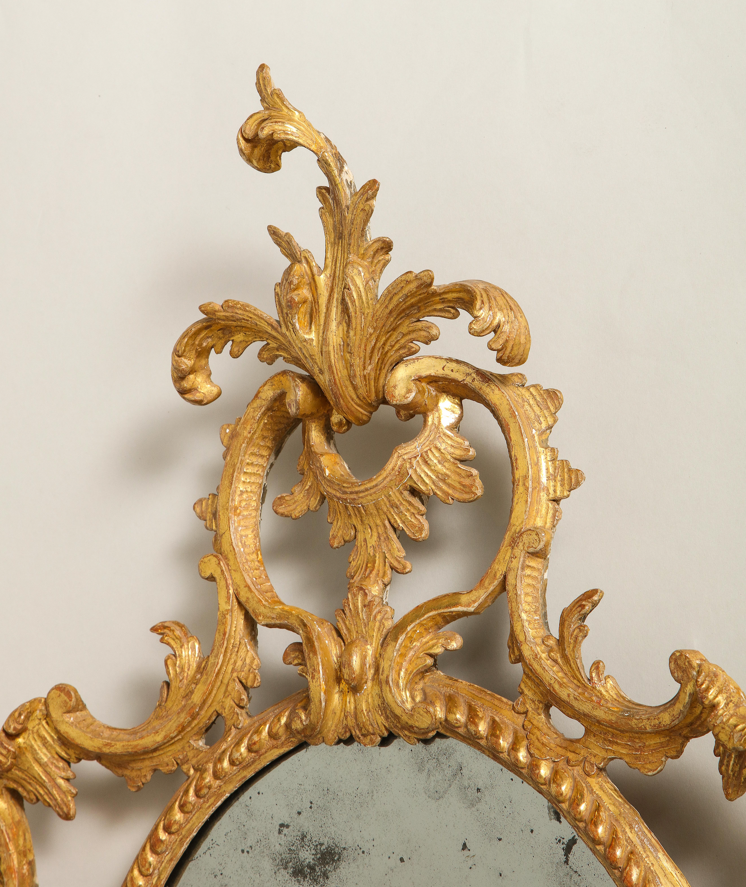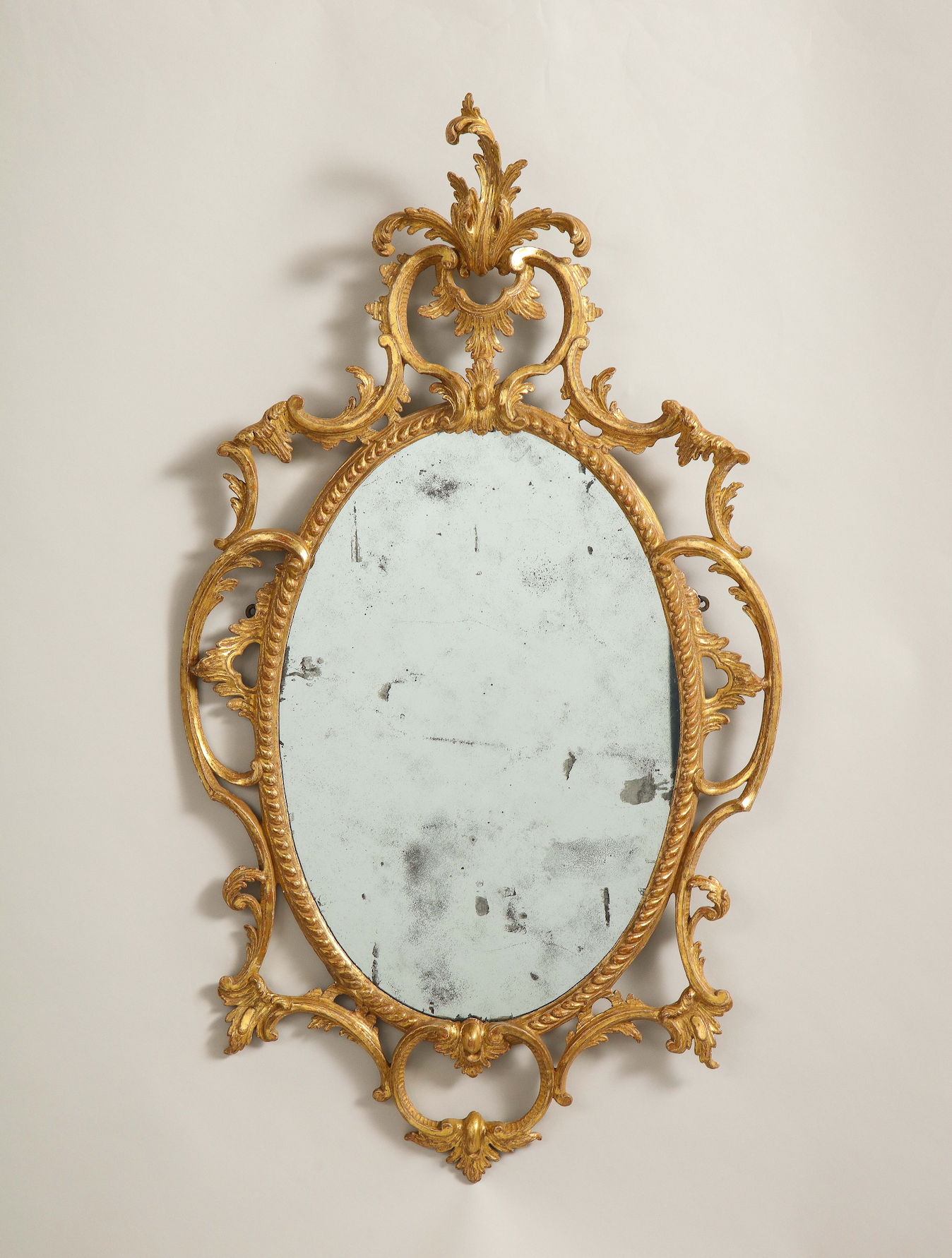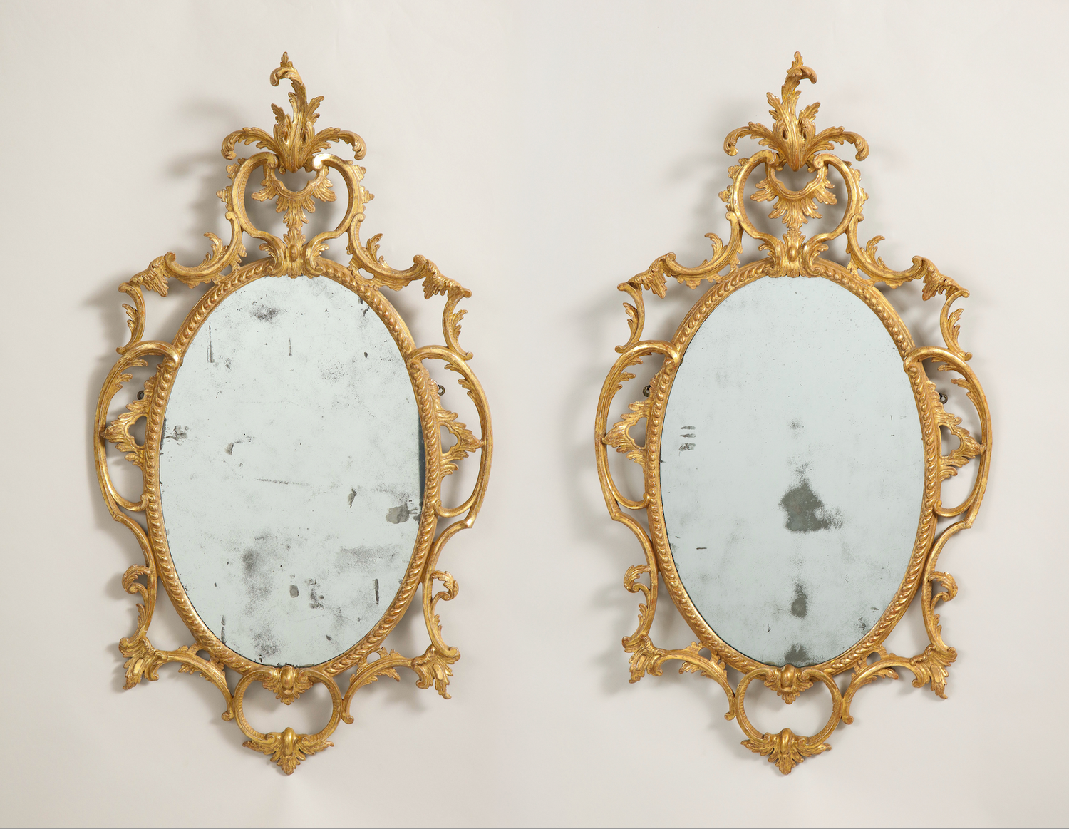 A good pair of carved rococo looking glasses crested with a leaf spray and flanked by carved s-scrolls and c-scrolls with icicles and other carved conceits and having period plate glass. Circa 1755. Ht. 41 1/2" Width 22 7/8" Ex. Coll. J.J. Wolff (Antiques) Ltd.Ht. 41" W. 22 5/8" Re-gilded.