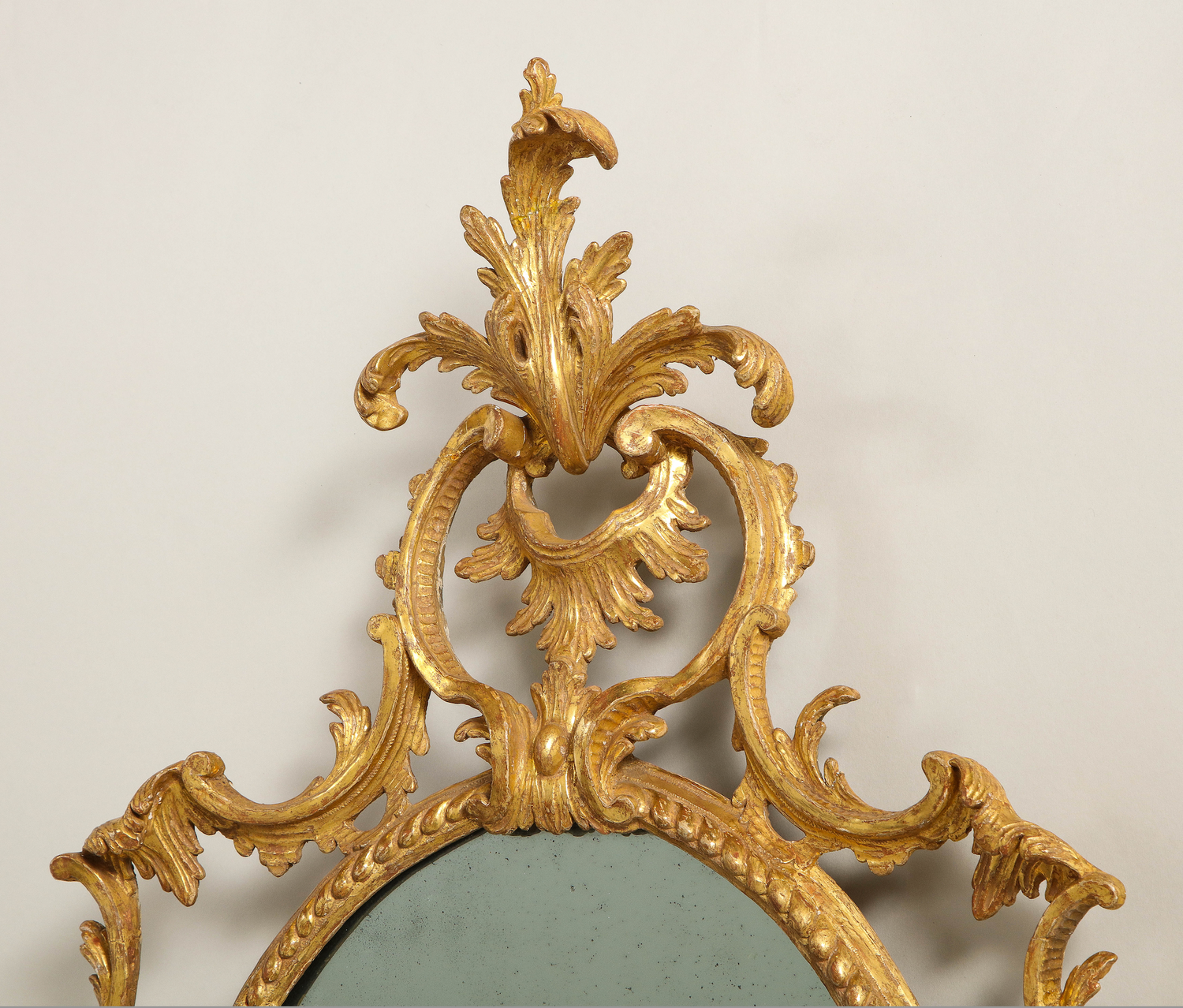 The rococo design period on furniture (on silver it was much earlier) ran from roughly 1740-60. That does not mean that rococo frames weren't made after that date, the liveliness of the rococo elements were toned down a bit. This pair of mirrors could date as early as 1755 but also as late as 1770 as the gadroon molding around the frame was in constant use in that time period.