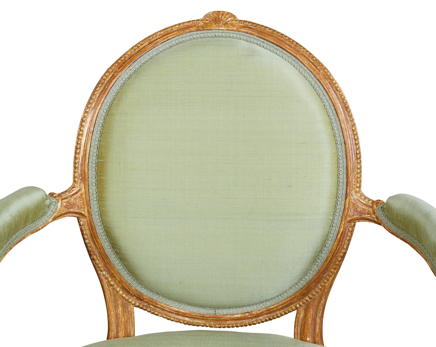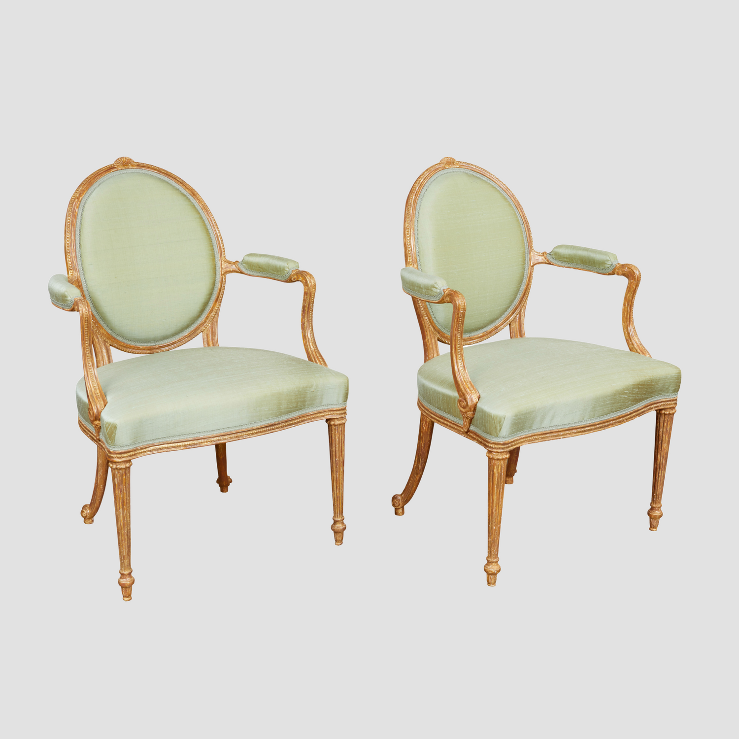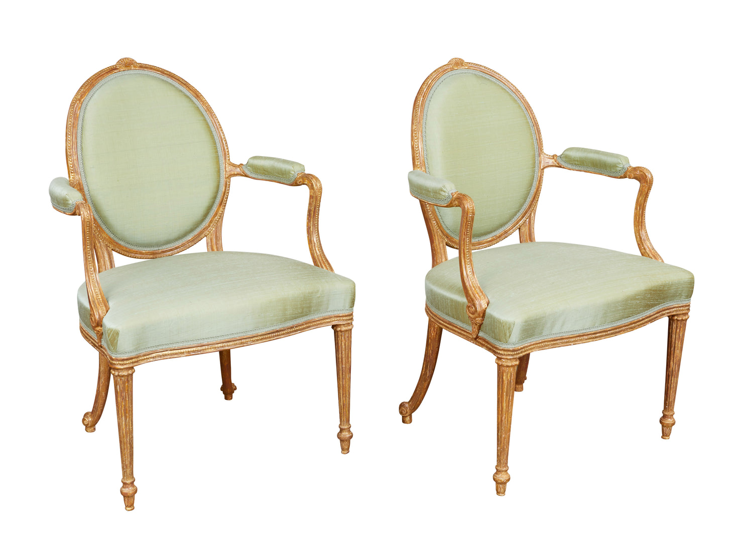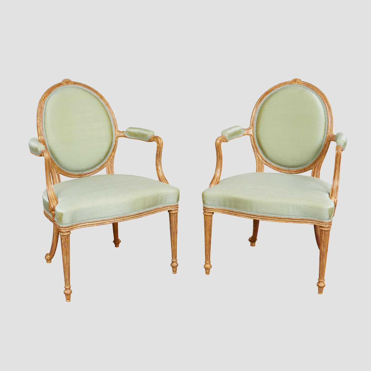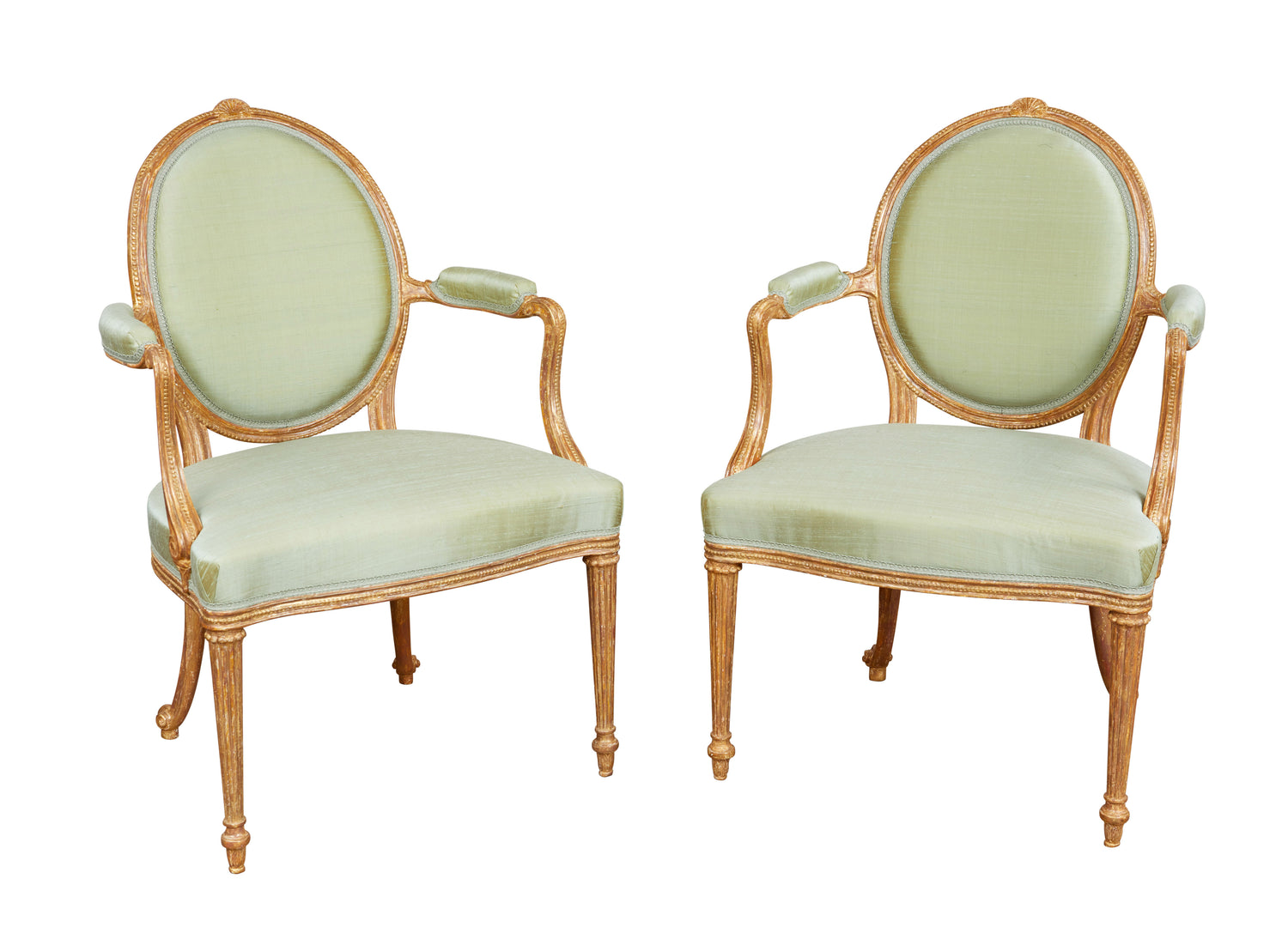 A fine pair of carved and gilded open armchairs in the manner of Thomas Chippendale, the gilding original but refreshed. Having oval backs with a carved and moulded rim crested with a stylized acanthus leaf and carved bead, the arms and their supports also shaped and molded with a carved bead with padded arm rests, the supports with a carved scroll, the seat having a show wood rail also molded with a carved bead, the front legs turned and reeded with collars above carved acanthus leaves at the foot, the rear legs terminating in scrolls. Circa 1775. Ht. 36 1/2", W. 23 1/2", D. 1`9 1/4", Seat ht. 17 1/4"