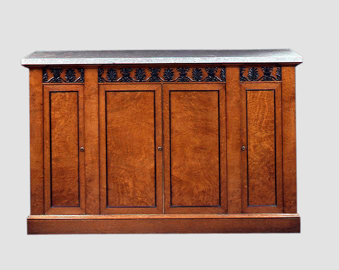 Pair of pollard oak cabinets with later fossilized tops having an apron with ebonized, carved stylized acanthus over recessed paneled doors on a plinth base. In the manner of George Bullock. English circa 1810. Ht. 38" W. 60.25", D. 15.25"