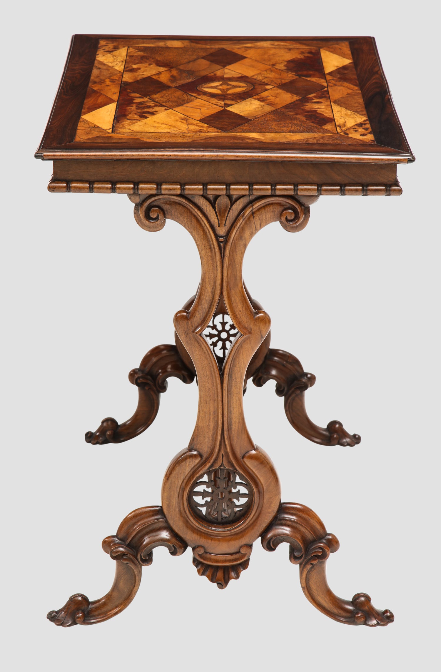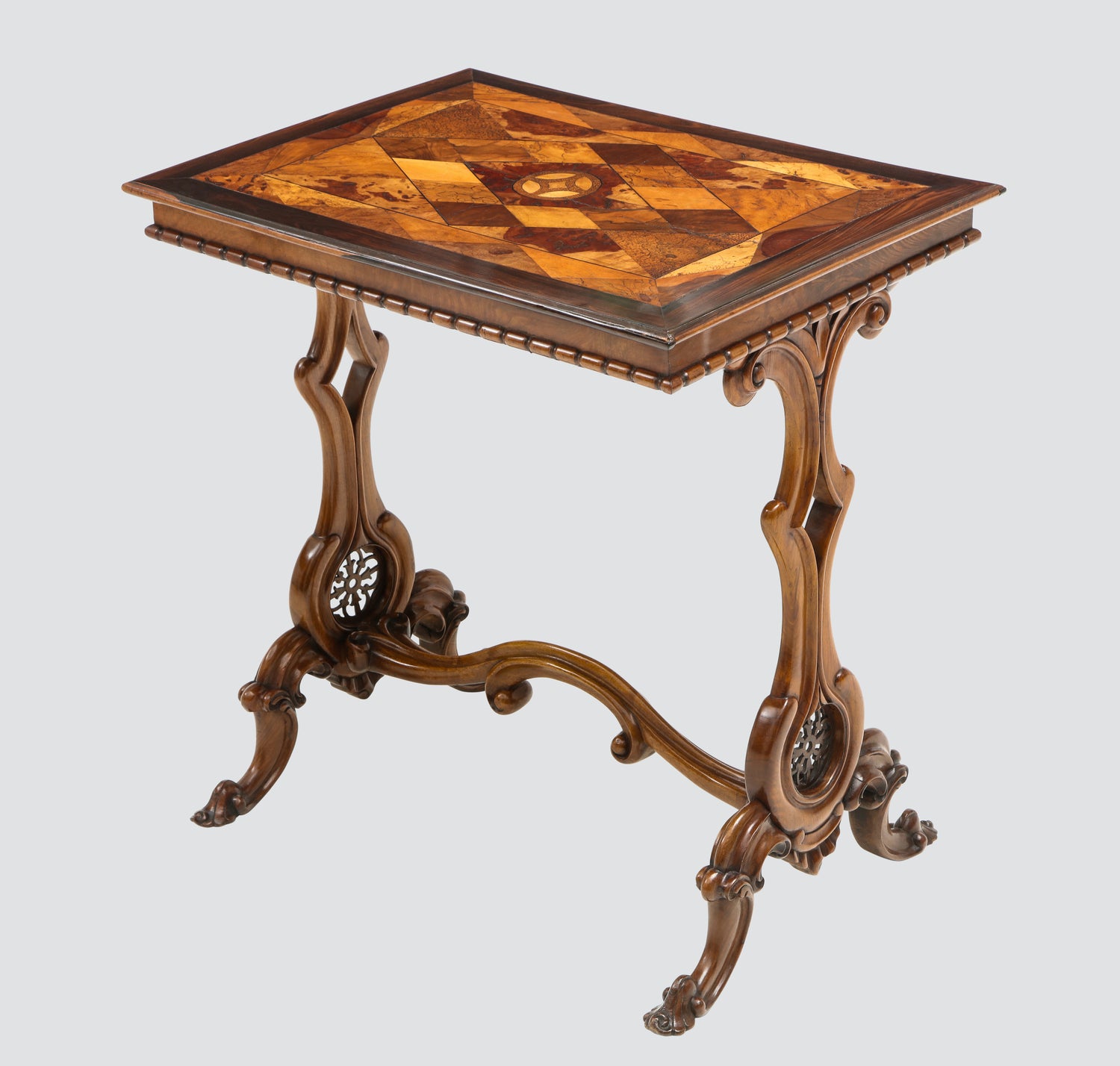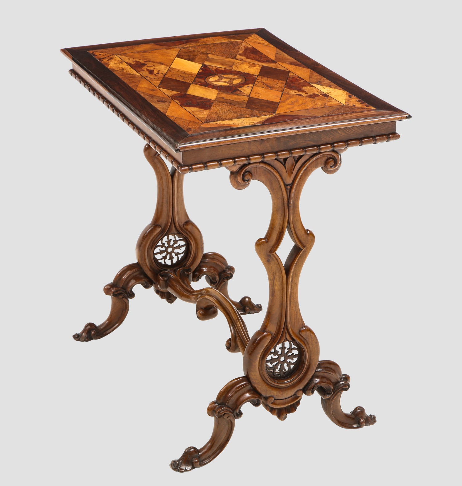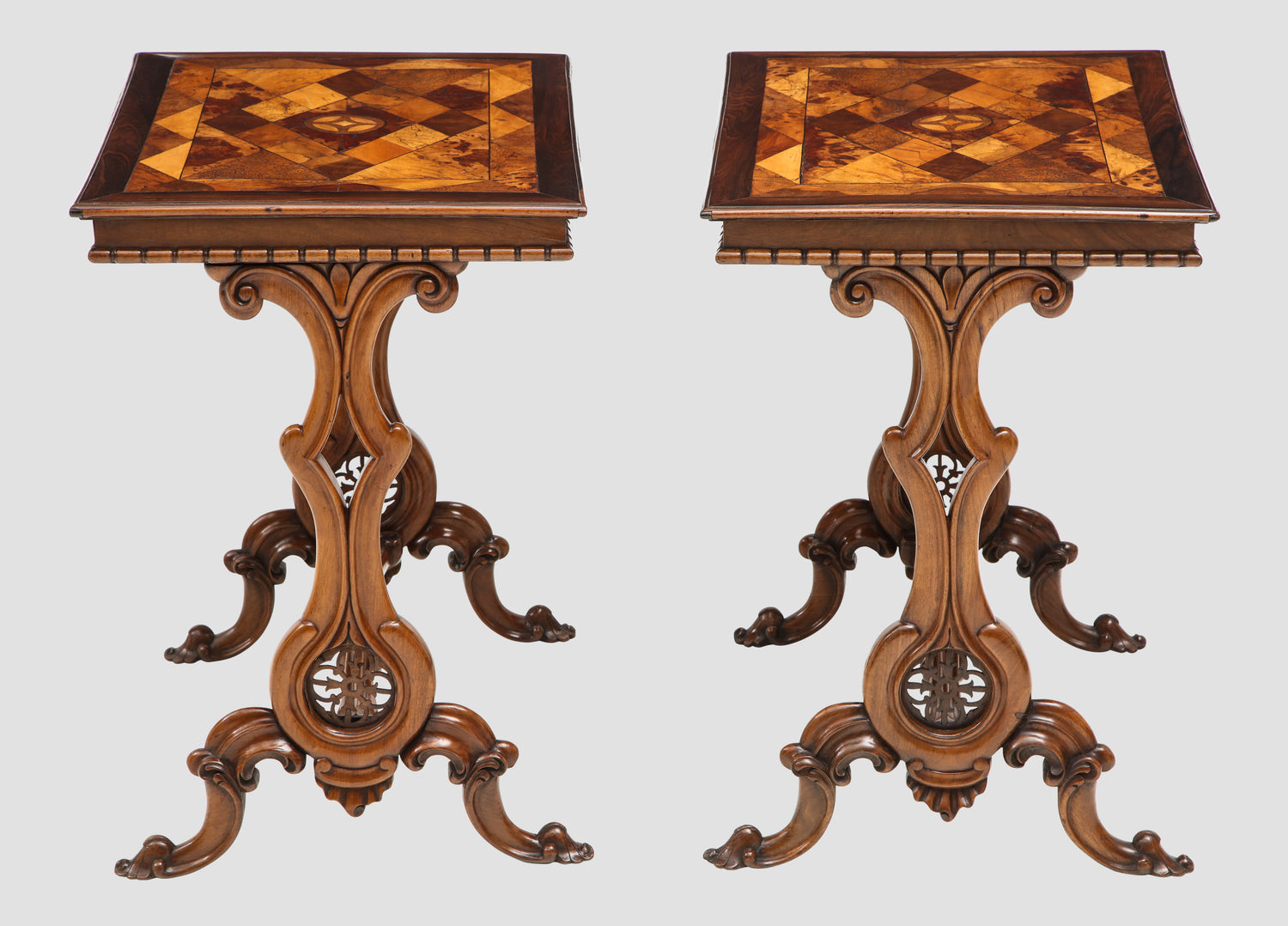 An unusual pair of Victorian specimen wood parquetry occasional tables by Ralph Turnbull, set on carved trestle bases made up of c-scrolls and s-scrolls with a carved stretcher, the legs of carved scrolls. English circa 1860. Ht. 28.25", W. 27.75", D. 20"