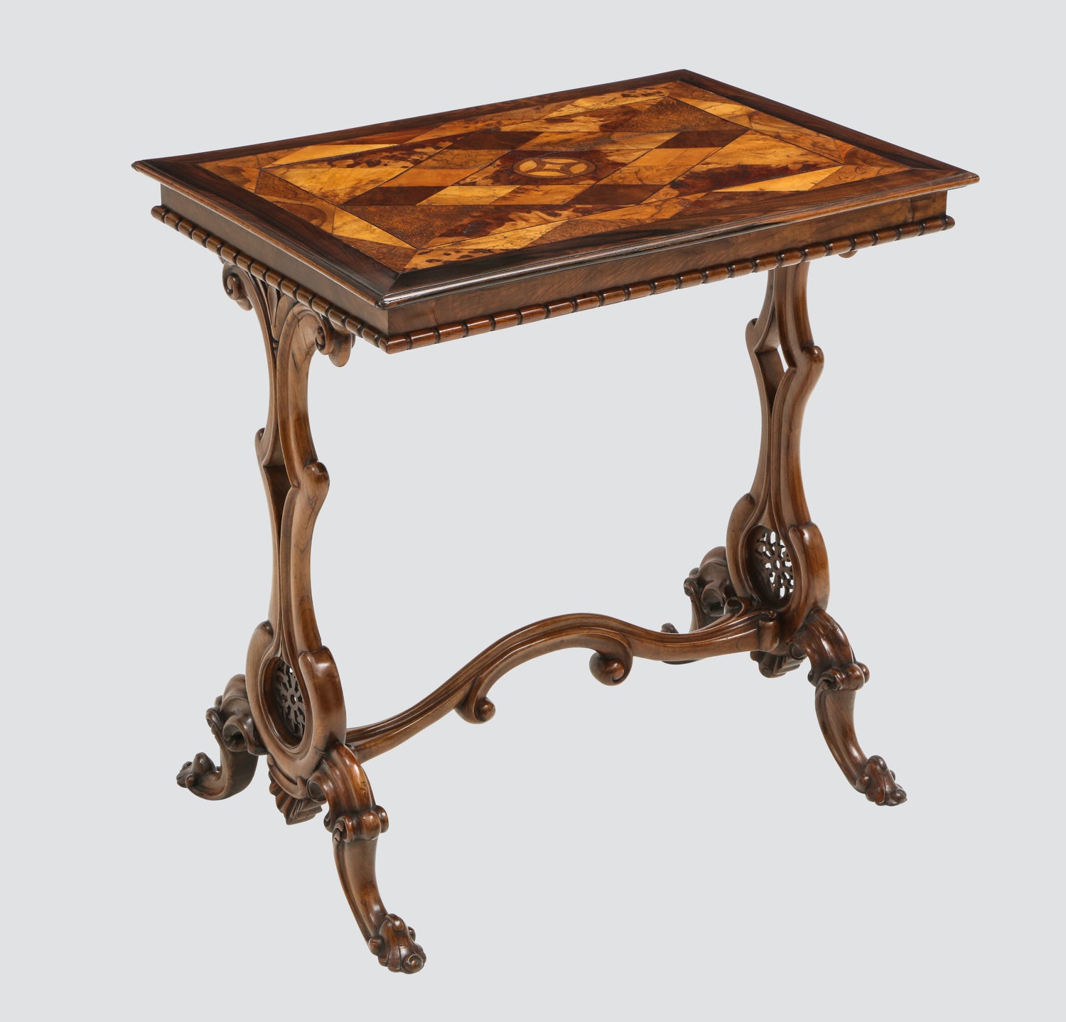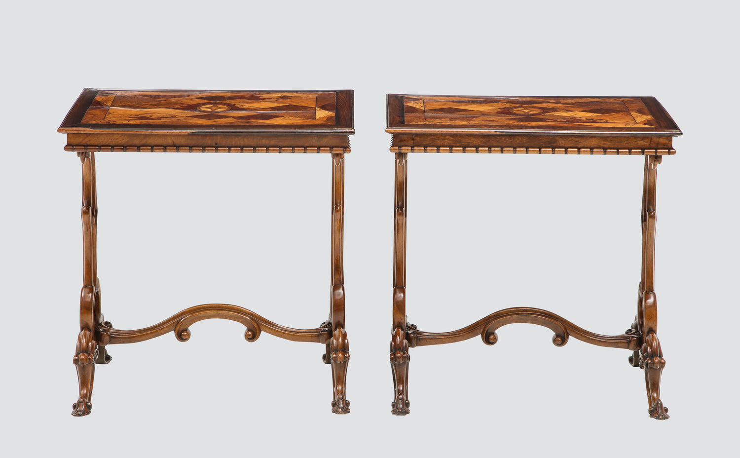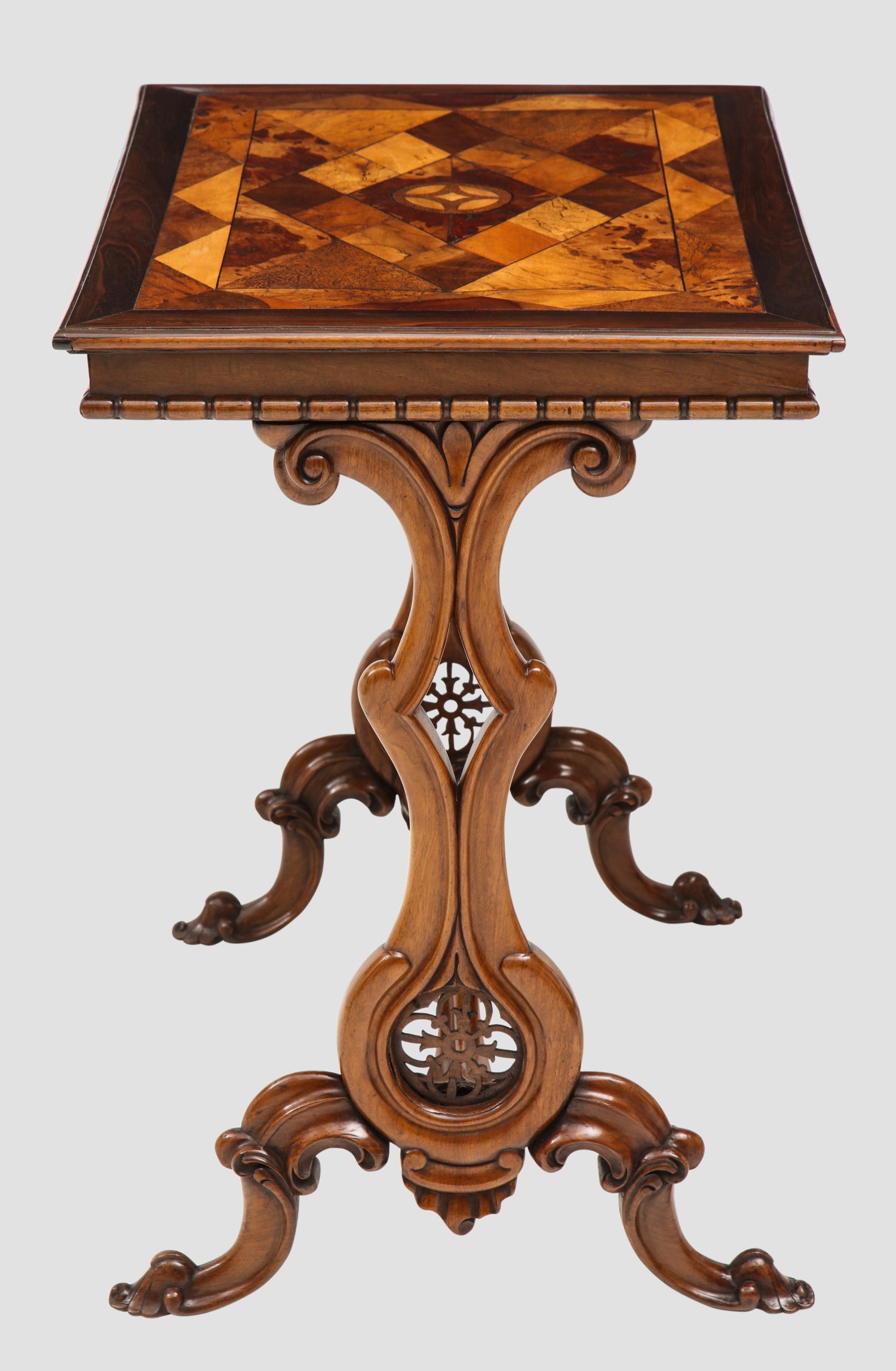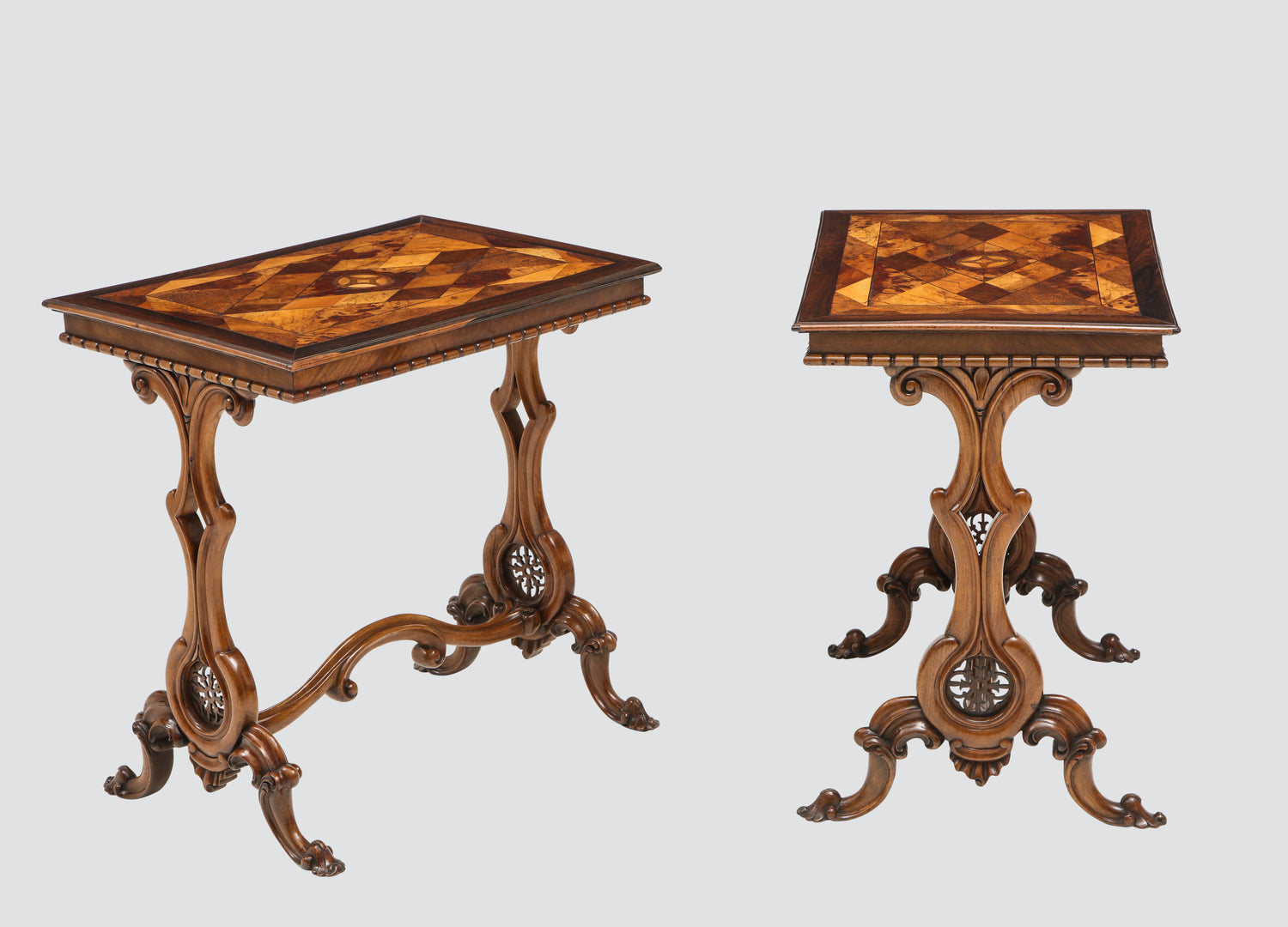 An unusual pair of Victorian specimen wood parquetry occasional tables by Ralph Turnbull, set on carved trestle bases made up of c-scrolls and s-scrolls with a carved stretcher, the legs of carved scrolls. English circa 1860. Ht. 28.25", W. 27.75", D. 20"