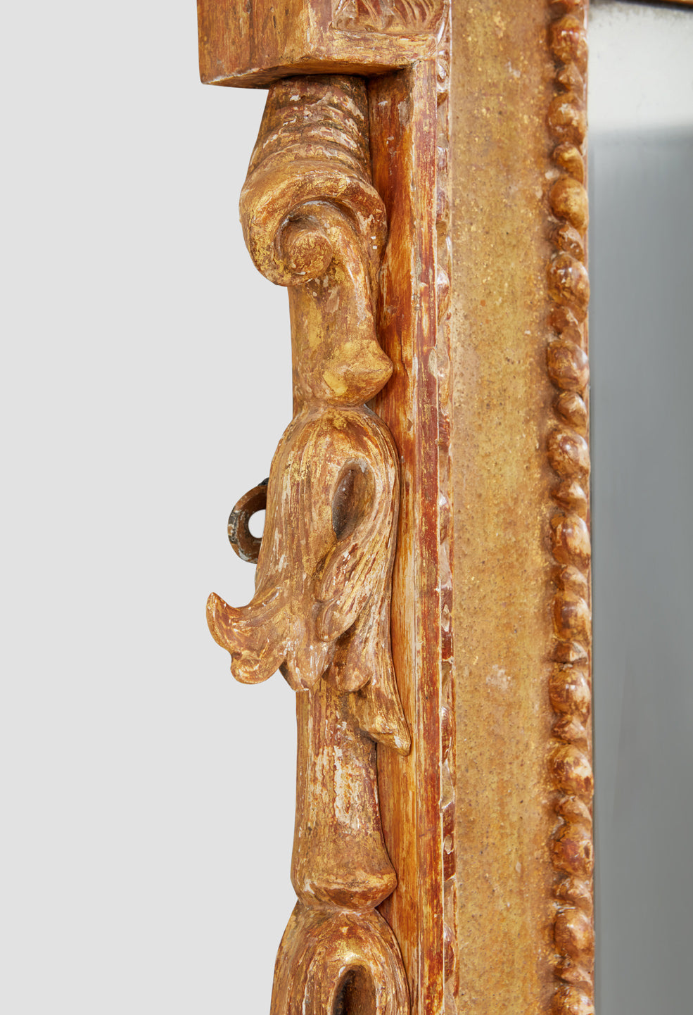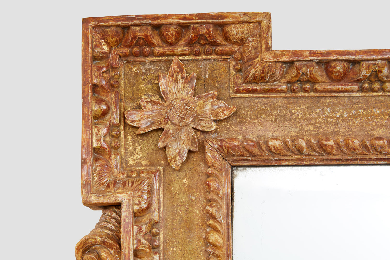 A fine Palladian gilt wood frame circa 1740 having four outset corners with quatrefoil rosettes in each corner and floral drops down each side with egg and dart molding bordered by bead and reel molding and sanded gilding on the flat, the glass surrounded by gadroon molding. The frame is substantially deep. Gilding is dry stripped, patched and refreshed where necessary. Glass mirror plate is old but likely not original. Ht. 50 3/4”, W. 34 7/8”