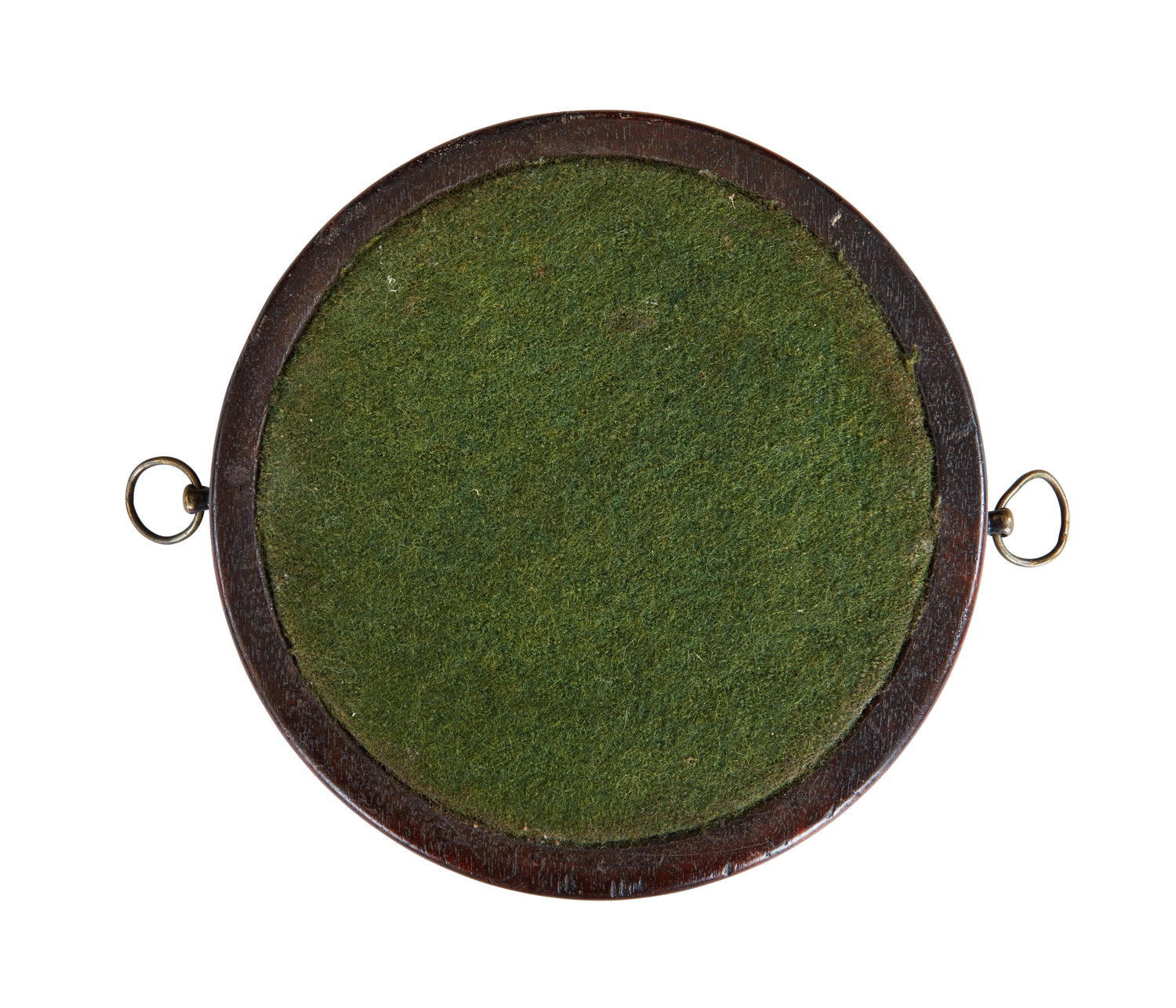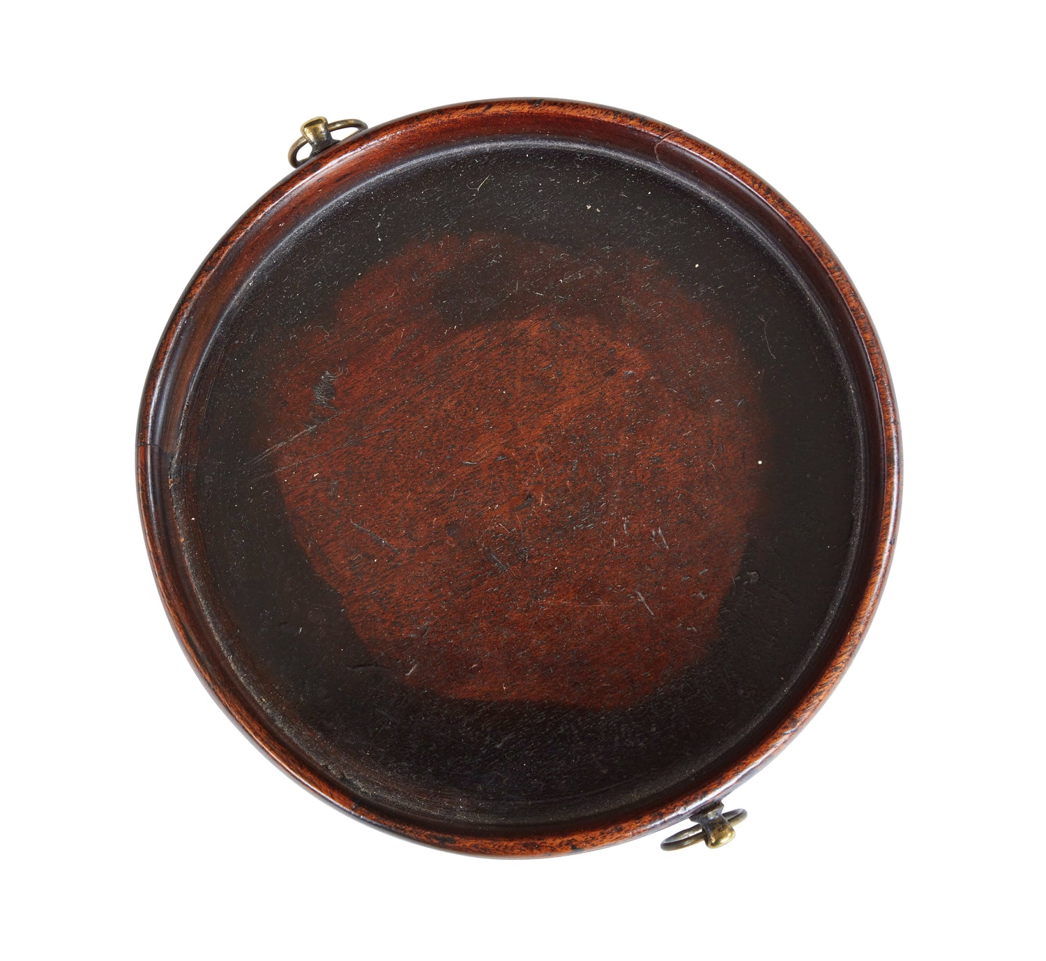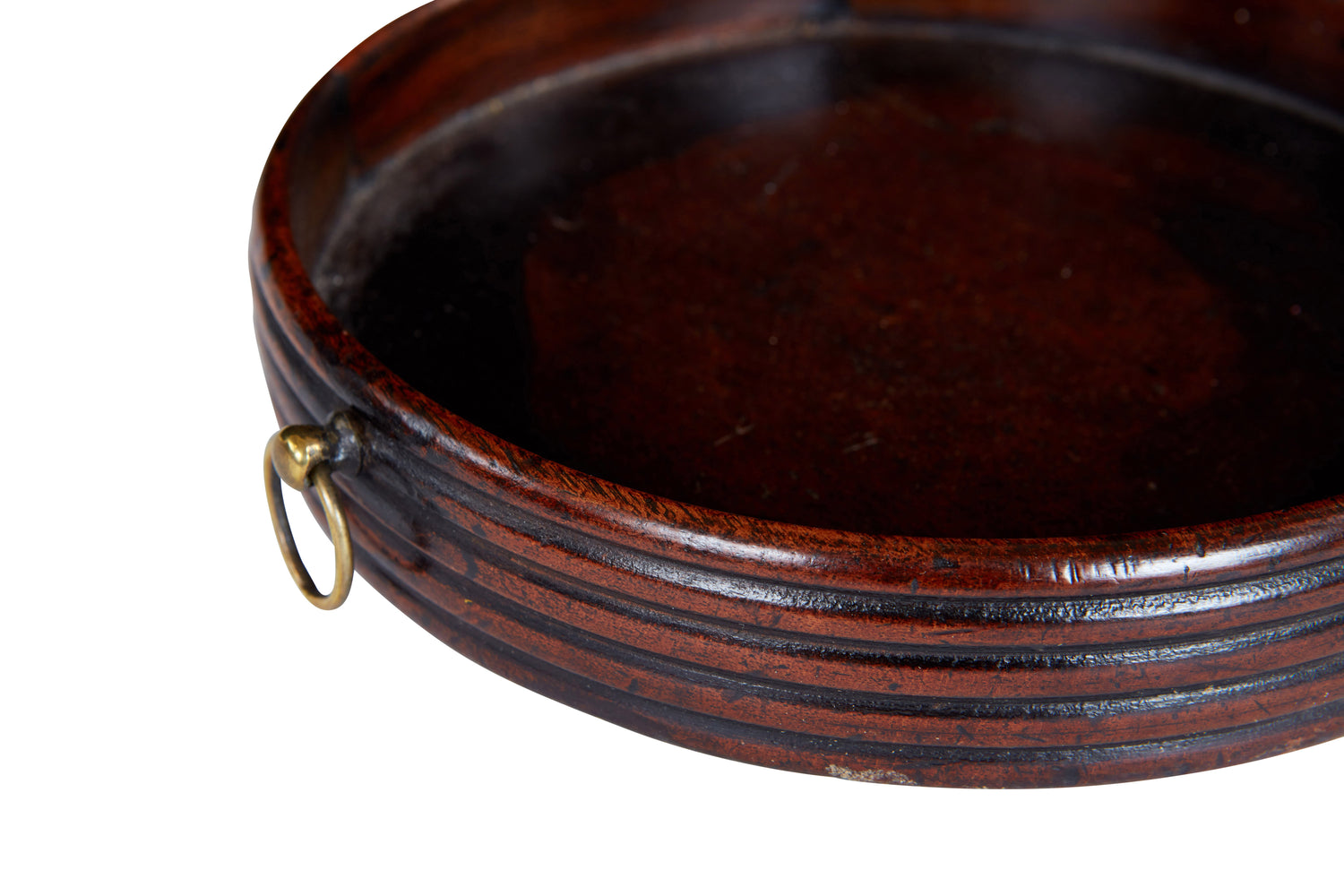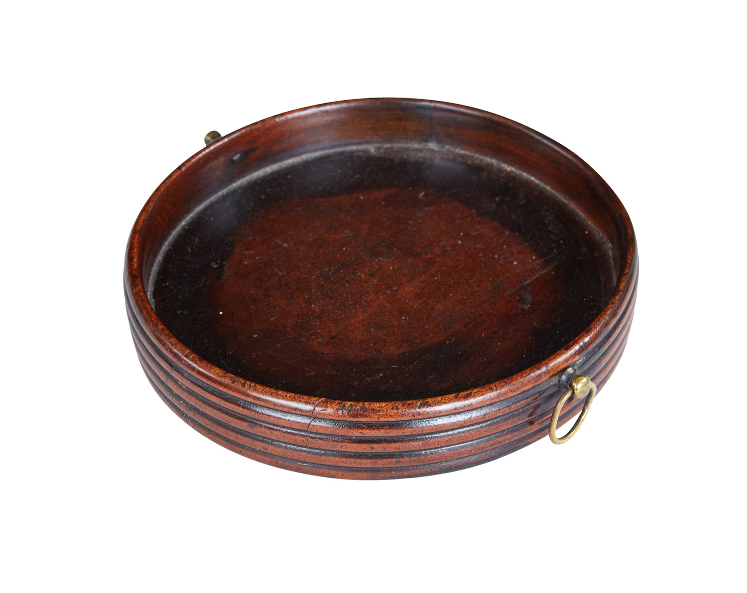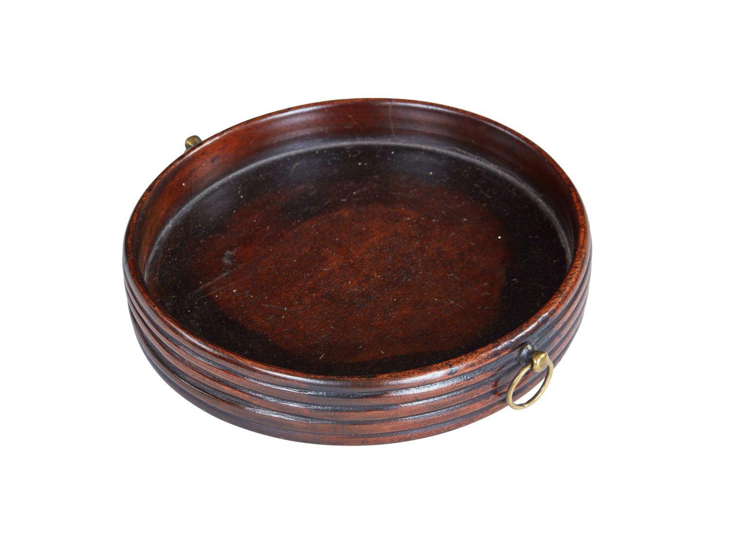 A fine mahogany wine coaster of substantial size have a raised mahogany rim with reeding and two small decorative brass rings. Circa 1800.Ht. 1 3/8”, W. 7 1/4”