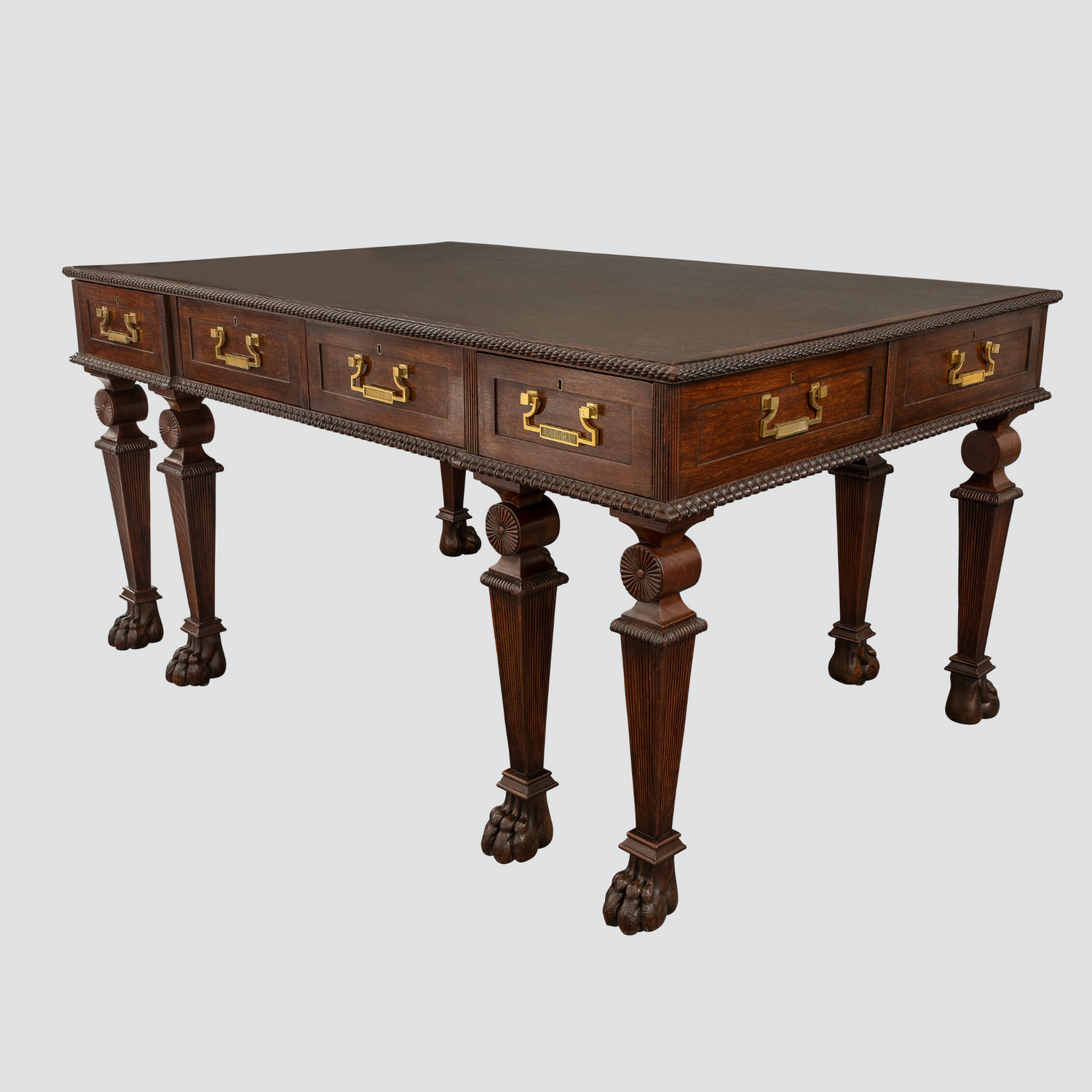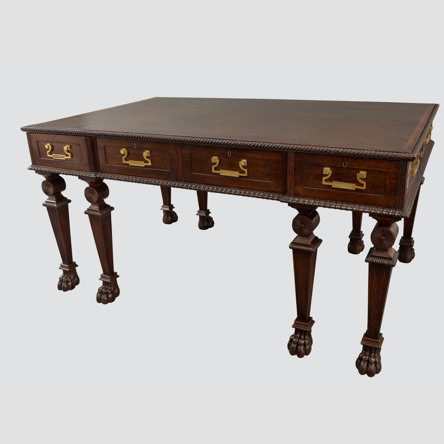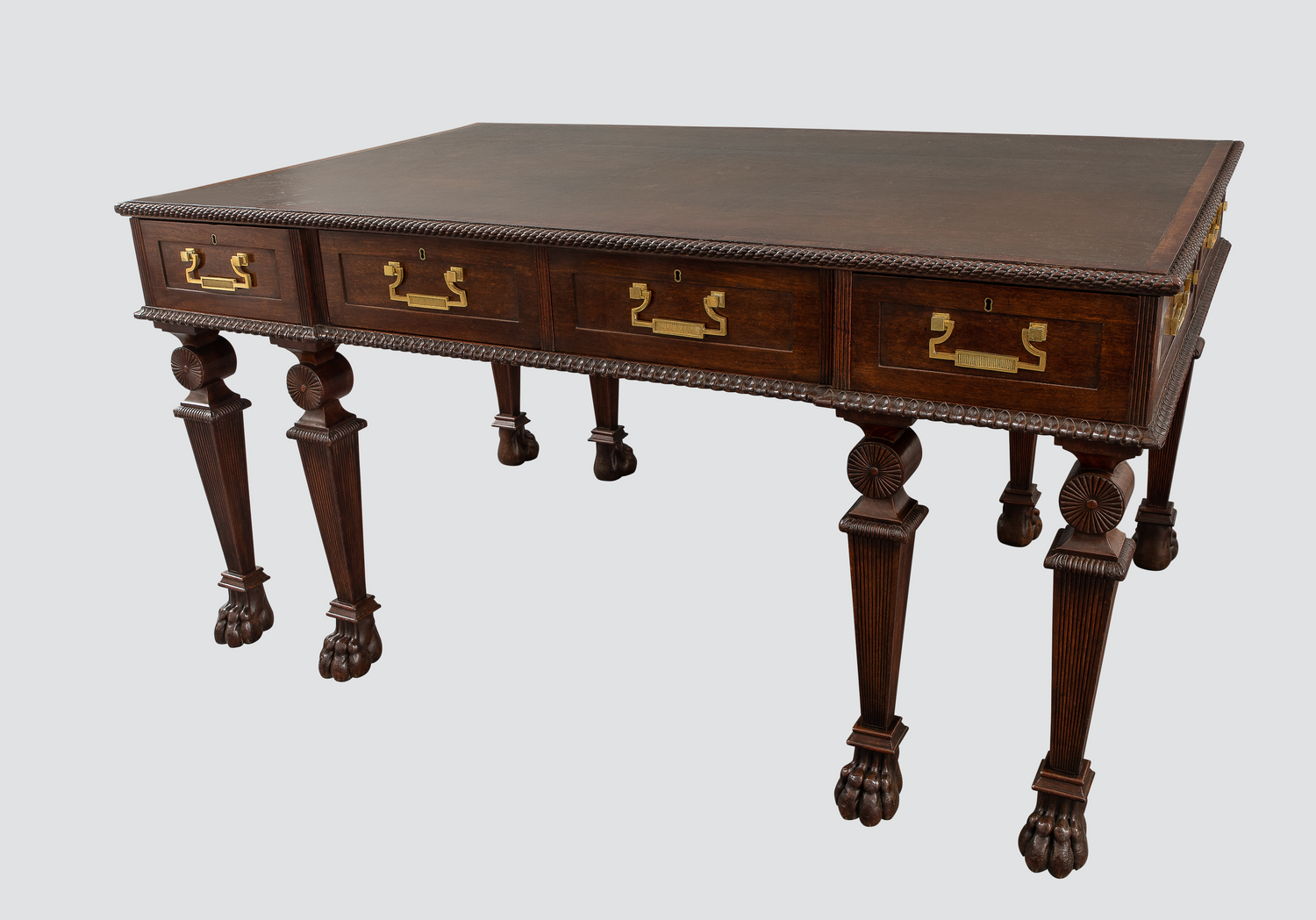 A rare Regency mahogany writing table in the manner of Thomas Hope having a banded inset leather top and a carved "rope twist" molding over a case with eight working drawers bordered at the base with lambs tongue molding of large scale on unusual carved legs comprised of geometric shapes of tapered caps over reeded roundels supported by tapered bases resting on tapered reeded legs terminating in claw feet with hidden casters. English circa 1810. Advertised by Mallett's of Bath in 1930. Thoe original gilded brass hardware to a design by Thomas Hope. Ht. 31.5", W. 61.5", d. 39.5"