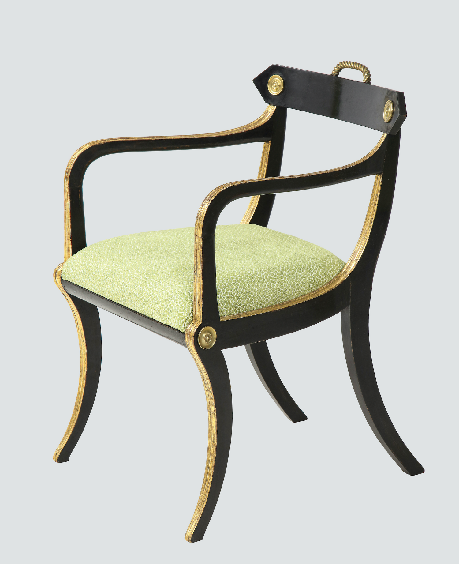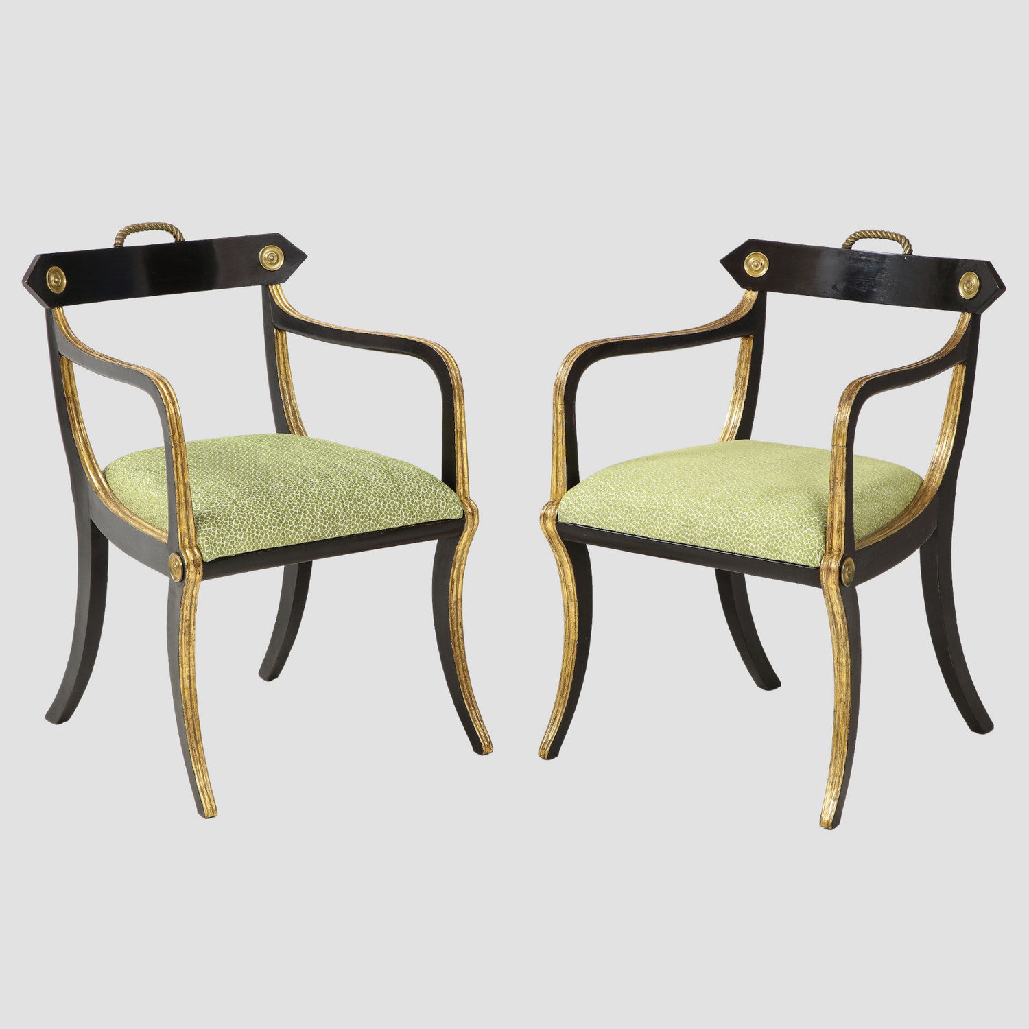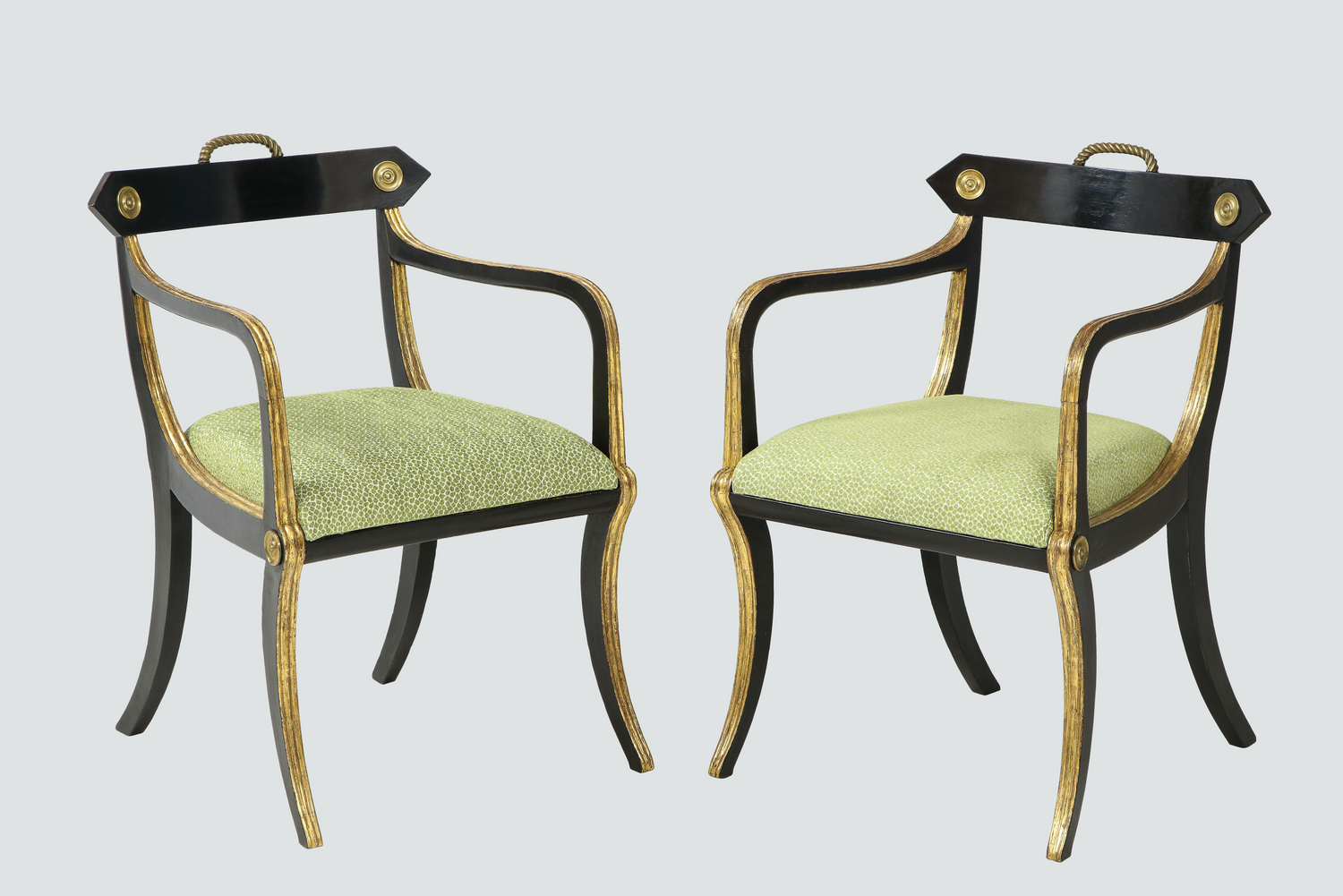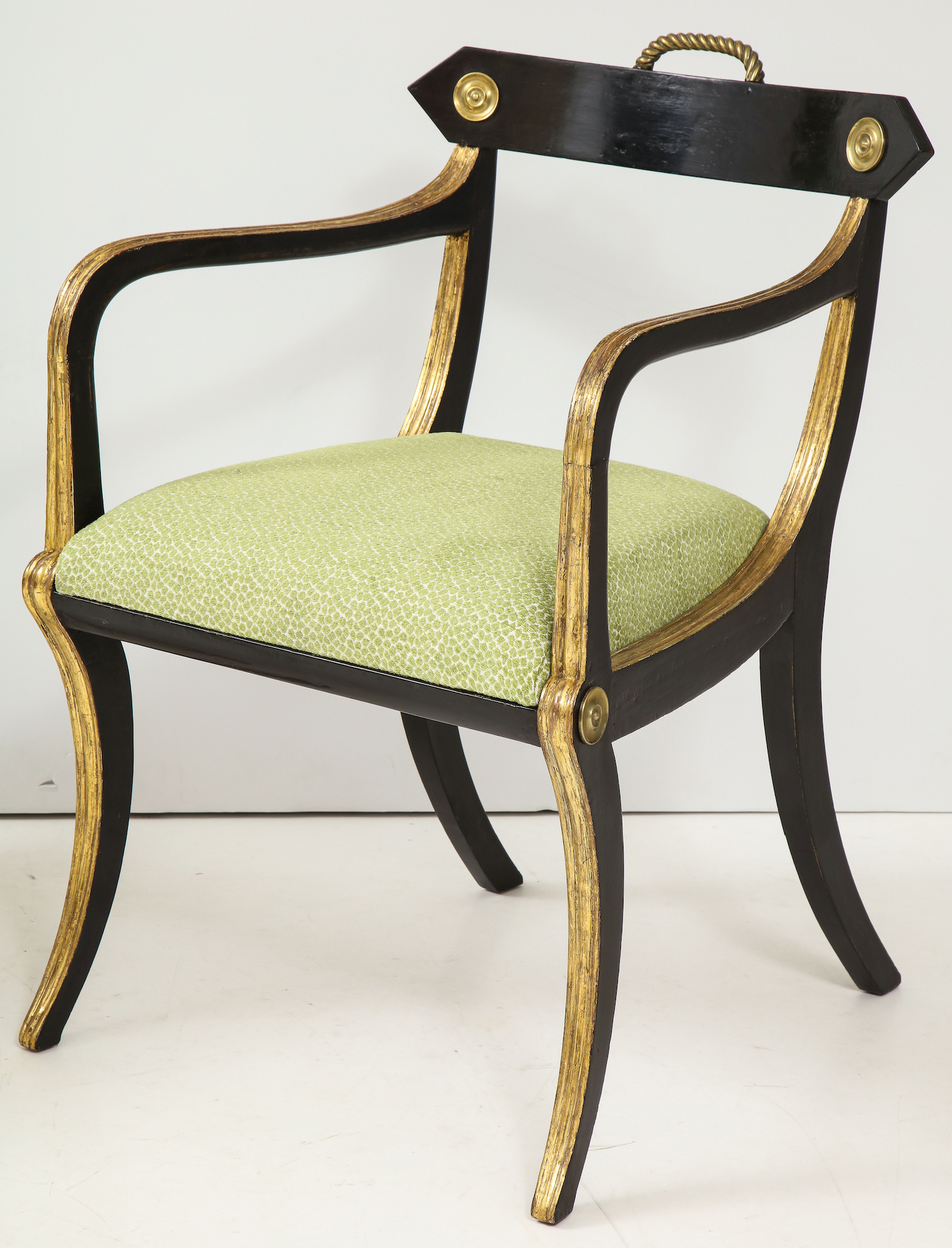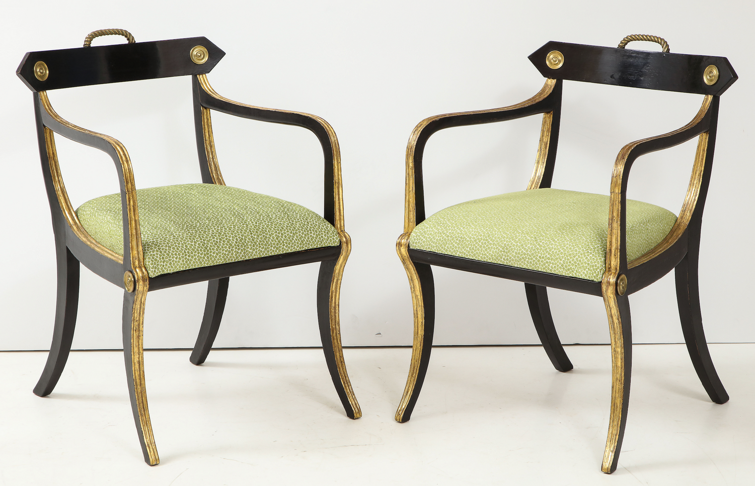 A pair of John Gee ebonized Regency armchairs with tablet backs affixed with brass rosettes and carrying handles having a drop in seat on saber legs. English circa 1815. Ht. 33.5"., Seat ht. 19", W. 22.5", D. 23.5" Painting and gilding refreshed.