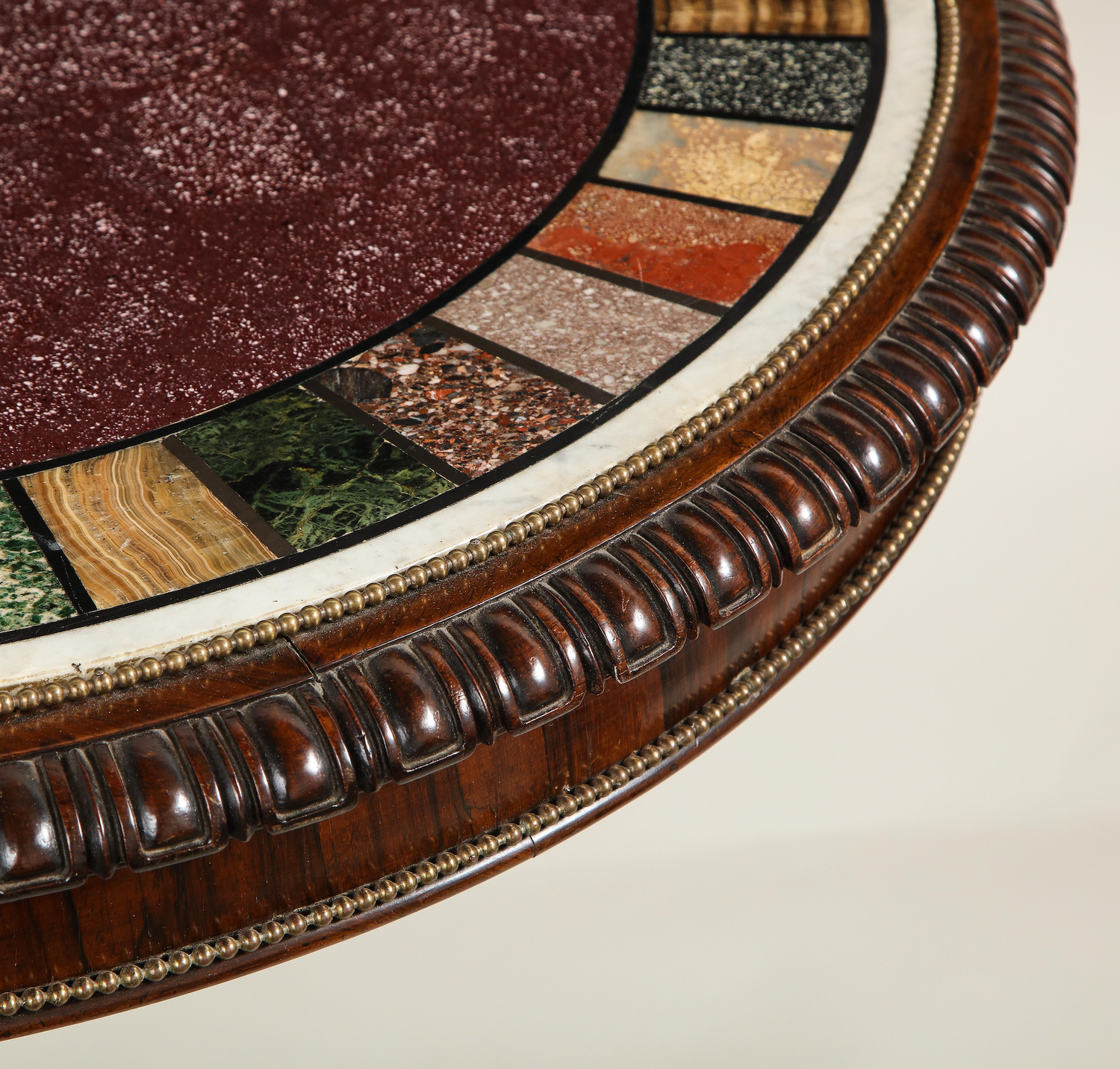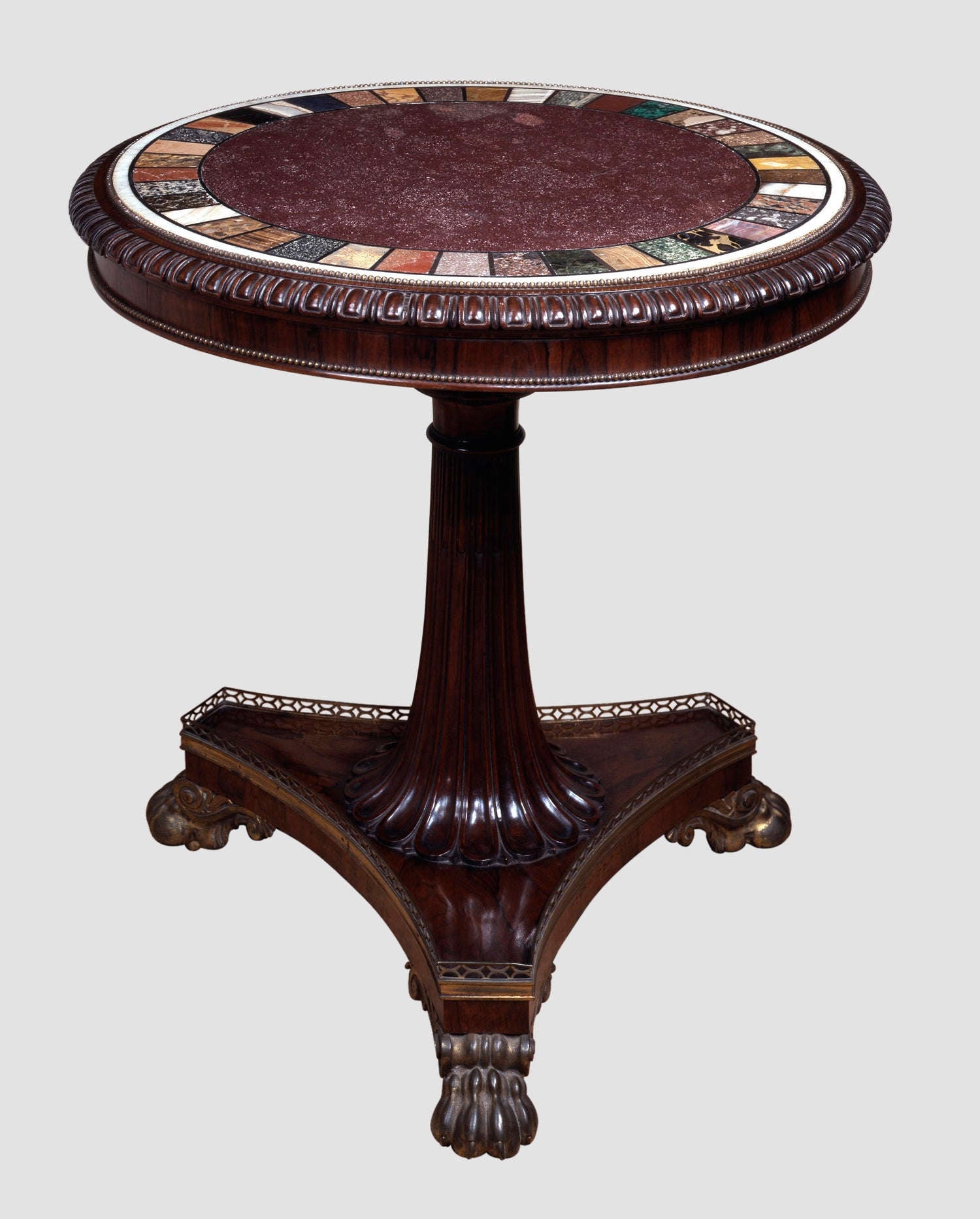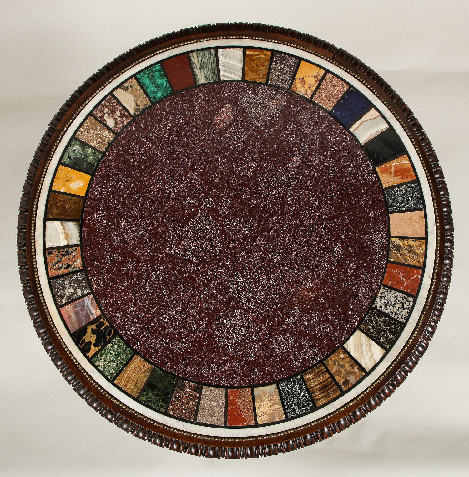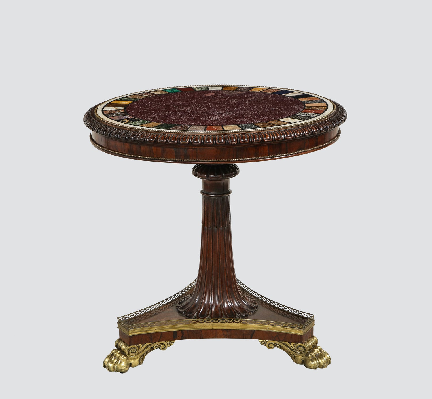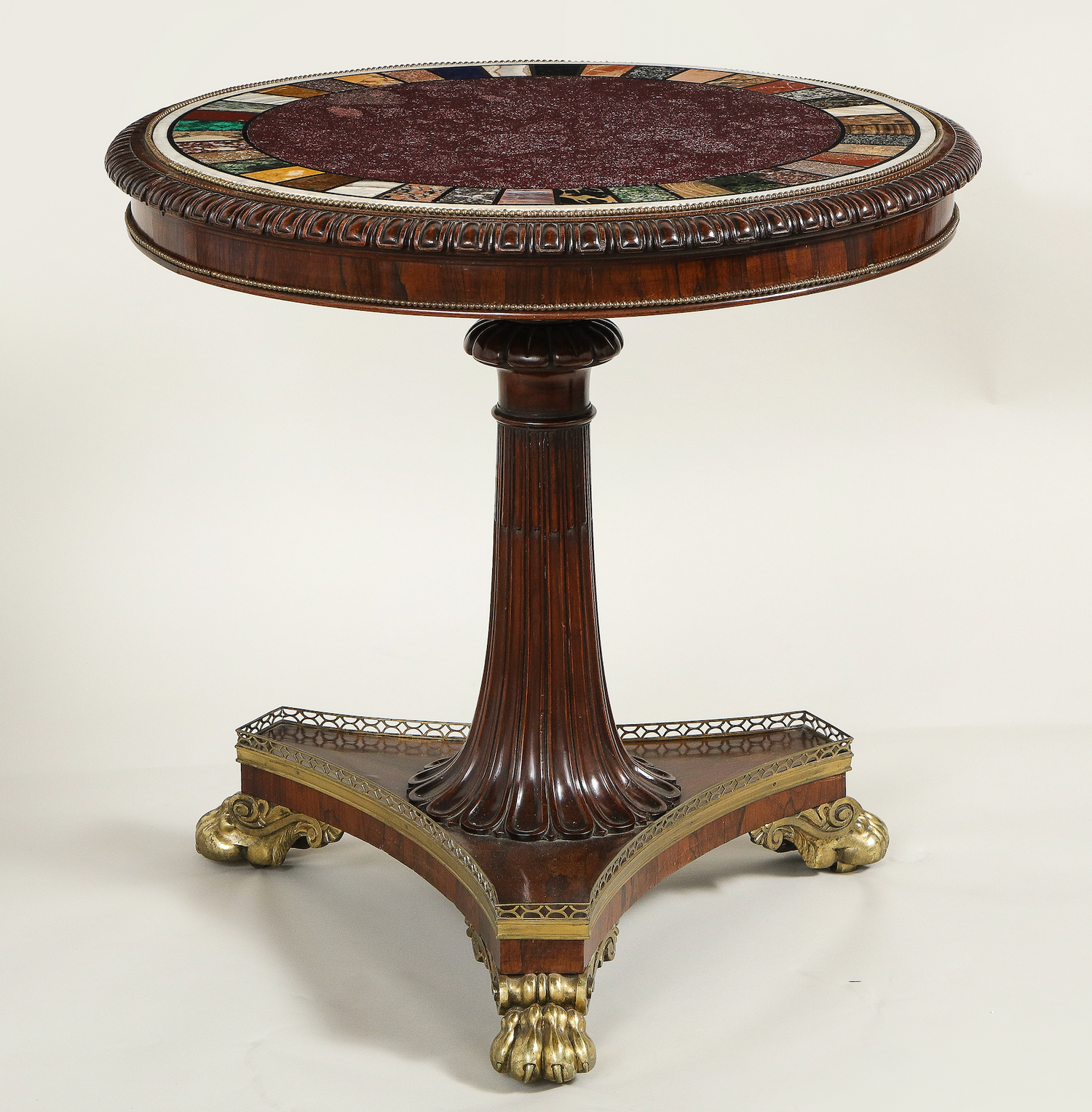 A rare specimen Regency marble top center table with specimen marbles banding an Egyptian porphyry center inset into a carved rosewood top resting on a single carved and reeded stem on a platform base supported by bronze feet. English circa 1815. Ht. 32.75", Dia. 34"