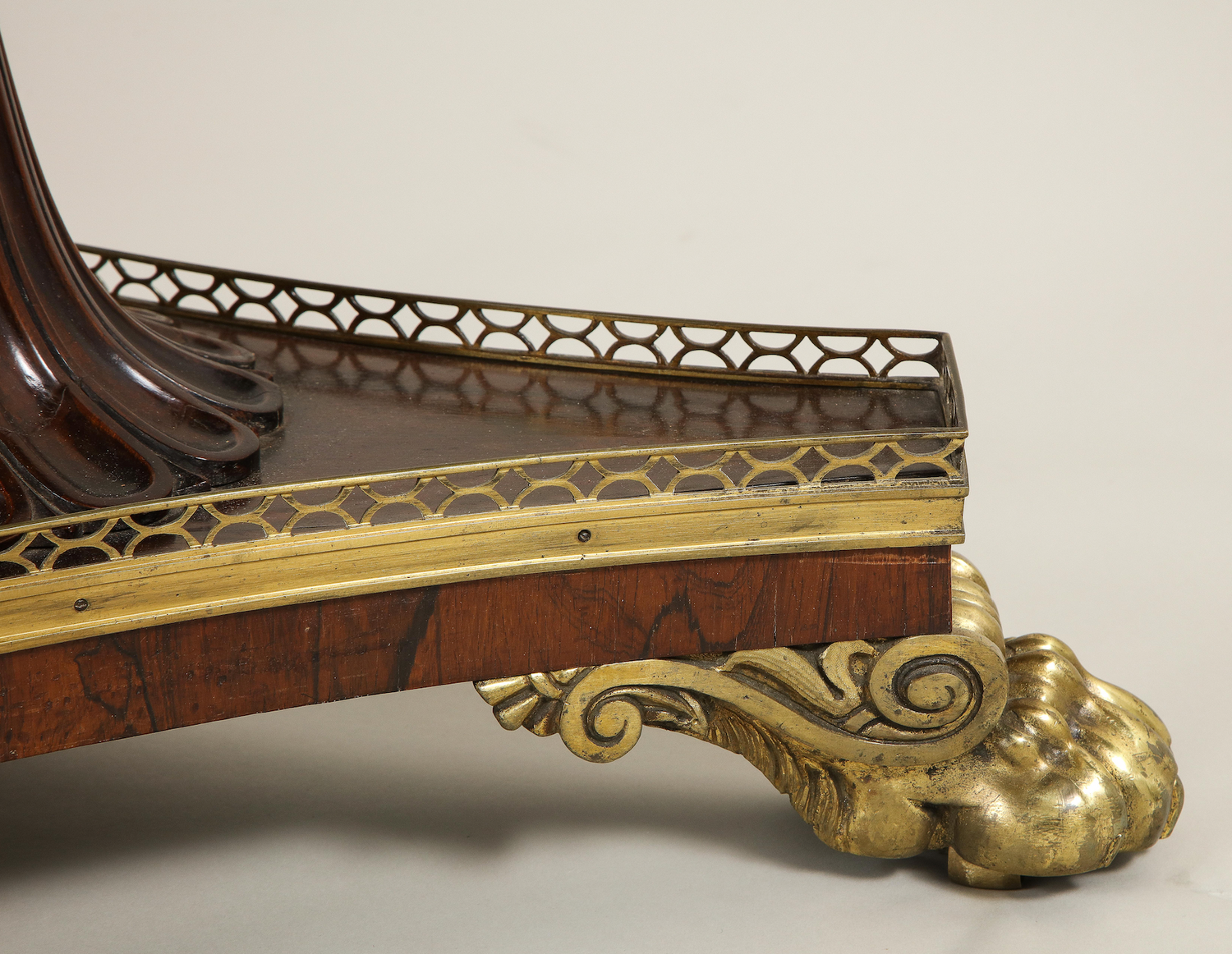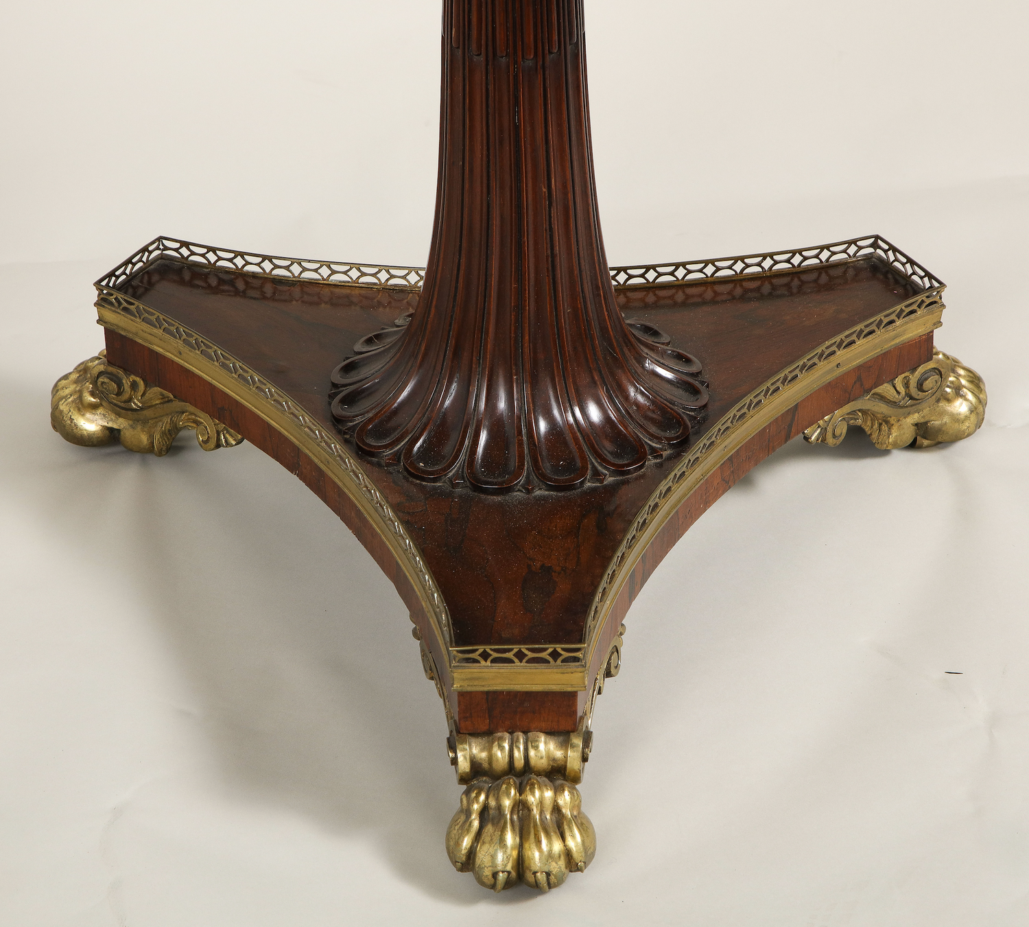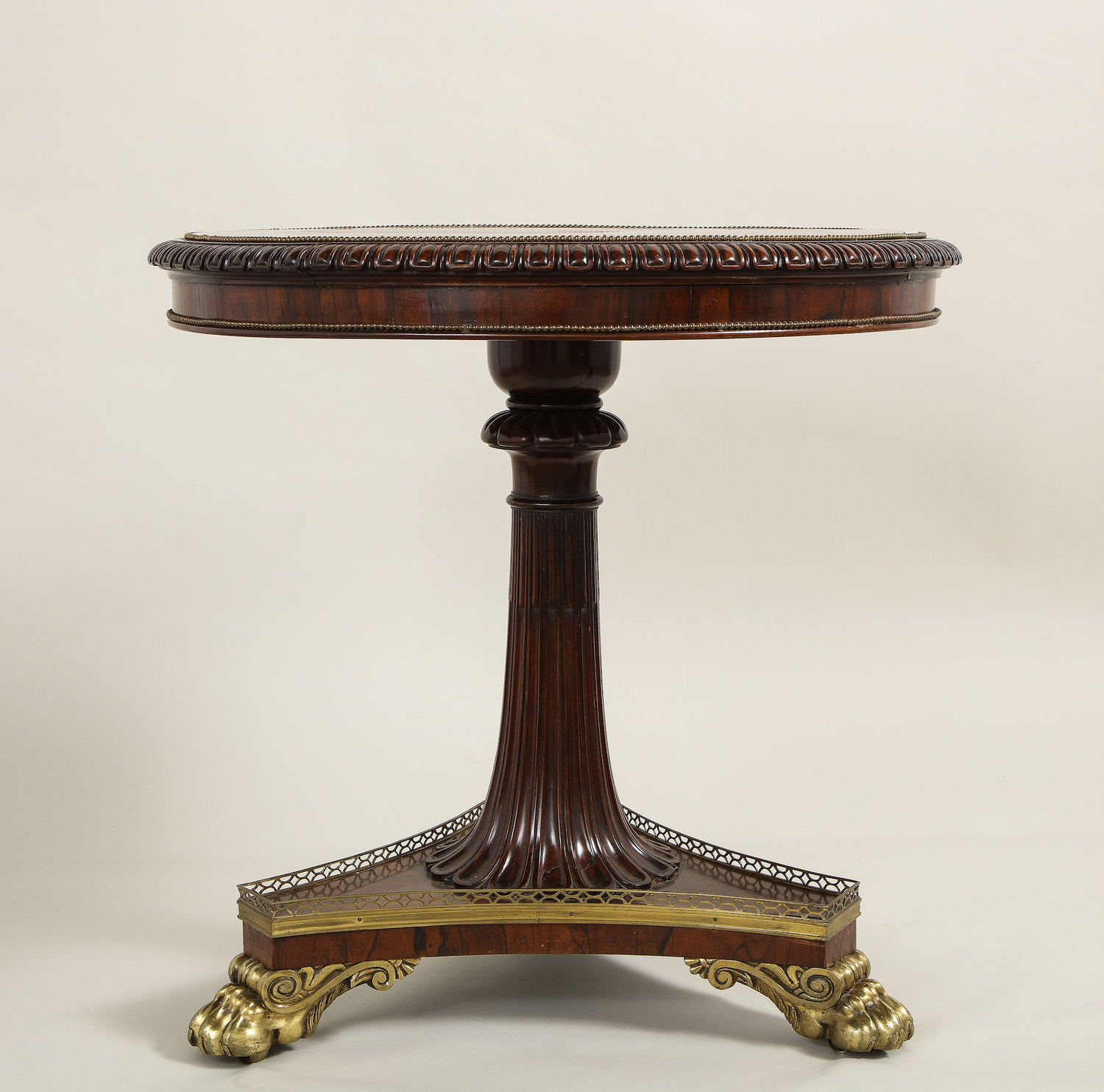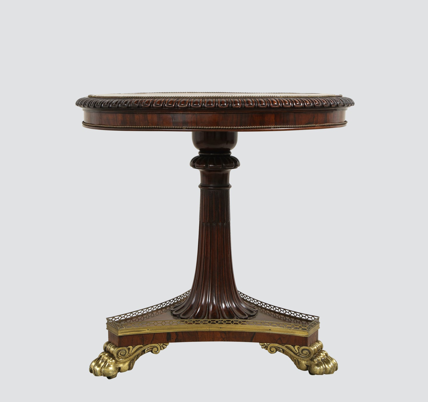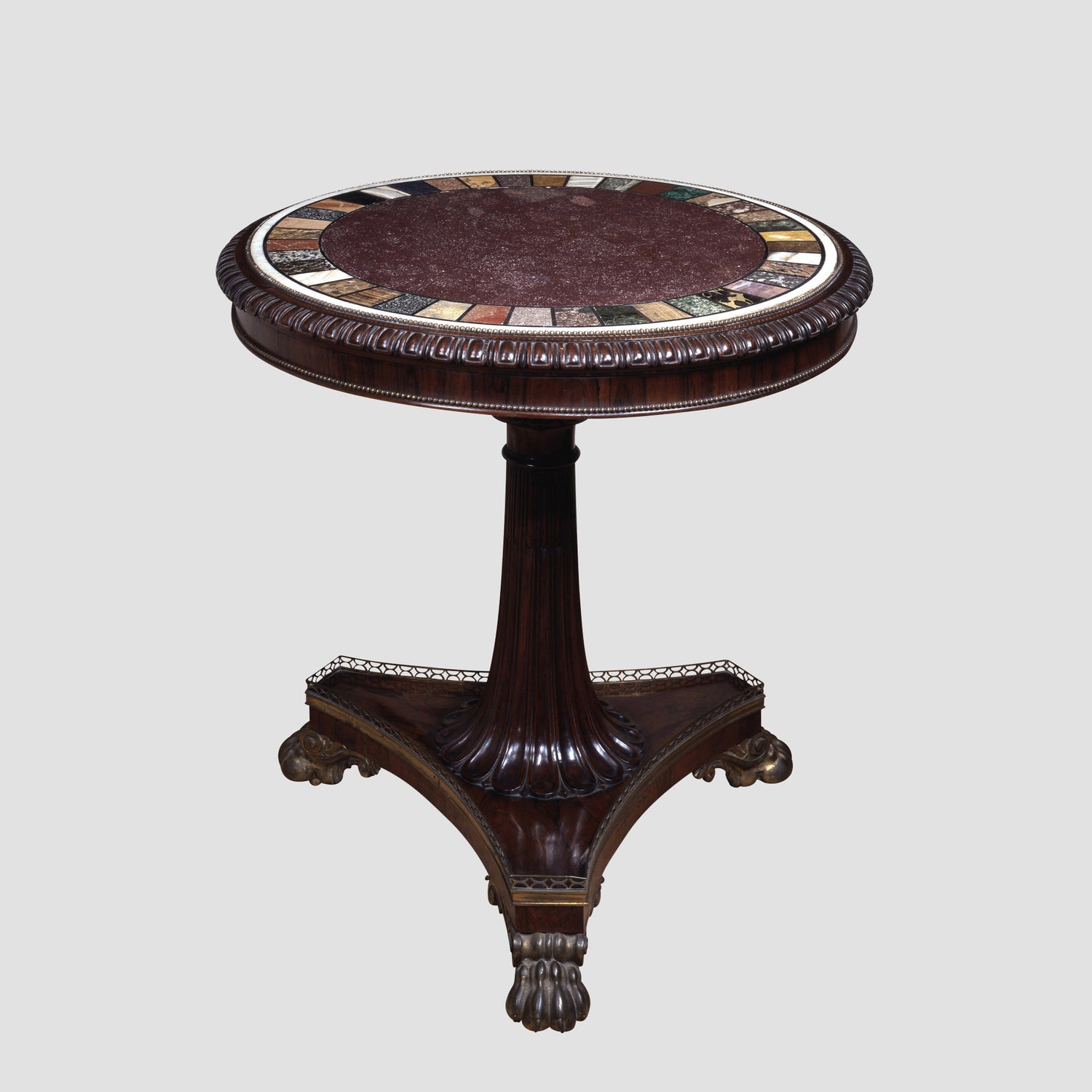A rare specimen Regency marble top center table with specimen marbles banding an Egyptian porphyry center inset into a carved rosewood top resting on a single carved and reeded stem on a platform base supported by bronze feet. English circa 1815. Ht. 32.75", Dia. 34"