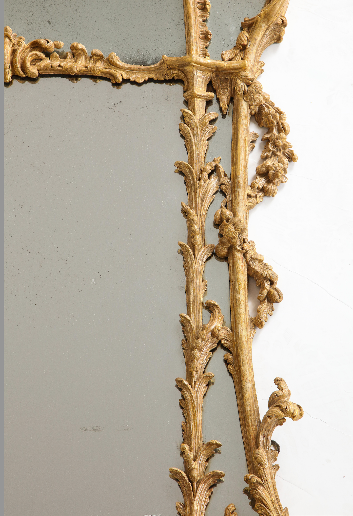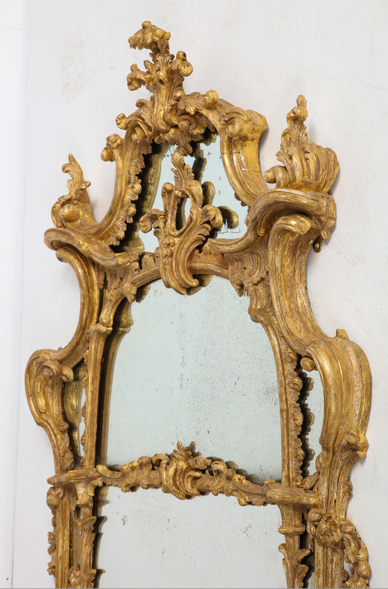 A superb carved and gilded rococo looking glass in the manner of John Linnell, crested by double s-scrolls holding an acanthus spray, the frame held by c and s-scrolls larded with carved leaves and rocaille with numerous plate glasses bordering the two central plates. An imposing and extraordinary rococo frame. Glass is 18th century but not original. Ht; 76", W. 38.5", D. 6" With restorations to the gilding.