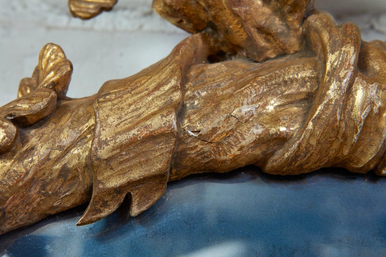 A finely carved oval rococo looking glass, the carving of intertwined branches with an oak leaf spray at the top, leaves on the sides, the branches tied with a bow at the base. A marvelous example of some of the more innovative rococo designs that can be found made between 1740-65. Re-gilded, but not recently. Ht. 32 3/4”, Width, 27 1/4”