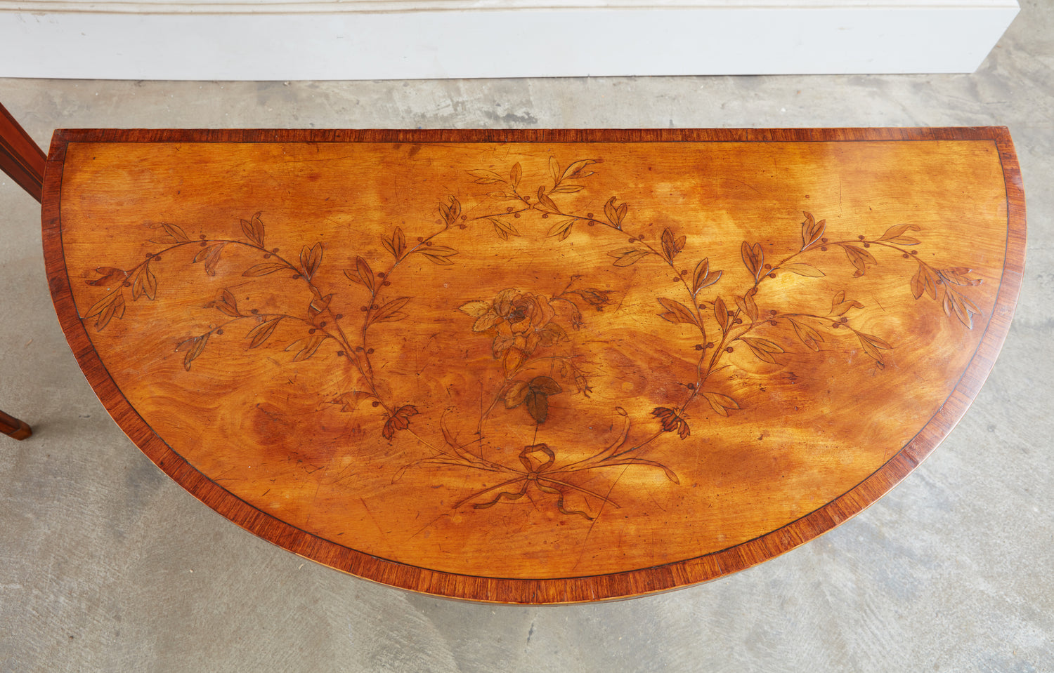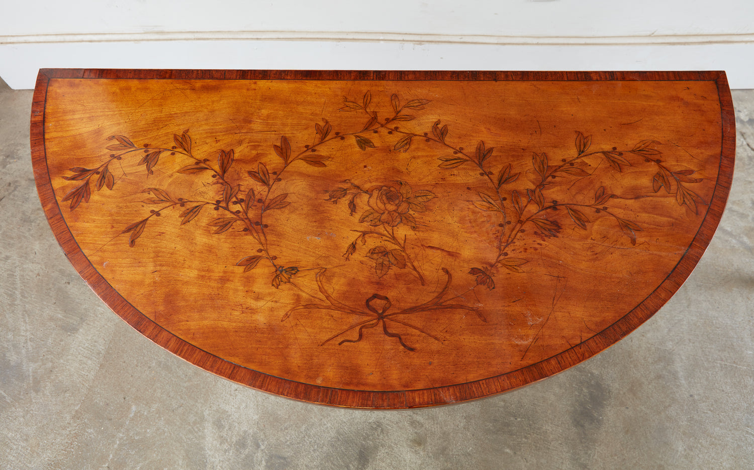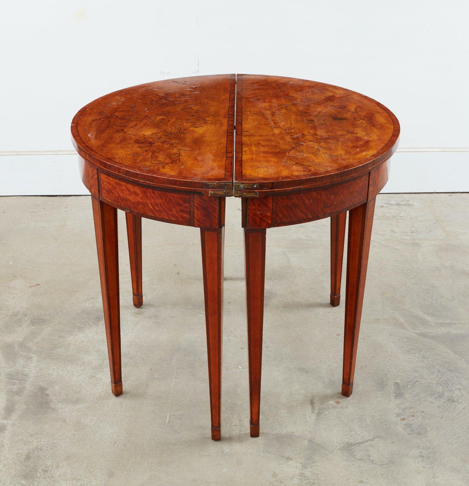 A very fine pair of satinwood demilune card tables circa 1775 having inlaid and banded tops over a plain banded frieze and banded square tapered legs, the back left legs on each table with knuckle joints allowing the leg to swing out and support the top. In the manner of John Linnell, the interiors, banded with baize. The subtle beauty of these tables resides in their exceptional timber and the fine quality tulipwood inlay. Ht. 29”, Width 38”, Depth 17 3/4”