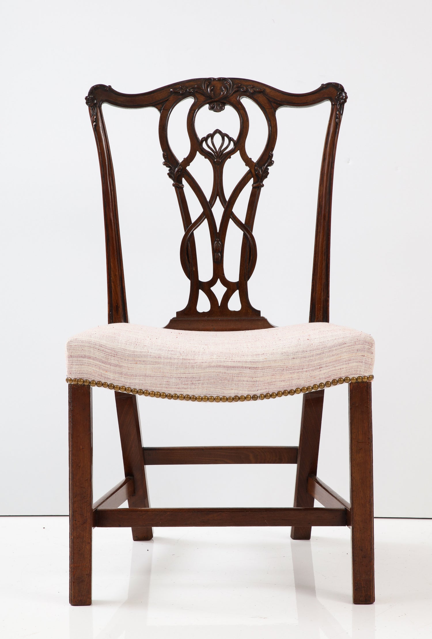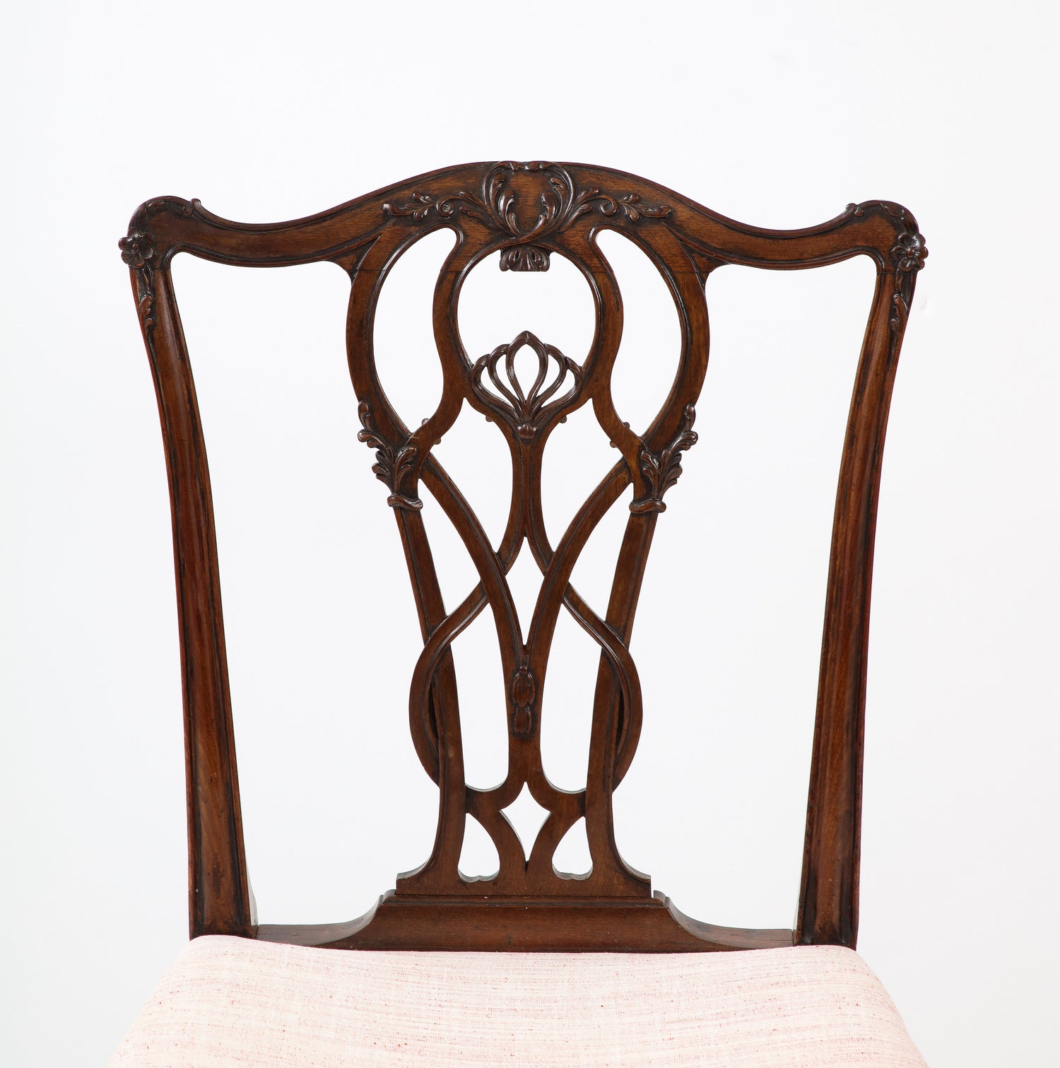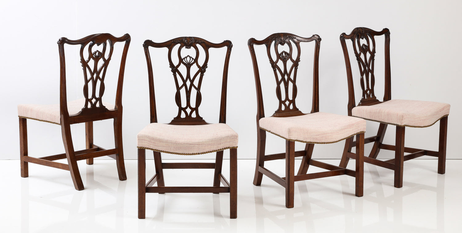 A superb set of four large scale English Chippendale dining chairs with finely carved crest rails and carved pierced splat back with upholstered saddle seats on squared molded legs with H-stretchers. Ex. coll. Frank Partridge & Sons, Ht. 38 3/4", Seat ht. 18", W. 21 3/4", D. 21 1/2"