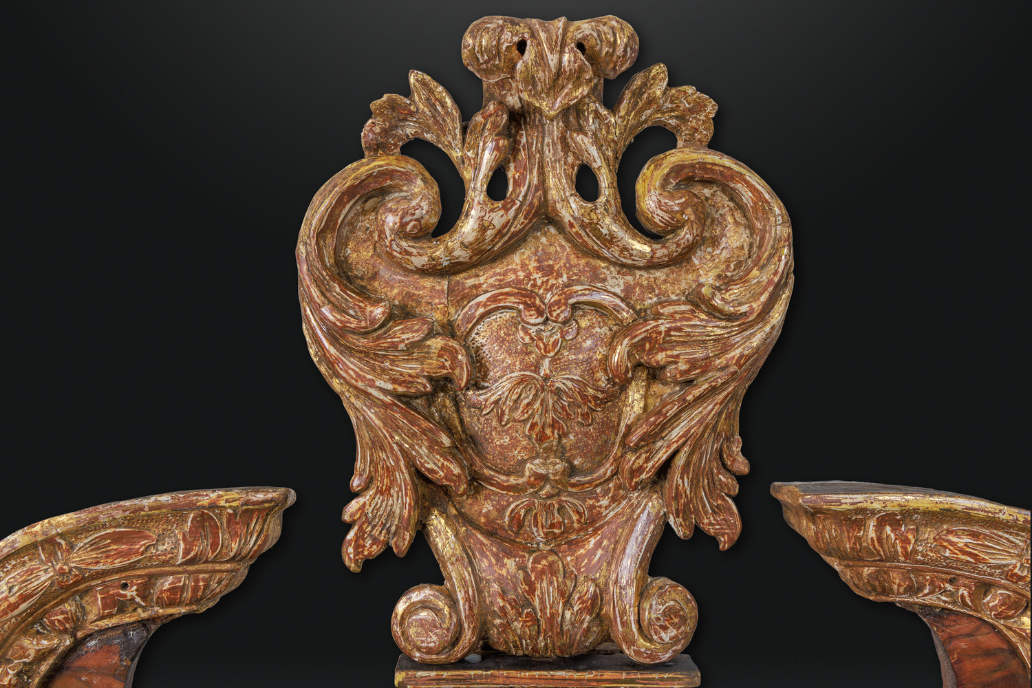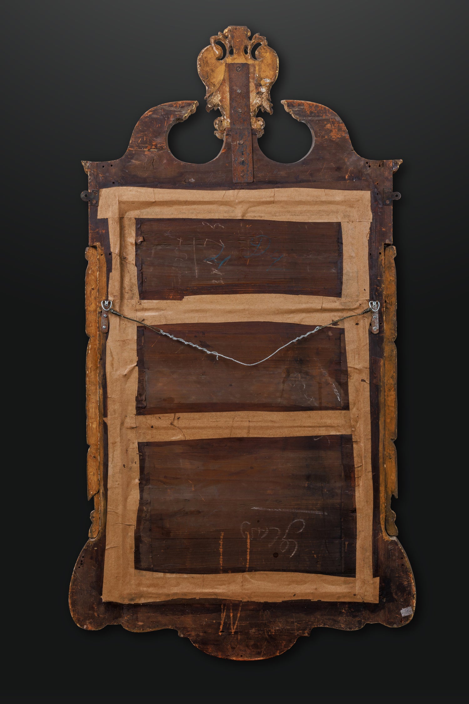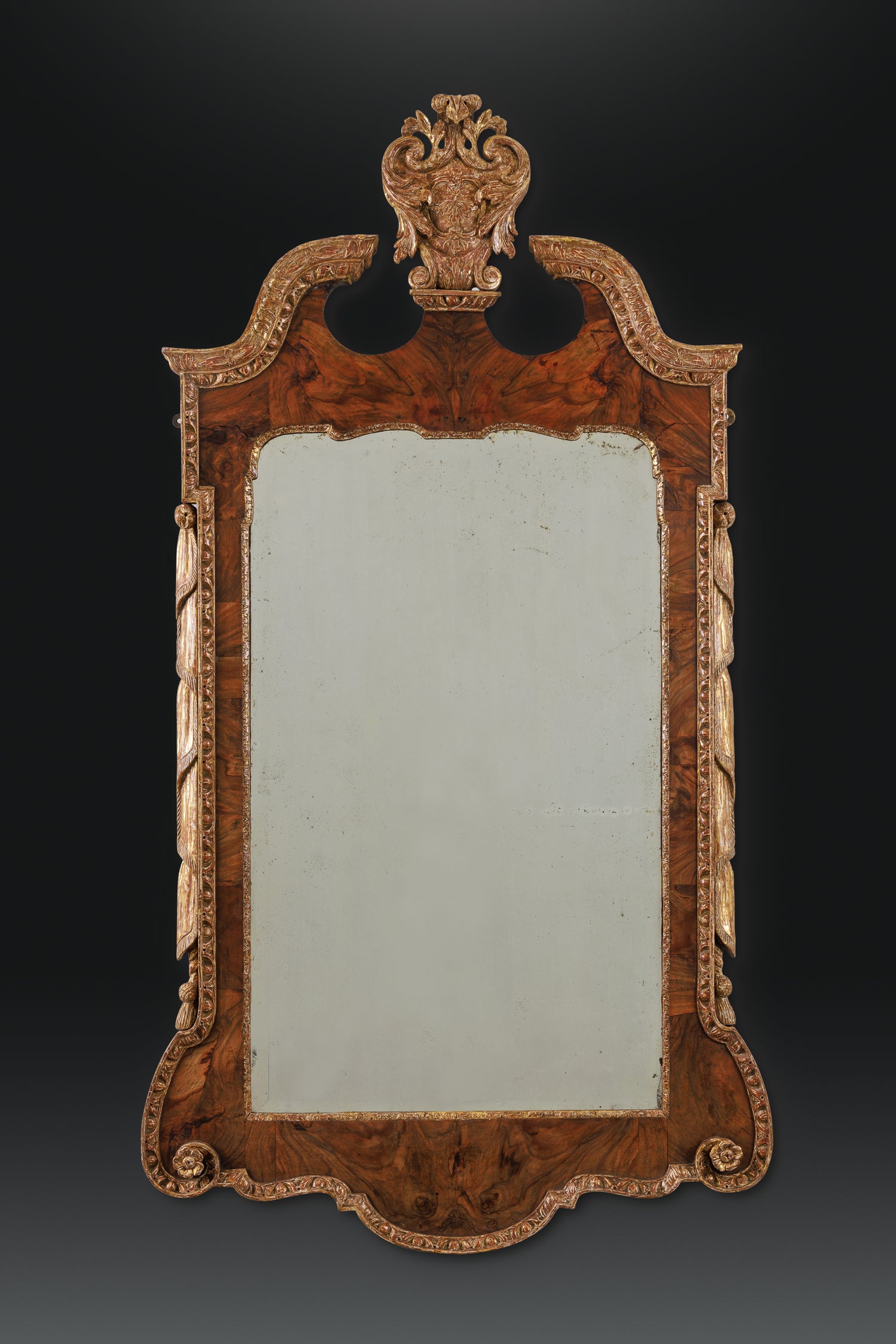 An English walnut and parcel gilt mirror of unusual design with superb color, the gilding dry stripped, with original mirror plate dating circa 1730 having a cartouche bracketed by a broken swan necked pediment, swags off the sides with egg and dart molding on the outer frame, the inner frame next to the glass with leaf carving. Ht. 56 1/2", Width 30 1/2", Depth 3" Ex. Coll. Philadelphia Museum of Art