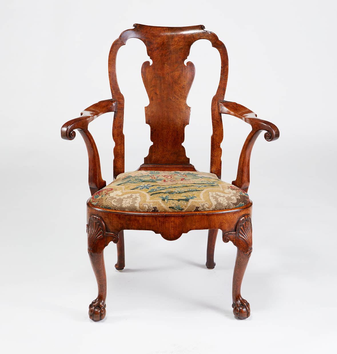 A superb and large scale English walnut open armchair with excellent color having a shaped crest rail, solid splat back with outward scrolled arms terminating in scrolls with veneered rails having cabriole legs in the front with carved shells terminating in ball and claw feet with a drop in needlework seat with 18th century needlepoint, restored and cut from a larger section. One block replaced. Circa 1740. Ht. 39", Width 30", Depth 20", Seat ht. 19"
