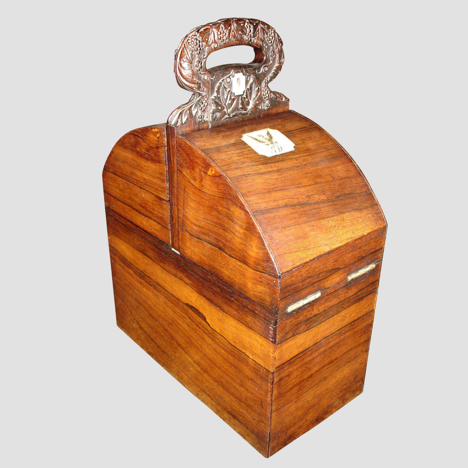 A wine tantalus of unusual form with a carved handle. labelled H.L. Goertz, suppliers to "Their Majesties", No. 26, High St. Windsor. Englsih circa 1860. Ht.17.25", W. 13", d. 6.5"